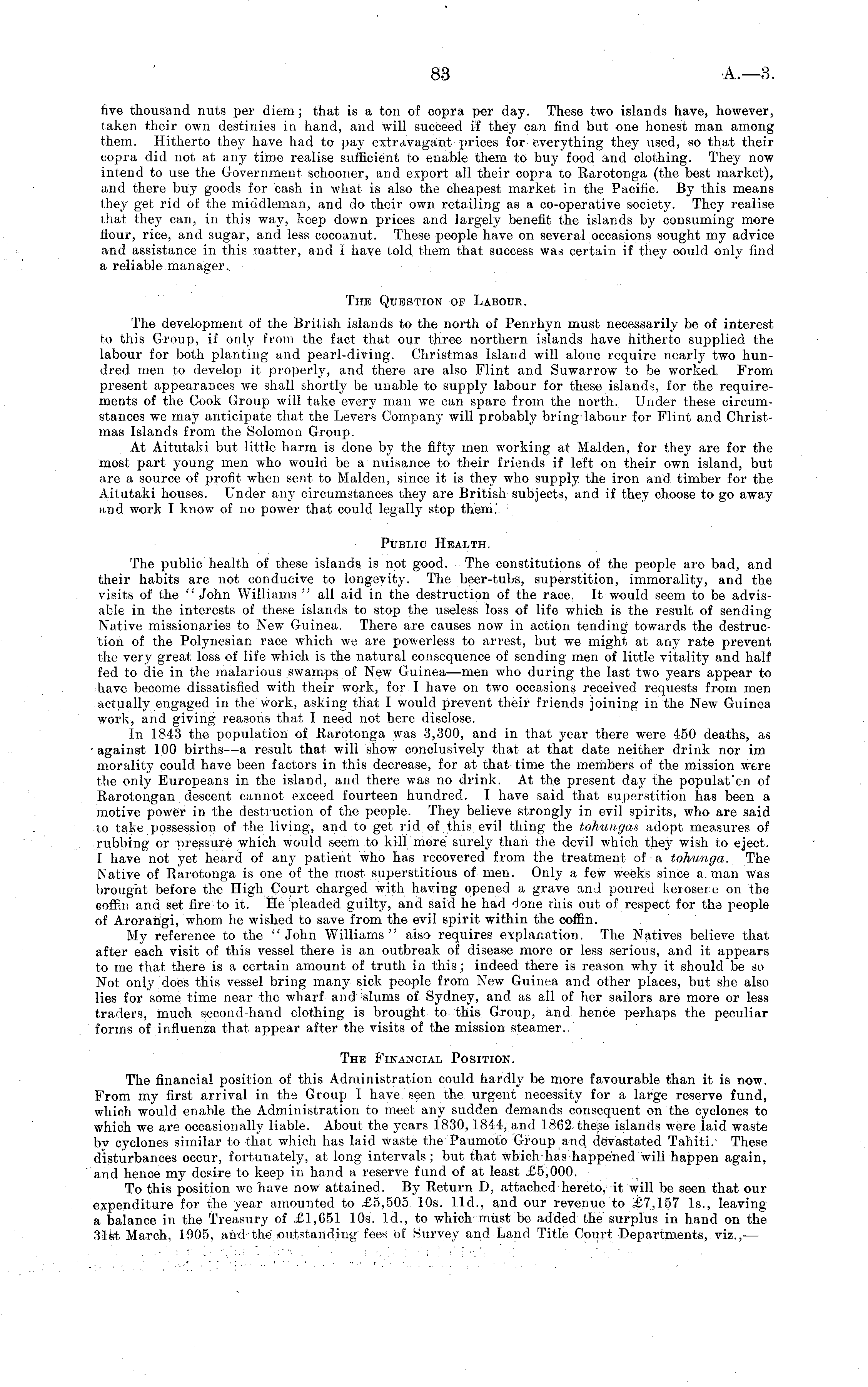 five thousand nuts per diem; that is a ton of copra per day. These two islands have, however, taken their own destinies in hand, and will succeed if they can find but one honest man among them. Hitherto they have had to pay extravagant prices for everything they used, so that their copra did not at any time realise sufficient to enable them to buy food and clothing. They now intend to use the Government schooner, and export all their copra to Rarotonga (the best market), and there buy goods for cash in what is also the cheapest market in the Pacific. By this means they get rid of the middleman, and do their own retailing as a co-operative society. They realise that they can, in this way, keep down prices and largely benefit the islands by consuming more flour, rice, and sugar, and less cocoanut. These people have on several occasions sought my advice and assistance in this matter, and I have told them that success was certain if they could only find a reliable manager. The Question of Labour. The development of the British islands to the north of Penrhyn must necessarily be of interest to this Group, if only from the fact that our three northern islands have hitherto supplied the labour for both planting and pearl-diving. Christmas Island will alone require nearly two hundred men to develop it properly, and there are also Flint and Suwarrow to be worked. From present appearances we shall shortly be unable to supply labour for these islands, for the requirements of the Cook Group will take every man we can spare from the north. Under these circumstances we may anticipate that the Levers Company will probably bring labour for Flint and Christmas Islands from the Solomon Group. At Aitutaki but little harm is done by the fifty men working at Maiden, for they are for the most part young men who would be a nuisance to their friends if left on their own island, but are a source of profit when sent to Maiden, since it is they who supply the iron and timber for the Aitutaki houses. Under any circumstances they are British subjects, and if they choose to go away and work I know of no power that could legally stop them.' Public Health. The public health of these islands is not good. The constitutions of the people are bad, and their habits are not conducive to longevity. The beer-tubs, superstition, immorality, and the visits of the " John Williams " all aid in the destruction of the race. It would seem to be advisable in the interests of these islands to stop the useless loss of life which is the result of sending Native missionaries to New Guinea. There are causes now in action tending towards the destruction of the Polynesian race which we are powerless to arrest, but we might at any rate prevent the very great loss of life which is the natural consequence of sending men of little vitality and half fed to die in the malarious swamps of New Guinea—men who during the last two years appear to have become dissatisfied with their work, for I have on two occasions received requests from men actually engaged in the work, asking that I would prevent their friends joining in the New Guinea work, and giving reasons that I need not here disclose. In 1843 the population of Rarotonga was 3,300, and in that year there were 450 deaths, as ■against 100 births —a result that will show conclusively that at that date neither drink nor im morality could have been factors in this decrease, for at that time the members of the mission were the only Europeans in the island, and there was no drink. At the present day the populafcn of Rarotongan descent cannot exceed fourteen hundred. I have said that superstition has been a motive power in the destruction of the people. They believe strongly in evil spirits, who are said to take possession of the living, and to get rid of this evil thing the tohungas adopt measures of rubbing or pressure which would seem to kill more surety than the devil which they wish to eject. I have not yet heard of any patient who has recovered from the treatment of a tohunga. The Native of Rarotonga is one of the most superstitious of men. Only a few weeks since a. man was brought before the High Court charged with having opened a grave and poured keiosere on the Goffiii and set fire to it. He pleaded guilty, and said he had done this out of respect for the people of Arorangi, whom he wished to save from the evil spirit within the coffin. My reference to the "John Williams" also requires explanation. The Natives believe that after each visit of this vessel there is an outbreak of disease more or less serious, and it appears to me that there is a certain amount of truth in this; indeed there is reason why it should be so Not only does this vessel bring many sick people from New Guinea and other places, but she also lies for some time near the wharf and slums of Sydney, and as all of her sailors are more or less traders, much second-hand clothing is brought to this Group, and hence perhaps the peculiar forms of influenza that appear after the visits of the mission steamer. The Financial Position. The financial position of this Administration could hardly be more favourable than it is now. From my first arrival in the Group I have seen the urgent necessity for a large reserve fund, which would enable the Administration to meet any sudden demands consequent on the cyclones to which we are occasionally liable. About the years 1830,1844, and 1862 these islands were laid waste by cyclones similar to that which has laid waste the Paumoto Group and devastated Tahiti. These disturbances occur, fortunately, at long intervals; but that whichhas happened will happen again, and hence my desire to keep in hand a reserve fund of at least £5,000. To this position we have now attained. By Return D, attached hereto, it will be seen that our expenditure for the year amounted to £5,505 10s. lid., and our revenue to £7,157 Is., leaving a balance in the Treasury of £1,651 10s. Id., to which must be added the 
