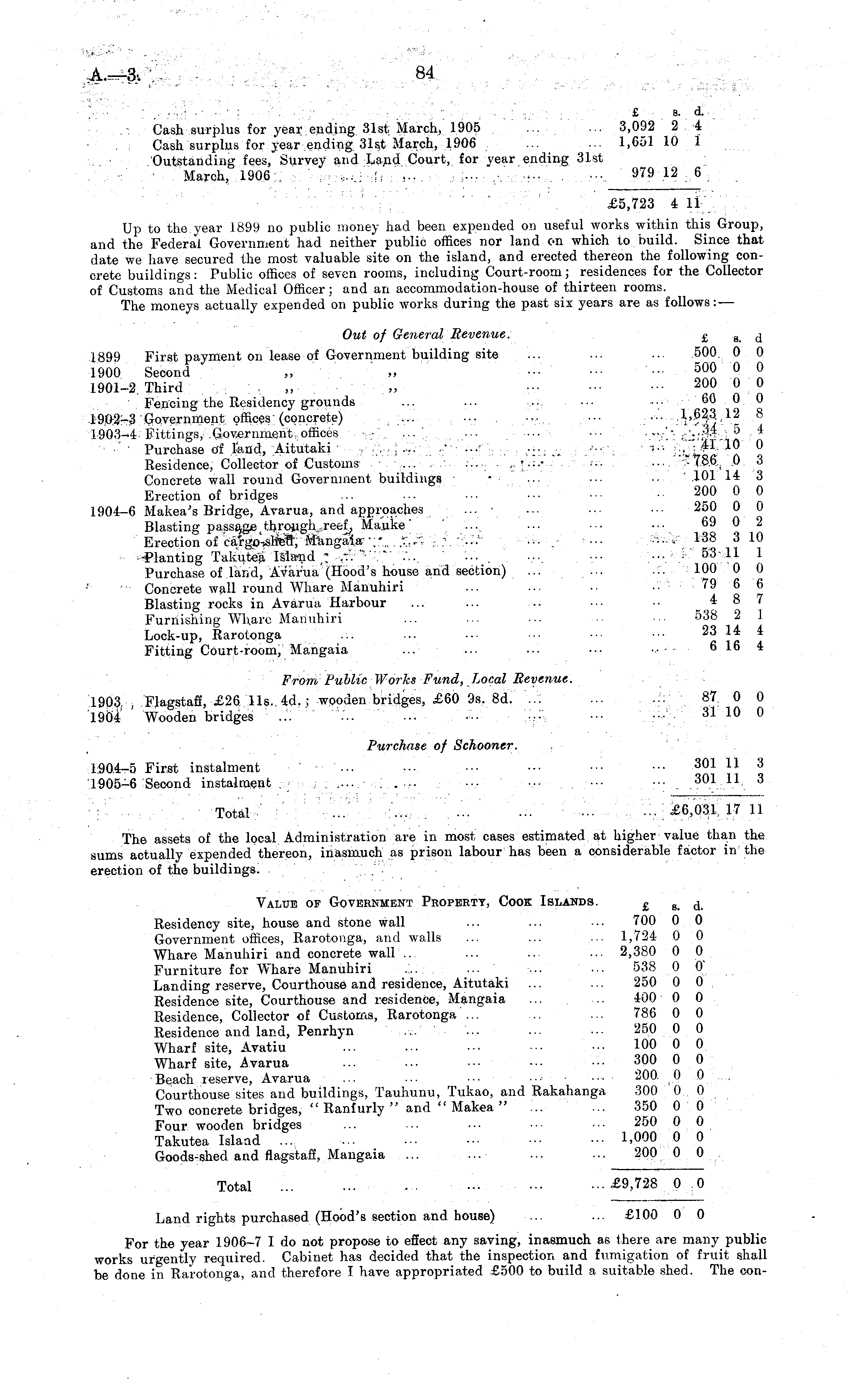 ;....: £ s. d. Cash surplus for year ending 31st March, 1905 ... ... 3,092 2 4 Cash surplus for year ending-31st March, 1906 ... ... 1,65110 1 Outstanding fees, Survey and Land Court, for year ending 31st March, 1906 .... . : ... ... .-. -•• , ■••. 979 12 6 £5,723 4 11 Up to the year 1899 no public money had been expended on useful works within this Group, and the Federal Government had neither public offices nor land on which to build. Since that date we have secured the most valuable site on the island, and erected thereon the following concrete buildings: Public offices of seven rooms, including Court-room; residences for the Collector of Customs and the Medical Officer; and an accommodation-house of thirteen rooms. The moneys actually expended on public works during the past six years are as follows:— Out of General Revenue. £ s j 1899 First payment on lease of Government building site ... ... ... 500 0 0 1900 Second „ „ ••• ••• "••'■ 500 ° ° 1901-2 Third , „ „ 200 0 0 Fencing the Residency grounds ... ... ..... •■■ ... 60 0 0 19,02-3 Government offices (concrete) ... ... ••• ••■ ••• 623 , \% 8 1903-4 Fittings, Government offices ... \ . ... ••■ ■•.-,. jj Purchase of fend, Aitutaki ■ , ~.. .-.. .-■ ...' ■■■ ■■■ ■•• ~ 41 10 0 Residence, Collector of Customs .... ... ... ■■ ... : 786 0 3 Concrete wall round Government buildings • ... ■■• ■• 101 14 3 Erection of bridges ... ... •■• ••■ ■■■ • 200 ° ° 1904-6 Makea's Bridge, Avarua, and approaches ... • ... ... •■■ 250 0 0 Blasting passage through reef, Mauke ' ... ... ■■• •■• 69 0 2 Erection of cargo-shed, Mangaia \ .'••• ••• •■• . ••• "■■ - 310 Planting Takutea Island ; ... ... •■• . ..... •■• .... 53 11 1 Purchase of land, Avarua (Hood's house and section) ... ... ... 100 0 0 Concrete wall round Whare Manuhiri ... ... •• •• ■ 79 6 6 Blasting rocks in Avarua Harbour ... ... -- •■• •■ _, 48 Furnishing Wharc Manuhiri ... ... ... ■•• •■■ 538 2 1 Lock-up, Rarotonga ... ... ■•• ■•• ■•• ••• 23 14 4 Fitting Court-room, Mangaia ... ... ■•• ••■ •■ 6 16 4 From, Public Works Fund, Local Revenue. 1903 Flagstaff, £26 11s.. 4d.; wooden bridges, £60 9s. Bd. ... 87. 0 0 1904 Wooden bridges ..: ... •■• ••• ••• ••• •■■ 31 10 ° Purchase of Schooner. 1904-5 First instalment ... ... ■•• ••■ ••• ■•• 301 n 3 1905-6 Second instalment. ... i ... ■■• ■■■ ••• ••■ 301 n 3 Total ... ... . ... ... ••• ...£6,031 17 11 The assets of the local Administration are in most cases estimated at higher value than the sums actually expended thereon, inasmuch as prison labour has been a considerable factor in the erection of the buildings. Value of Government Property, Cook Islands. £ g d Residency site, house and stone wall ... ... ... 700 0 0 Government offices, Rarotonga, and walls ... ... ... 1,724 0 0 Whare Manuhiri and concrete wall .. ... ... ... 2,380 0 0 Furniture for Whare Manuhiri ... ... ;.... ... 538 0 0 Landing reserve, Courthouse and residence, Aitutaki ... ... 250 0 0 Residence site, Courthouse and residence, Mangaia ... ... 400 0 0 Residence, Collector of Customs, Rarotonga ... .. ... 786 0 0 Residence and land, Penrhyn ... ... ... ■•• 250 0 0 Wharf site, Avatiu ... •■• ■•• ■■• ■•• 100 0 0 Wharf site, Avarua ... ••• ■•• •■■ ■•• 300 0 0 Beach reserve, Avarua ... ... • ■ ■ 200 0 0 . Courthouse sites and buildings, Tauhunu, Tukao, and Rakahanga 300 0 0 Two concrete bridges, " Ranfurly " and " Makea " ... ... 350 0 0 Four wooden bridges ... ... ■•• ••■ ••• 250 0 0 Takutea Island ... ... ••• •■■ •■■ ••• 1.000 0 0 Goods-shed and flagstaff, Mangaia ... ... ... ... 200 0 0 Total , ...£9,728 0 0 Land rights purchased (Hood's section and house) ... ... £100 0 0 For the year 1906-7 I do not propose to effect any saving, inasmuch as there are many public works urgently required. Cabinet has decided that the inspection and fumigation of fruit shall be done in Rarotonga, and therefore I have appropriated £500 to build a suitable shed. The con-