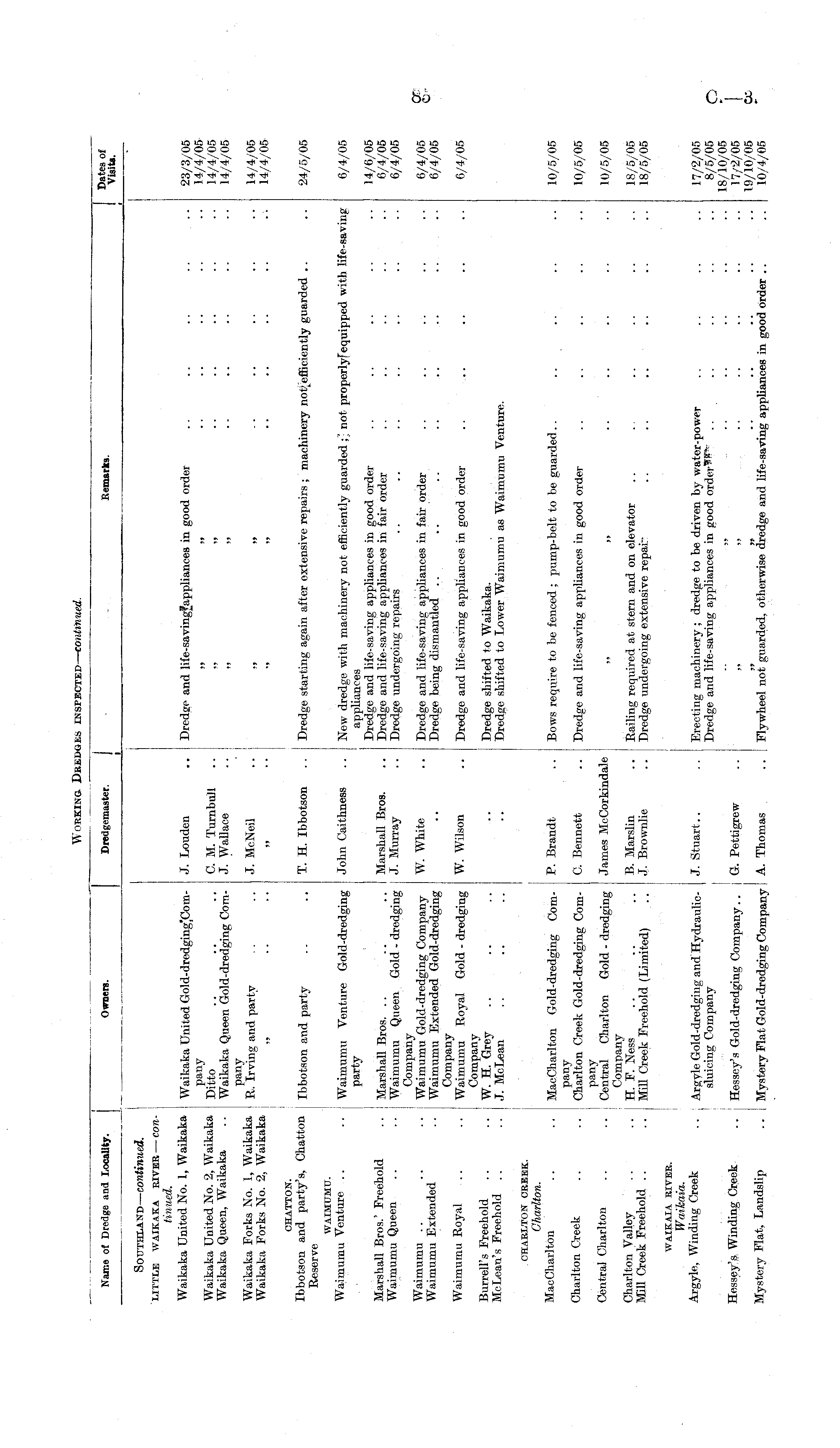 Name of Dredge and Locality. j Owners. Dredgemaster. I Remarks. I Dates of I Visits. Southland — continued. LITTLE WAIKAKA RIVEB — Con- ! Waikaka United No. 1, Waikaka j Waikaka United Gold-dredging;Com-Dredee and life-savingfappliances in good order J. Louden 23/3/05 14/4/05 14/4/05 14/4/05 pany Waikaka United No. 2, Waikaka Ditto Waikaka Queen, Waikaka .. Waikaka Queen Gold-dredging ComC. M. TurnbuJl .. J. Wallace it >i I pany Waikaka Forks No. 1, Waikaka ! r. Irving and partv Waikaka Forks No. 2, Waikaka J. McNeil I » »> - ■ • • • • • ■ 14/4/05 14/4/05 CHATTON. Ibbotson and party's, Chatton Ibbotson and party Reserve T. H. Ibbotson . . I Dredge starting again after oxtensive repairs ; machinery guarded 24/5/05 WAIMUMU. Waimumu Venture .. .. Waimumu Venture Gold-dredging partv John Caithness New dredge with machinery not efficiently guarded ; ■ not properlyFequipped with life-saving appliances Dredge and life-saving appliances in good order Dredge and life-saving appliances in fair order Dredge undergoing repairs 6/4/05 Marshall Bros.' Freehold .. Marshall Bros. Waimumu Queen .. .. Waimumu Queen Gold - dredging Company Waimumu .. .. .. Waimumu Gold-dredging Company Waimumu Extended .. Waimumu Extended Gold-dredging Company Waimumu Royal .. .. Waimumu Royal Gold - dredging Company Burrell's Freehold .. .. W. H. Grey McLean's Freehold .. .. J. McLean Marshall Bros. J. Murray 14/6/05 6/4/05 6/4/05 W. White Dredge and life-saving appliances in fair order Dredge being dismantled 6/4/05 6/4/05 W. Wilson Dredge and life-saving appliances in good order 6/4/05 Dredge shifted to Waikaka. Dredge shifted to Lower Waimumu as Waimumu Venture. CKARLTON CREEK. Gharlton. P. Brandt Bows require to be fenced ; pump-belt to be guarded. MacCharlton .. .. MacCharlton Gold-dredging Company Charlton Creek .. .. Charlton Creek Gold-dredging ComC. Bennett 10/5/05 Dredge and life-saving appliances in good order 10/5/05 pany Centra] Charlton .. .. Central Charlton Gold - dredging Company Charlton Valley .. .. H. F. Ness Mill Creek Freehold .. .. Mill Creek Freehold (Limited) '.'. James McCorkindale B. Marslin J. Brownlie Railing required at stern and on elevator .. .. .. .. Dredge undergoing extensive repai" 10/5/05 18/5/05 18/5/05 WAIKAIA RIVER. Argyle, Winding Creek .. Argyle Gold-dredging and Hydraulicsluicing Company J. Stuart.. Erecting machinery; dredge to be driven by water-power Dredge and life-saving appliances in good orderW* , 17/2/05 8/5/05 18/10/05 17/2/05 19/10/05 10/4/05 Hessey's Winding Creek .. Hessey's Gold-dredging Company.. Mystery Flat, Landslip .. Mystery Flat Gold-dredging Company G. Pettigrew A. Thomas Flywheel not guarded, otherwise dredge and life-saving appliances in good order