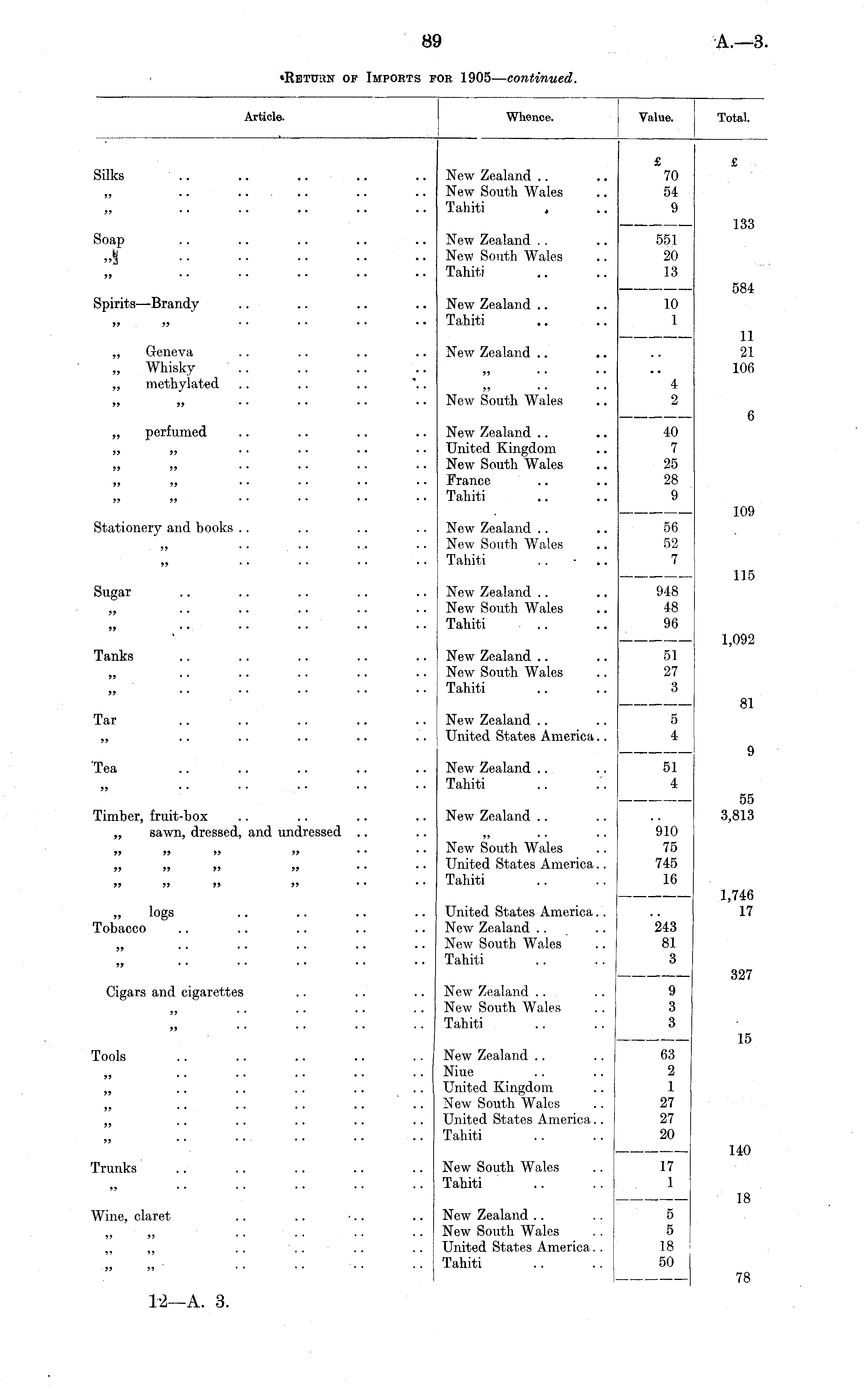 Article. Whence. Value. Total. Silks New Zealand New South Wales Tahiti £ 70 54 9 £ J? ■ • ■ • • • 133 Soap 4 New Zealand New South Wales Tahiti 551 20 13 99 ' ' ' ' • * 584 Spirits —Brandy New Zealand Tahiti 10 1 is J? • • • • „ Geneva „ Whisky .. „ methylated New Zealand .. 11 21 106 ,, . . » ■ ,, . . . . New South Wales 4 2 6 j? jj „ perfumed >» j? • • • • jj jj • • • • New Zealand United Kingdom New South Wales France Tahiti 40 7 25 28 9 j? j» >? 99 • ' * * Stationery and books .. 109 5? * • " ' New Zealand New South Wales Tahiti 56 52 7 J? * * • * Sugar New Zealand New South Wales Tahiti .. 115 ,, 948 48 96 1,092 )» ,. Tanks 99 , , . . . . New Zealand New South Wales Tahiti 51 27 3 5? • • • " • • 81 Tar New Zealand United States America.. 5 4 99 ' * • • • • 9 Tea New Zealand Tahiti 51 4 55 3,813 99 • • • • • • Timber, fruit-box „ sawn, dressed, and undressed New Zealand .. 910 75 745 16 5) M JJ ?? JJ JJ >? 99 New South Wales United States America.. Tahiti 1,746 17 9> 93 99 99 logs Tobacco United States America.. New Zealand New South Wales Tahiti 243 81 3 ,, 327 ,, . . . . . . Cigars and cigarettes ,, . . . . New Zealand ... New South Wales Tahiti 9 3 3 ,, . . . . 15 Tools ,, J? New Zealand Niue United Kingdom New South Wales United States America.. Tahiti 63 2 1 27 27 20 ,, . . . . . . 99 • ' ' ' ' ' 99 ' ' ' ' ' ' Trunks New South Wales Tahiti 17 1 140 99 ' ' ' ' * ' 18 Wine, claret »* »; New Zealand New South Wales United States America. . Tahiti 5 5 18 50 )? 99 78