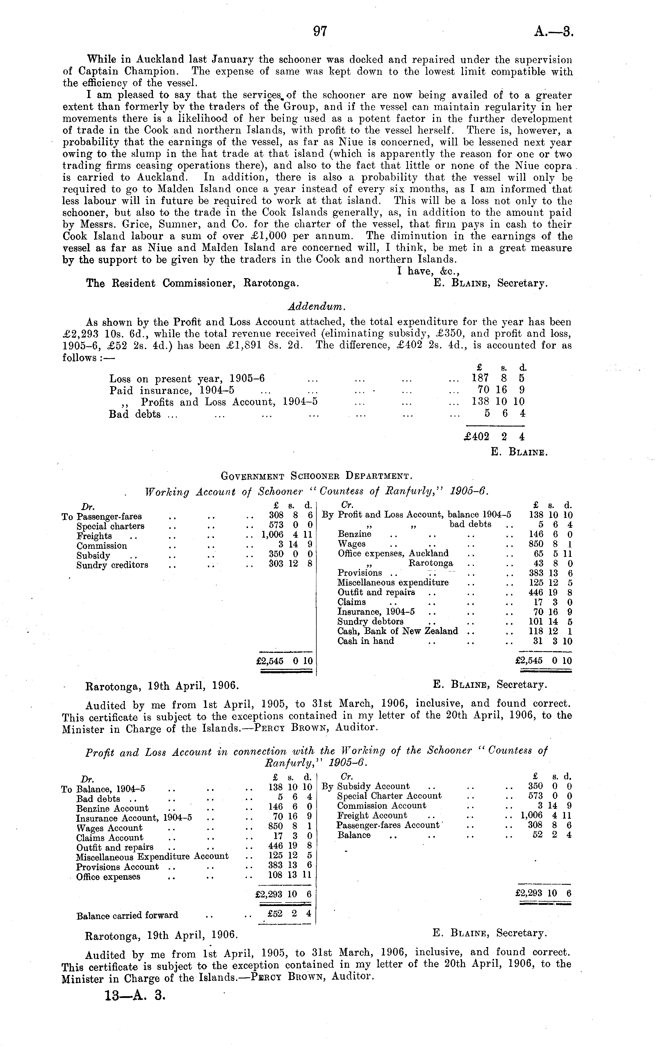 While in Auckland last January the schooner was clocked and repaired under the supervision of Captain Champion. The expense of same was kept down to the lowest limit compatible with the efficiency of the vessel. I am pleased to say that the services, of the schooner are now being availed of to a greater extent than formerly by the traders of the Group, and if the vessel can maintain regularity in her movements there is a likelihood of her being used as a potent factor in the further development of trade in the Cook and northern Islands, with profit to the vessel herself. There is, however, a probability that the earnings of the vessel, as far as Niue is concerned, will be lessened next year owing to the slump in the hat trade at that island (which is apparently the reason for one or two trading firms ceasing operations there), and also to the fact that little or none of the Niue copra is carried to Auckland. In addition, there is also a probability that the vessel will only be required to go to Maiden Island once a year instead of every six months, as I am informed that less labour will in future be required to work at that island. This will be a loss not only to the schooner, but also to the trade in the Cook Islands generally, as, in addition to the amount paid by Messrs. Grice, Sumner, and Co. for the charter of the vessel, that firm pays in cash to their Cook Island labour a sum of over £1,000 per annum. The diminution in the earnings of the vessel as far as Niue and Maiden Island are concerned will, I think, be met in a great measure by the support to be given by the traders in the Cook and northern Islands. I have, &c, The Resident Commissioner, Rarotonga. E. Blame, Secretary. Addendum. As shown by the Profit and Loss Account attached, the total expenditure for the year has been £2,293 10s. 6d., while the total revenue received (eliminating subsidy, £350, and profit and loss, 1905-6, £52 2s. 4d.) has been £1,891 Bs. 2d. The difference, £402 2s. 4d., is accounted for as follows :— £ s. d. Loss on present year, 1905-6 ... ... ... ... 187 8 5 Paid insurance, 1904-5 ... ... ... • ... ... 70 16 9 ~ Profits and Loss Account, 1904-5 ... ... ... 138 10 10 Bad debts ... ... ... ... ... ... ... 564 £402 2 4 E. Blame. Government Schooner Department. Working Account of Schooner "Countess of Ranfurly," 1905-6. Or. £ s. d. Cr. £ s. d. To Passenger-fares .. .. .. 308 8 6By Profit and Loss Account, balance 1904-5 138 10 10 Special charters .. .. 573 0 0 „ „ bad debts .. 5 6 4 Freights .. .. •• •• 1,006 411 Benzine .. .. .. 146 6 0 Commission 3 14 9 Wages 850 8 1 Subsidy .. .. . • • • 350 0 0 Office expenses, Auckland .. .. 65 511 Sundry creditors .. .. 303 12 8 „ Rarotonga .. .. 43 8 0 Provisions .. .. .. 383 13 6 Miscellaneous expenditure .. .. 125 12 5 Outfit and repairs .. .. .. 446 19 8 Claims .. .. .. .. 17 3 0 Insurance, 1904-5 .. .. .. 70 16 9 Sundry debtors .. .. .. 101 14 5 Cash, Bank of New Zealand .. .. 118 12 1 Cash in hand .. .. .. 31 3 10 £2,545 0 10 £2,545 0 10 Rarotonga, 19th April, 1906. E. Blame, Secretary. Audited by me from Ist April, 1905, to 31st March, 1906, inclusive, and found correct. This certificate is subject to the exceptions contained in my letter of the 20th April, 1906, to the Minister in Charge of the Islands. —Perot Brown, Auditor. Profit and Loss Account in connection with the Working of the Schooner " Countess of Banfurly," 1905-6. j) r £ s. d. Cr. £ s. d. To Balance, 1904-5 .. • • • ■ 138 10 10 By Subsidy Account .. .. .. 350 0 0 Bad debts .. .. • ■ • • 5 6 4 Special Charter Account .. .. 573 0 0 Benzine Account .. .. ■■ 146 6 0 Commission Account .. .. 314 9 Insurance Account, 1904-5 .. .. 70 16 9 Freight Account .. .. .. 1,006 411 Wages Account .. .. .. 850 8 1 Passenger-fares Account' .. 308 8 6 Claims Account 17 3 0 Balance 52 2 4 Outfit and repairs .. .. • ■ 446 19 8 Miscellaneous Expenditure Account .. 125 12 5 Provisions Account .. .. . • 383 13 6 Office expenses .. .. •• 108 13 11 £2,293 10 6 £2,293 10 6 Balance carried forward .. • ■ £52 2 4 Rarotonga, 19th April, 1906. E. Blame, Secretary. Audited by me from Ist April, 1905, to 31st March, 1906, inclusive, and found correct. This certificate is subject to the exception contained in my letter of the 20th April, 1906, to the Minister in Charge of the Islands.— Percy Brown, Auditor.