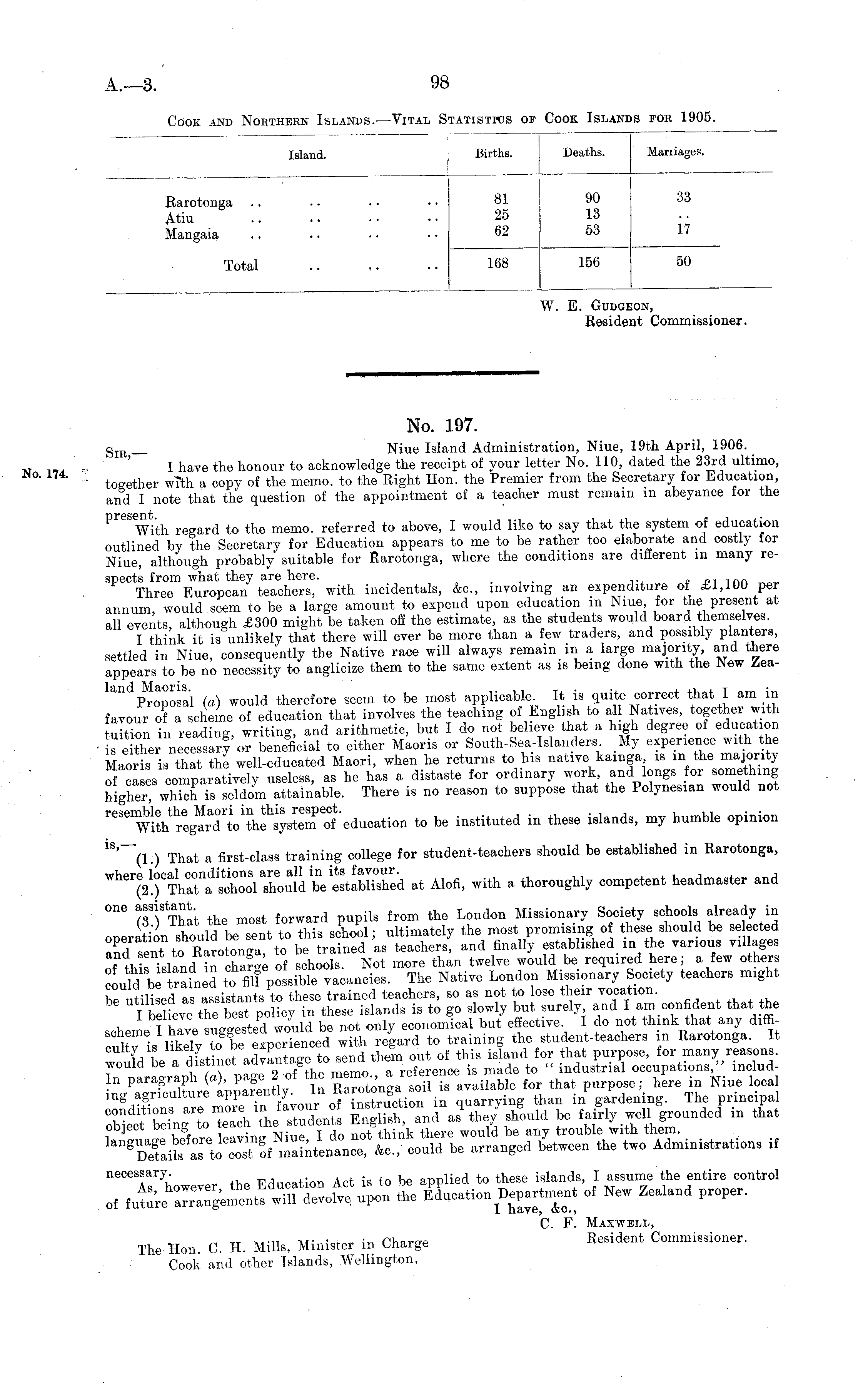 No. 197. g IR Niue Island Administration, Niue, 19th April, 1906. I have the honour to acknowledge the receipt of your letter No. 110, dated the 23rd ultimo, together with a copy of the memo, to the Right Hon. the Premier from the Secretary for Education, and I note that the question of the appointment of a teacher must remain m abeyance for the regard to the memo, referred to above, I would like to say that the system of education outlined by the Secretary for Education appears to me to be rather too elaborate and costly for Niue, although probably suitable for Rarotonga, where the conditions are different in many respects from what they are here. , „, rm Three European teachers, with incidentals, &c, involving an expenditure of £1,100 per annum, would seem to be a large amount to expend upon education in Niue for the present at all events although £300 might be taken ofi the estimate, as the students would board themselves. I think it is unlikely that there will ever be more than a few traders, and possibly planters, settled in Niue, consequently the Native race will always remain in a large majority, and there appears to be no necessity to anglicize them to the same extent as is being done with the New Zeaknd Proposal (a) would therefore seem to be most applicable. It is quite correct that I am in favour of a scheme of education that involves the teaching of English to al Natives, together with tSn in reading, writing, and arithmetic, but I do not believe that a high degree of education r e ther necessary or beneficial to either Maoris or South-Sea-Islanders My experience with the Maorifis that the well-educated Maori, when he returns to his native kamga is in the majority of caes comparatively useless, as he has a distaste for ordinary work and longs for something higher which is seldom attainable. There is no reason to suppose that the Polynesian would not Ye^ h to be instituted in these islands, my humble opinion lS '~(1 ) That a first-class training college for student-teachers should be established in Rarotonga, S ta'SlSa at Alofi, with a thoroughly competent headmaster and one assistant. don Missi g • ty sc h oo ls already in (o.; I™ l sc hool- ultimately the most promising of these should be selected r/Stot oSnga to bt and finally established, in the various villages of ths island in chai; of schools. Not more than twelve would be required here; a few others could be rained to fill possible vacancies. The Native London Missionary Society teachers might be utilised as assistants to these trained teachers, so as not to lose their vocation. I believe the best policy in these islands is to go slowly but surely and I am confident that the scheme I have suggested would be not only economical but effective Ido not think that any diffiffin. likllv to Tbe experienced with regard to training the student-teachers in Rarotonga. It would be a distinct advantage to send them out of this island for that purpose, for many reasons, would be a distinct; aavd.n b reference is made to " industrial occupations," includ'""Eih .. « "if m.tom»», to" ~»U be «r.nged l»t-» «« *-> A<lmi»i»«r»ion. it necessary. w^ lt -o+,-«ti Act is to be applied to these islands, I assume the entire control of Department of New Zealand proper. C. F. Maxwell, The Hon. C. H. Mills, Minister in Charge Resident Commissioner. Cook and other Islands, Wellington,