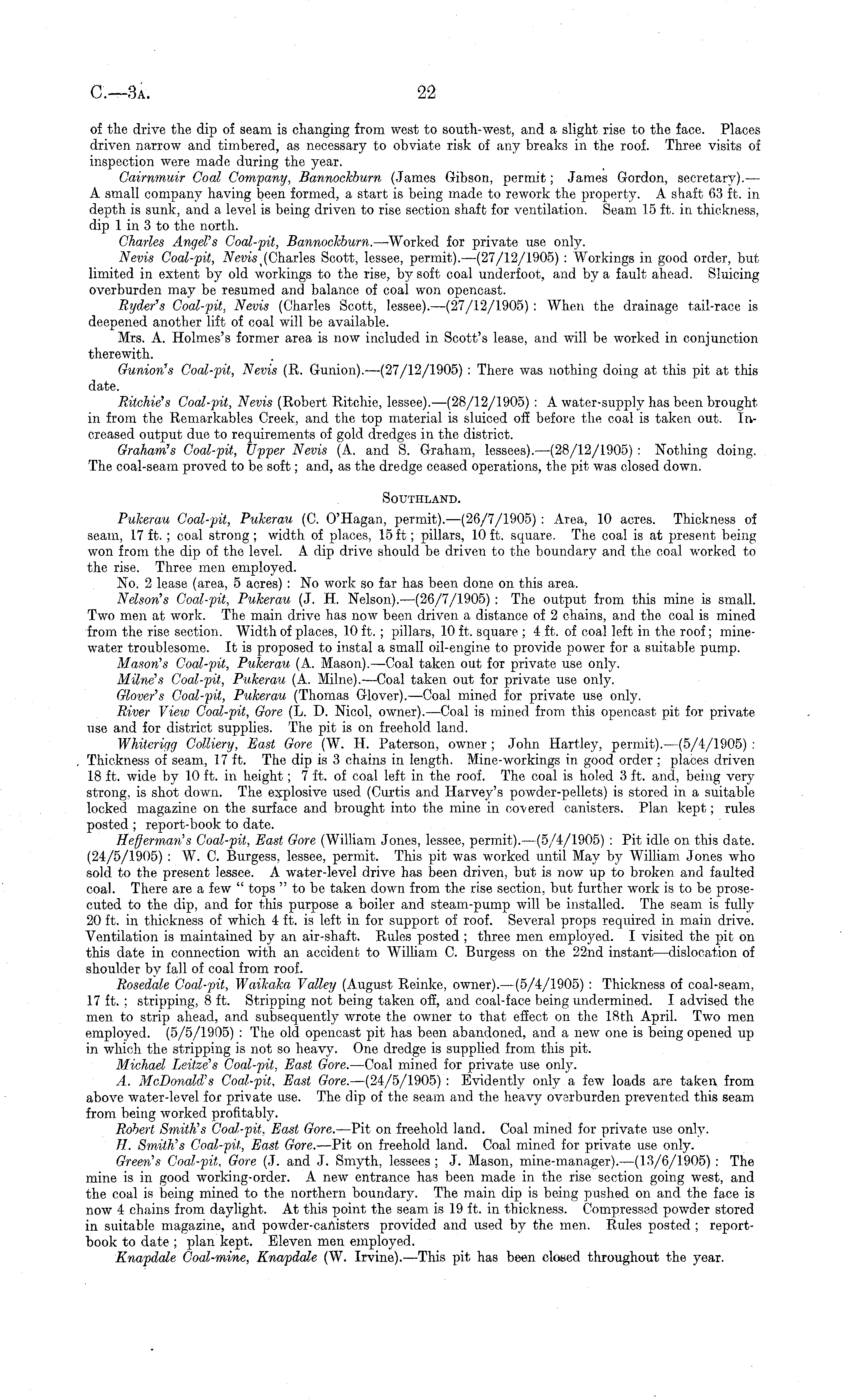 of the drive the dip of seam is changing from west to south-west, and a slight rise to the face. Places driven narrow and timbered, as necessary to obviate risk of any breaks in the roof. Three visits of inspection were made during the year. Cairnmuir Coal Comfany, Bannockburn (James Gibson, permit; James Gordon, secretary).— A small company having been formed, a start is being made to rework the property. A shaft 63 ft. in depth is sunk, and a level is being driven to rise section shaft for ventilation. Seam 15 ft. in thickness, dip 1 in 3 to the north. Charles Angel's Coal-pit, Bannockburn. —Worked for private use only. Nevis Coal-pit, Nevis t ( Charles Scott, lessee, permit). —(27/12/1905) : Workings in good order, but limited in extent by old workings to the rise, by soft coal underfoot, and by a fault ahead. Sluicing overburden may be resumed and balance of coal won opencast. Ryder's Coal-pit, Nevis (Charles Scott, lessee). —(27/12/1905) : When the drainage tail-race is deepened another lift of coal will be available. Mrs. A. Holmes's former area is now included in Scott's lease, and will be worked in conjunction therewith. Gunion's Coal-pit, Nevis (R. Gunion). —(27/12/1905) : There was nothing doing at this pit at this date. Ritchie's Coal-pit, Nevis (Robert Ritchie, lessee). —(28/12/1905) : A water-supply has been brought in from the Remarkables Creek, and the top material is sluiced off before the coal is taken out. Increased output due to requirements of gold dredges in the district. Graham's Coal-pit, Upper Nevis (A. and S. Graham, lessees). —(28/12/1905) : Nothing doing. The coal-seam proved to be soft; and, as the dredge ceased operations, the pit was closed down. Southland. Pukerau Coal-pit, Pukerau (C. O'Hagan, permit). —(26/7/1905) : Area, 10 acres. Thickness of seam, 17 ft. ; coal strong; width of places, 15 ft; pillars, 10 ft. square. The coal is at present being won from the dip of the level. A dip drive should be driven to the boundary and the coal worked to the rise. Three men employed. No. 2 lease (area, 5 acres) : No work so far has been done on this area. Nelson's Coal-pit, Pukerau (J. H. Nelson). —(26/7/1905) : The output from this mine is small. Two men at work. The main drive has now been driven a distance of 2 chains, and the coal is mined from the rise section. Width of places, 10 ft. ; pillars, 10 ft. square ; 4 ft. of coal left in the roof; minewater troublesome. It is proposed to instal a small oil-engine to provide power for a suitable pump. Mason's Coal-pit, Pukerau (A. Mason). —Coal taken out for private use only. Milne's Coal-pit, Pukerau (A. Milne). —Coal taken out for private use only. Glover's Coal-pit, Pukerau (Thomas Glover). —Coal mined for private use only. River View Coal-pit, Gore (L. D. Nicol, owner). —Coal is mined from this opencast pit for private use and for district supplies. The pit is on freehold land. Whiterigg Colliery, East Gore (W. H. Paterson, owner ; John Hartley, permit). —(5/4/1905) : Thickness of seam, 17 ft. The dip is 3 chains in length. Mine-workings in good order ; places driven 18 ft. wide by 10 ft. in height; 7 ft. of coal left in the roof. The coal is holed 3 ft. and, being very strong, is shot down. The explosive used (Curtis and Harvey's powder-pellets) is stored in a suitable locked magazine on the surface and brought into the mine in covered canisters. Plan kept; rules posted ; report-book to date. Hefferman's Coal-pit, East Gore (William Jones, lessee, permit).—(s/4/1905) : Pit idle on this date. (24/5/1905) :W. C. Burgess, lessee, permit. This pit was worked until May by William Jones who sold to the present lessee. A water-level drive has been driven, but is now up to broken and faulted coal. There are a few " tops "to be taken down from the rise section, but further work is to be prosecuted to the dip, and for this purpose a boiler and steam-pump will be installed. The seam is fully 20 ft. in thickness of which 4 ft. is left in for support of roof. Several props required in main drive. Ventilation is maintained by an air-shaft. Rules posted ; three men employed. I visited the pit on this date in connection with an accident to William C. Burgess on the 22nd instant —dislocation of shoulder by fall of coal from roof. Rosedale Coal-pit, Waikaka Valley (August Reinke. owner). —(5/4/1905) : Thickness of coal-seam, 17 ft. ; stripping, 8 ft. Stripping not being taken off, and coal-face being undermined. I advised the men to strip ahead, and subsequently wrote the owner to that effect on the 18th April. Two men employed. (5/5/1.905) : The old opencast pit has been abandoned, and a new one is being opened up in which the stripping is not so heavy. One dredge is supplied from this pit. Michael Leitze's Coal-pit, East Gore. —Coal mined for private use only. A. McDonald's Coal-pit, East Gore. —(24/5/1905) : Evidently only a few loads are taken from above water-level for private use. The dip of the seam and the heavy overburden prevented this seam from being worked profitably. Robert Smith's Coal-pit, East Gore. —Pit on freehold land. Coal mined for private use only. H. Smith's Coal-pit, East Gore. —Pit on freehold land. Coal mined for private use only. Green's Coal-pit, Gore (J. and J. Smyth, lessees ; J. Mason, mine-manager).—(l 3/6/1905) : The mine is in good working-order. A new entrance has been made in the rise section going west, and the coal is being mined to the northern boundary. The main dip is being pushed on and the face is now 4 chains from daylight. At this point the seam is 19 ft. in thickness. Compressed powder stored in suitable magazine, and powder-canisters provided and used by the men. Rules posted ; reportbook to date ; plan kept. Eleven men employed. Knapdale Goal-mine, Knapdale (W. Irvine). —This pit has been clowed throughout the year.