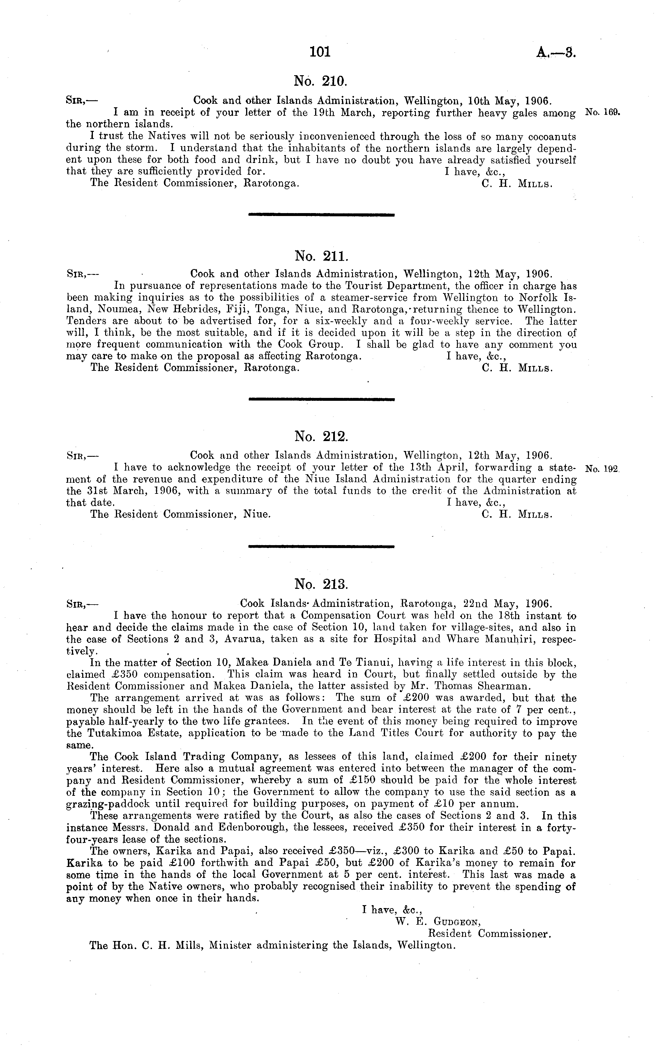 No. 210. Sir, — Cook and other Islands Administration, Wellington, 10th May, 1906. I am in receipt of your letter of the 19th March, reporting further heavy gales among the northern islands. I trust the Natives will not be seriously inconvenienced through the loss of so many cocoanuts during the storm. I understand that the inhabitants of the northern islands are largely dependent upon these for both food and drink, but I have no doubt you have already satisfied yourself that they are sufficiently provided for. I have, &c, The Resident Commissioner, Rarotonga. C. H. Mills.