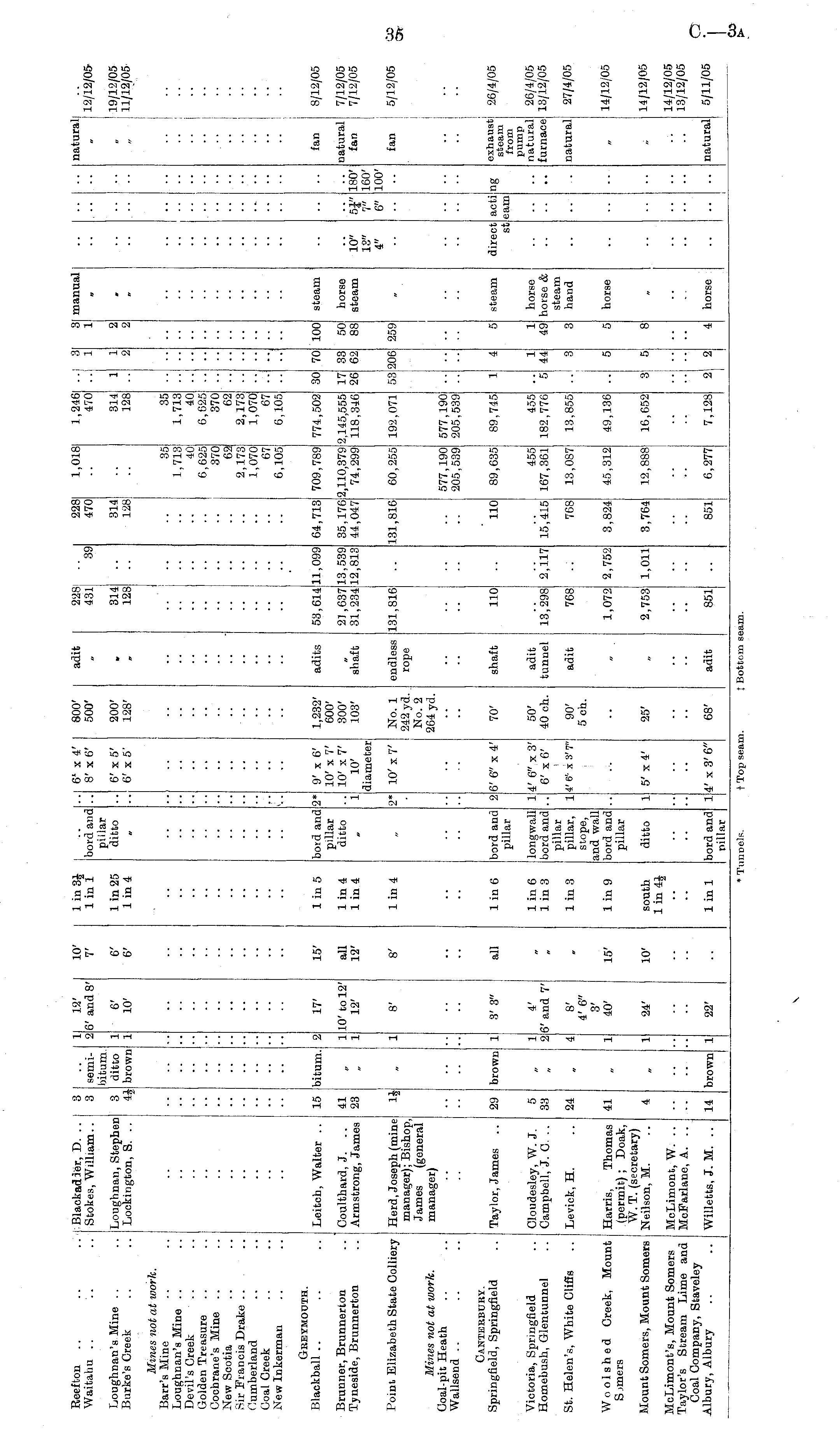 Reefton Waitahu Blackadier, D. .. Stokes, William.. 3 3 semibit um. ditto brown I 2 12' 6' and 8' 10' 7' 1 in3J 1 in 1 bord and pillar ditto 6' x 4' 8'x6' 500' adit 228! 431 39 470 i,uio 1 470 manual naturall I 12/12/05 Loughnan's Mine Burke's Creek Loughnan, Stephen Lockington, S. .. 3 1 1 6' 10' 6' 6' 1 in 25 1 in 4 6' x5' 6' x5' 200' 128' 314 128 314 128 314 128 1 1 2 2 2 19/12/05 11/12/05 Mines not at work. Barr's Mine Loughnan's Mine Devil's Creek Golden Treasure Cochrane's Mine New Scotia Sir Prancis Drake .. Cumberland Coal Creek New Inkerman I.I I " i •• " - i •• I "■ "II •• 35 1,713 40 6,625 370 62 2,173 1,070 67 6,105 35 1,713 40 6,625 370 62 2,173 1,070 67 6,105 - Greymouth. Blackball Brunner, Brunnerton Tyneside, Brunnerton Leitch, Walter .. Coulthard, J. Armstrong, James 15 41 23 bitum. 17' 10' to 12' 12' 15' all 12' 1 in 5 1 in 4 1 in 4 bord and pillar ditto !2*i 9' x 6' 10' x 7' 10' x 7' 10' diameter 1,232' 600' 300' 103' adits shaft 53,614 21,637 31,234 11,099 13,539 12,813 64,713 35,176 44,047 709,789 2,110,379 74,299 774,502 2,145,555 118,346 30, 17 ■26 70 33 62 100 50 88 steam horse steam 10" 13" 4" fan 8/12/05 natural 7/12/05 fan 7/12/05 fan ! 5/12/05 1 1 1 5J" 7" 6" 180' 160' 100' Point Elizabeth State Colliery Herd, Joseph (mine manager); Bishop, James (general manager) l* 8' 8' 1 in 4 |2* 10' x 7' No. 1 242 vd. No." 2 264 yd. endless rope 131,816 ■■ 131,816 60,255 192,071 53 206 259 •- Mines not at work. Coal-pit Heath Wallsend 577,190 205,539 577,190 205,539 •■ •■ •• •• •• •• i Canterbury. Springfield, Springfield Taylor, James 29 brown 3' 3" all 1 in 6 bord and pillar 6' 6" x 4' 70' shaft 110 110 89,635 89,745 steam direct st acti exhaust 26/4/05 steam from pump natural 26/4/05 furnace 13/12/05 i"g earn Victoria, Springfield Homebush, Glentunnel Cloudesley, W. J. Campbell, J. C. .. 5 33 1 2 4' 6' and 7' lin6 lin3 longwall bord and pillar pillar, stope, and wall bord and pillar 4' 6" x 3' 6' x6' 50' 40 ch. adit tunnel 13!298 2^17 15,415 455 167,361 455 182,776 5 1 44 1 49 horse horse & steam hand St. Helen's, White Cliffs Levick, H. 24 8' 4' 6" 3' 40' 1 in 3 4' 6'- x 3' 7" 90' 5ch. adit 768 768! 13,087 13,855 3 natural! 27/4/05 W o o i s h e d Creek, Mount S jmers Harris, Thomas (permit) ; Doak, W. T. (secretary) Neilson, M. 41 15' 1 in 9 1,072 2,752 3,824 45,312 49,136 3 horse 14/12/05 Mount Somers, Mount Somers 24' 10' south lin4J ditto 5' x4' 25' 2,753 1,011 3,764 12,888 16,652 3 14/12/05 McLimont's, Mount Somers Taylor's Stream Lime and Coal Company, Staveley Albury, Albury McLimont, W. .. McParlane, A. .. 14/12/05 13/12/05 Willetts, J. M. .. 14 brown 22' linl bord and nillar 4' x 3' 6" 68' adit 851 - 851 6,277 7,128 2 2 1 4 horse natural 5/11/05 *Tu nnels. t Top seam. I Bottom seam.