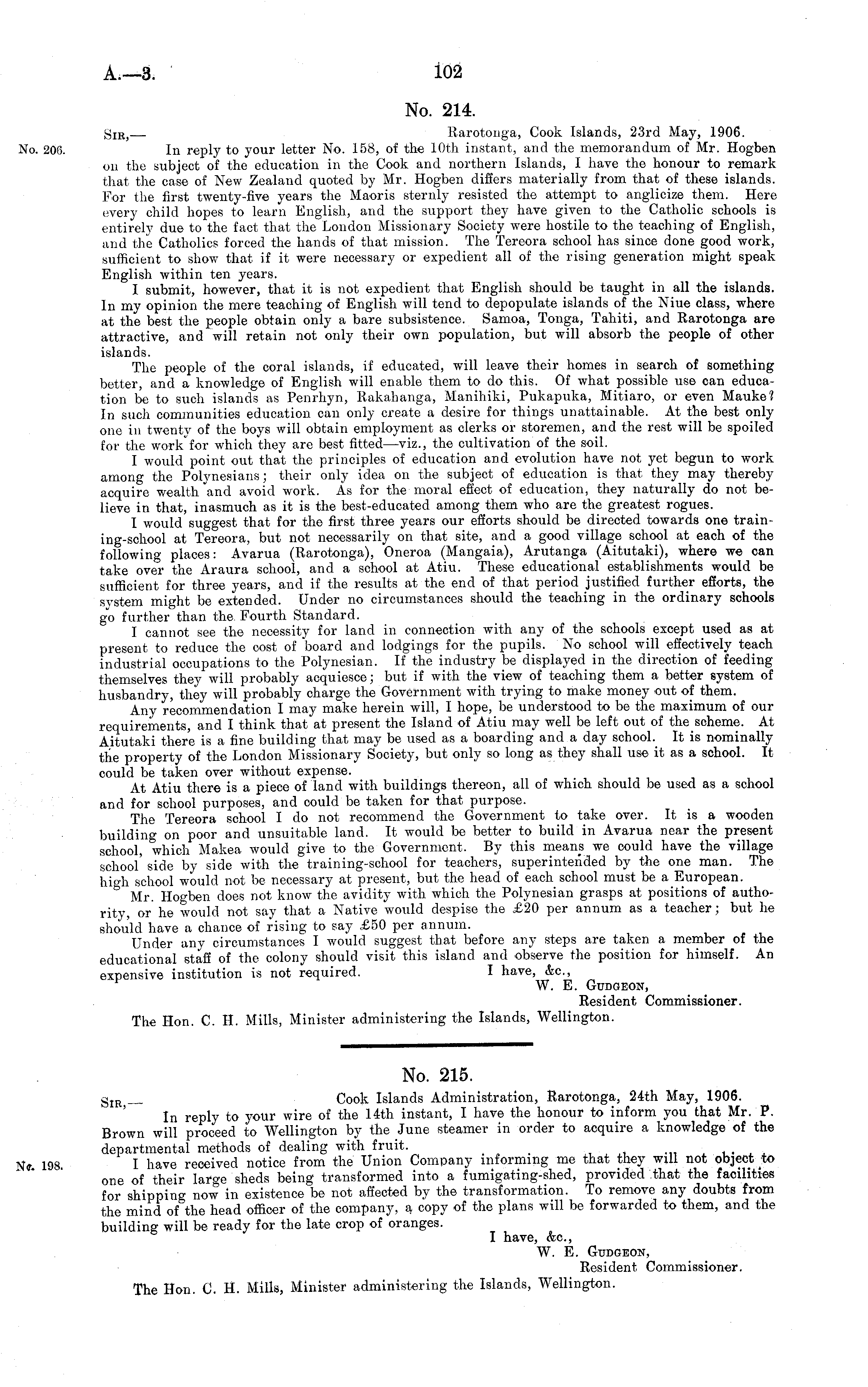 No. 214. y IR) . Rarotonga, Cook Islands, 23rd May, 1906. In reply to your letter No. 158, of the 10th instant, and the memorandum of Mr. Hogben on the subject of the education in the Cook and northern Islands, I have the honour to remark that the case of New Zealand quoted by Mr. Hogben differs materially from that of these islands. For the first twenty-five years the Maoris sternly resisted the attempt to anglicize them. Here every child hopes to learn English, and the support they have given to the Catholic schools is entirely due to the fact that the London Missionary Society were hostile to the teaching of English, and the Catholics forced the hands of that mission. The Tereora school has since done good work, sufficient to show that if it were necessary or expedient all of the rising generation might speak English within ten years. I submit, however, that it is not expedient that English should be taught in all the islands. In my opinion the mere teaching of English will tend to depopulate islands of the Niue class, where at the best the people obtain only a bare subsistence. Samoa, Tonga, Tahiti, and Rarotonga are attractive, and will retain not only their own population, but will absorb the people of other islands. The people of the coral islands, if educated, will leave their homes in search of something better, and a knowledge of English will enable them to do this. Of what possible use can education be to such islands as Penrhyn, Rakahanga, Manihiki, Pukapuka, Mitiaro, or even Mauke? In such communities education can only create a desire for things unattainable. At the best only one in twenty of the boys will obtain employment as clerks or storemen, and the rest will be spoiled for the work"for which they are best fitted —viz., the cultivation of the soil. I would point out that the principles of education and evolution have not yet begun to work among the Polynesians; their only idea on the subject of education is that they may thereby acquire wealth "and avoid work. As for the-moral effect of education, they naturally do not believe in that, inasmuch as it is the best-educated among them who are the greatest rogues. I would suggest that for the first three years our efforts should be directed towards one train-ing-school at Tereora, but not necessarily on that site, and a good village school at each of the following places: Avarua (Rarotonga), Oneroa (Mangaia), Arutanga (Aitutaki), where we can take over the Araura school, and a school at Atiu. These educational establishments would be sufficient for three years, and if the results at the end of that period justified further efforts, the system might be extended. Under no circumstances should the teaching in the ordinary schools go further than the Fourth Standard. I cannot see the necessity for land in connection with any of the schools except used as at present to reduce the cost of board and lodgings for the pupils. No school will effectively teach industrial occupations to the Polynesian. If the industry be displayed in the direction of feeding themselves they will probably acquiesce; but if with the view of teaching them a better system of husbandry, they will probably charge the Government with trying to make money out of them. Any recommendation I may make herein will, I hope, be understood to be the maximum of our requirements, and I think that at present the Island of Atiu may well be left out of the scheme. At Aitutaki there is a fine building that may be used as a boarding and a day school. It is nominally the property of the London Missionary Society, but only so long as they shall use it as a school. It could be taken over without expense. At Atiu there is a piece of land with buildings thereon, all of which should be used as a school and for school purposes, and could be taken for that purpose. The Tereora school I do not recommend the Government to take over. It is a wooden building on poor and unsuitable land. It would be better to build in Avarua near the present school, which Makea would give to the Government. By this means we could have the village school' side by side with the training-school for teachers, superintended by the one man. The high school would not be necessary at present, but the head of each school must be a European. * Mr. Hogben does not know the avidity with which the Polynesian grasps at positions of authority, or he would not say that a Native would despise the £20 per annum as a teacher; but he should have a chance of rising to say £50 per annum. Under any circumstances I would suggest that before any steps are taken a member of the educational staff of the colony should visit this island and observe the position for himself. An expensive institution is not required. I have, &c, W. E. Gudgeon, Resident Commissioner. The Hon. C. H. Mills, Minister administering the Islands, Wellington.