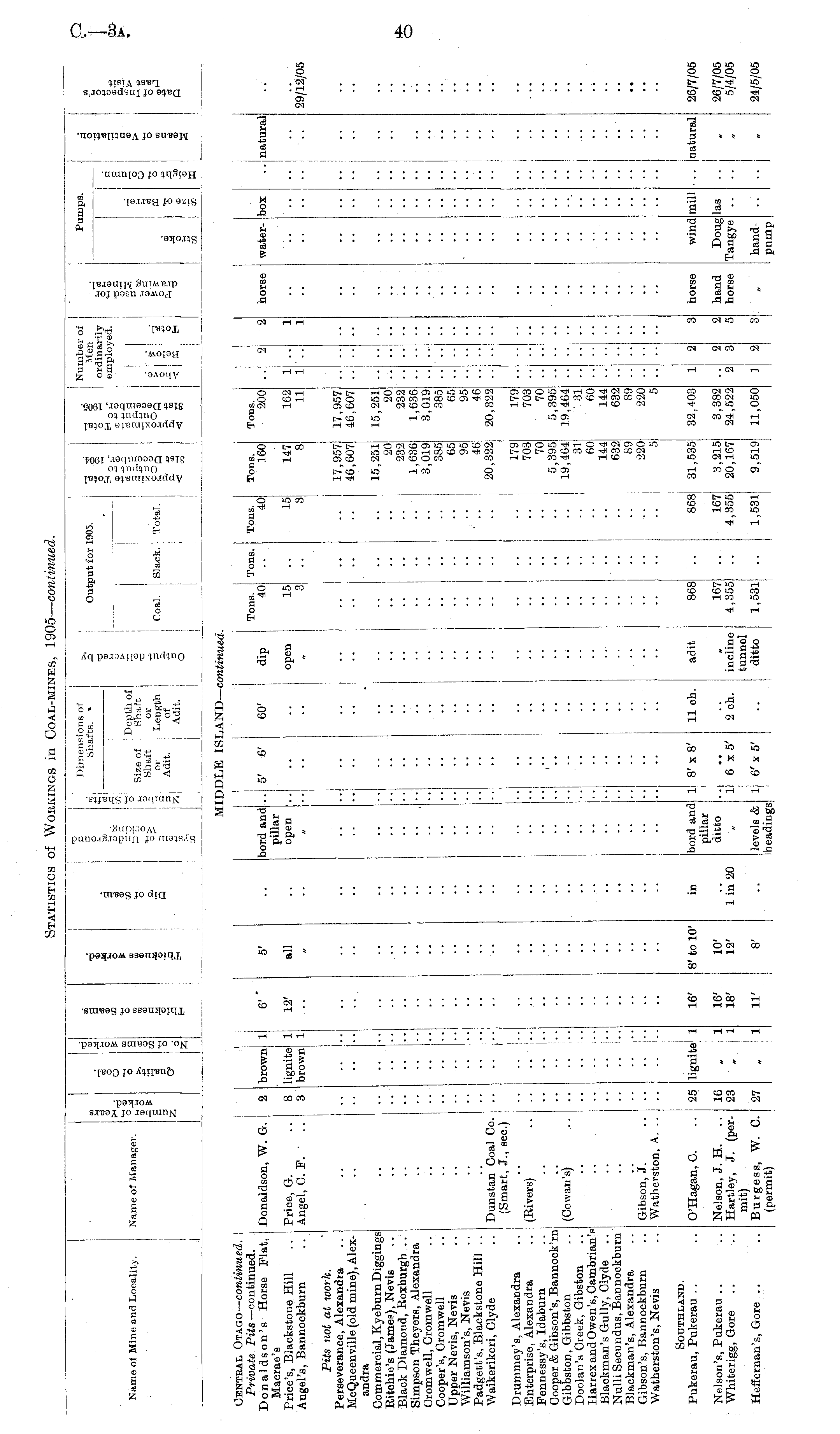 Name of Mine and Locality. Name of Manager. u CO -2 IS s O o a ■73 CD O c3 CD 6 CD O to CD M O CD la a CD O 3 0 X QQ Dimensions of te Shafts. • ?! 43 M I o I Depth of h Size of : Shaft 2' Shaft ! or '- or : Length 3 i Adit. of 7. j Adit. .a CD 'co 6 Output for 1905. "3 S CD-* 3 CD Coal. Slack. I Total. £°n j Number of "cc, © Men o 3 ; ordinarily H o u > employed. CD CO 1 — +jrQ ~ CD Q > ! _- F * f -2 CD O H c3 «H CD fl a C0.~ Pui imps. 3 CO 5) a a a X '3 a eg O w CD >4 o §44 44 lf ' CDr4 44 cS to p 'DLE IS AND— < ■■ontinued. Central Otago — continued. Private Pits —continued. Donaldson's Horse Flat, Macrae's Price's, Blackstone Hill Angel's, Bannockburn Donaldson, W. G. 2 brown 1 lignite 1 brown 1 6' ' 5' bord and . pillar open 5' 6' 60' dip Tons. 40 15 3 Tons, Tons. 40 15 3 Pons. Tons. 40 160 Tons. 200 horse waterbox .. natural Price, G. Angel, C. F. ' .. 8 3 \ 12' all open 15 147 3 8 162 11 1 1 1 1 .. .. 29/12/Oi • I .. .. -.. Pits not at work. Perseverance, Alexandra McQueenville (old mine), Alexandra I 17,957 46,607 17,957 46,607 .. .. . . Commercial, Kyeburn Diggings Ritchie's (James), Nevis Black Diamond, Roxburgh .. Simpson Theyers, Alexandra Cromwell, Cromwell Cooper's, Cromwell Upper Nevis, Nevis Williamson's, Nevis Padgett's, Blackstone Hill .. Waikerikeri, Clyde •■ .. .. I | I - ! •• i •• i •• 15,251 20 232 1,636 3,019 385 65 95 46 20,322 15,251 20 232 1,636 3,019 385 65 95 46 20,322 •• •• .. •• i ••! 1 "' I ■• ! " 1 ! I ' •■ Dunstan Coal Co. (Smart, J., sec.) I i , i i Drummey's, Alexandra .. | Enterprise, Alexandra Pennessy's, Idaburn Cooper & Gibson's, Bannock'rn Gibbston, Gibbston Doolan's Creek, Gibston Harrex and Owen 's, Cambrian's Blackman's Gully, Clyde Nulli Secundus, Bannockburn Blackman's, Alexandra Gibson's, Bannockburn Watherston's, Nevis i I i 179 703 70 5,395 19,464 31 60 144 632 89 220 5 179 703 70 5,395 19,464 31 60 144 632 89 220 5 (Rivers) I .. ! .. ■• ! .. .. .. (Cowan's) ! .. - i .. i .. | .,. .. | .. . ■■ !"■ •• ! •■ •• 1 Gibson, J. Watherston, A. .. ■ "• •• ■• I - I •■ ! .1 .. Southland. Pukerau, Pukerau O'Hagan, C. I I lignite 1 16' 8' to 10' in bord and pillar ditto I 8' x 8' 11 ch. adit 868 868 31,5351 32,403 horse wind mill I .. jnatural 26/7/0! 25 Nelson's, Pukerau .. .. Whiterigg, Gore Nelson, J. H. Hartley, J. (permit) Burgess, W. C. (permit) 16 23 1 . : 1 16' 18' 10' 12' 1 in 20 i L 6x5' 2 ch. incline tunnel ditto 167 4,355 167 3,215 4,355 20,167 3,382 24,522 2 2 3 2 5 hand horse Doug Tangye las .. j . 26/7/0! 5/4/0! Heffernan's, Gore 27 1 11' 8' levels & headings 1 6' x 5' 1,531 1,531 9,519 11,050 handpnmp 24/5/0!