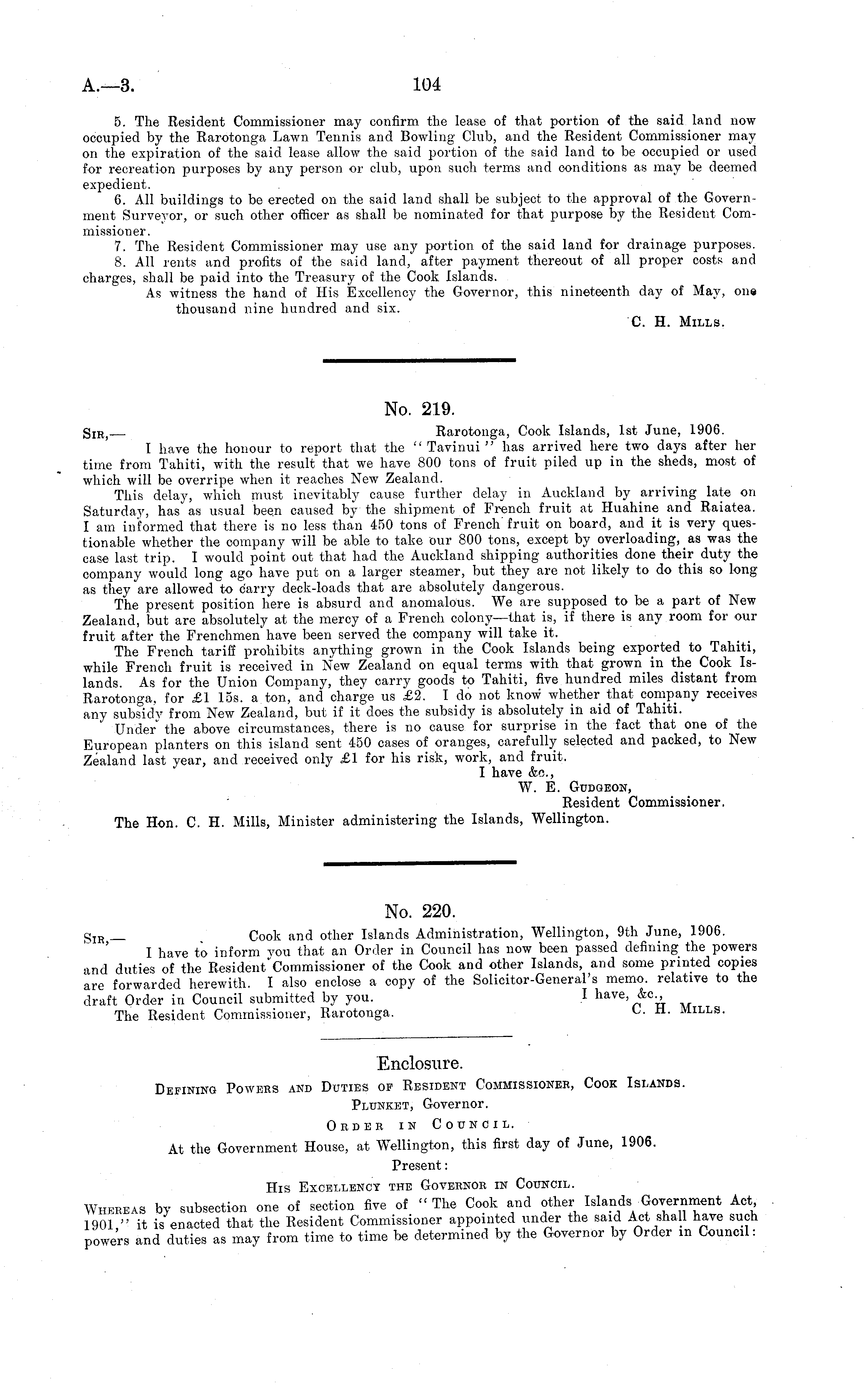 No. 219. S IH) Rarotonga, Cook Islands, Ist June, 1906. I have the honour to report that the " Tavinui " has arrived here two days after her time from Tahiti, with the result" that we have 800 tons of fruit piled up in the sheds, most of which will be overripe when it reaches New Zealand. This delay, which must inevitably cause further delay in Auckland by arriving late on Saturday, has as usual been caused by the shipment of French fruit at Huahine and Raiatea. I am informed that there is no less than 450 tons of French fruit on board, and it is very questionable whether the company will be able to take our 800 tons, except by overloading, as was the case last trip. I would point out that had the Auckland shipping authorities done their duty the company would long ago have put on a larger steamer, but they are not likely to do this so long as they are allowed to carry deck-loads that are absolutely dangerous. The present position here is absurd and anomalous. We are supposed to be a part of New Zealand, but are absolutely at the mercy of a French colony—that is, if there is any room for our fruit after the Frenchmen have been served the company will take it. The French tariff prohibits anything grown in the Cook Islands being exported to Tahiti, while French fruit is received in New Zealand on equal terms with that grown in the Cook Islands. As for the Union Company, they carry goods to Tahiti, five hundred miles distant from Rarotonga, for £1 15s. a ton, and charge us £2. Ido not know whether that company receives any subsidy from New Zealand, but if it does the subsidy is absolutely in aid of Tahiti. Under" the above circumstances, there is no cause for surprise in the fact that one of the European planters on this island sent 450 cases of oranges, carefully selected and packed, to New Zealand last year, and received only £1 for his risk, work, and fruit. I have &c, W. E. Gudgeon, Resident Commissioner. The Hon. C. H. Mills, Minister administering the Islands, Wellington.