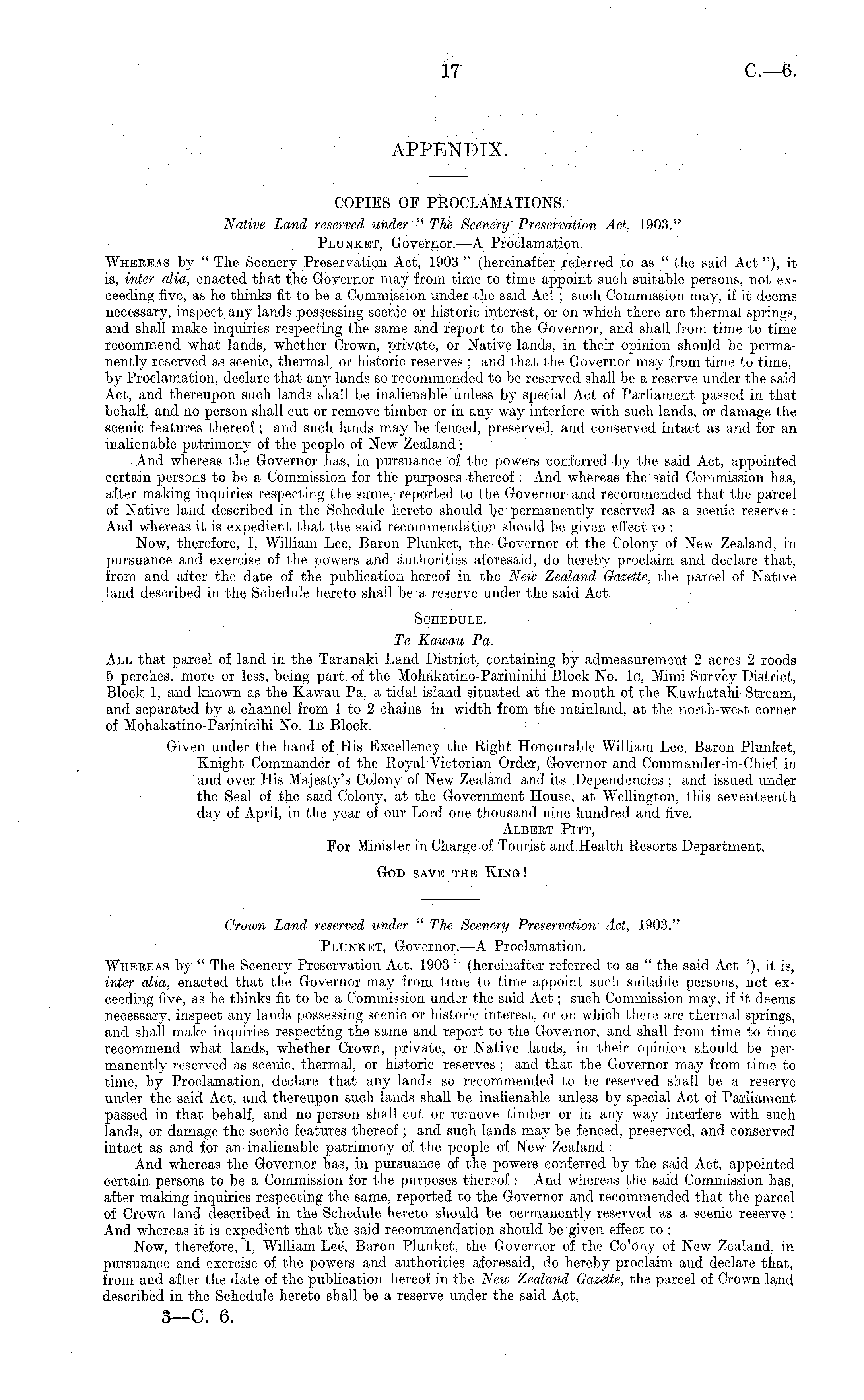 COPIES OF PROCLAMATIONS. Native Land reserved under " The Scenery Preservation Act, 1903." Plunket, Governor. —A Proclamation. Whereas by " The Scenery Preservation Act, 1903 " (hereinafter referred to as " the said Act "), it is, inter alia, enacted that the Governor may from time to time appoint such suitable persons, not exceeding five, as he thinks fit to be a Commission under the said Act; such Commission may, if it deems necessary, inspect any lands possessing scenic or historic interest, or on which there are thermal springs, and shall make inquiries respecting the same and report to the Governor, and shall from time to time recommend what lands, whether Crown, private, or Native lands, in their opinion should be permanently reserved as scenic, thermal, or historic reserves ; and that the Governor may from time to time, by Proclamation, declare that any lands so recommended to be reserved shall be a reserve under the said Act, and thereupon such lands shall be inalienable unless by special Act of Parliament passed in that behalf, and no person shall cut or remove timber or in any way interfere with such lands, or damage the scenic features thereof ; and such lands may be fenced, preserved, and conserved intact as and for an inalienable patrimony of the people of New Zealand: And whereas the Governor has, in pursuance of the powers conferred by the said Act, appointed certain persons to be a Commission for the purposes thereof : And whereas the said Commission has, after making inquiries respecting the same, reported to the Governor and recommended that the parcel of Native land described in the Schedule hereto should be permanently reserved as a scenic reserve : And whereas it is expedient that the said recommendation should be given effect to : Now, therefore, I, William Lee, Baron Plunket, the Governor ot the Colony of New Zealand, in pursuance and exercise of the powers and authorities aforesaid, do hereby proclaim and declare that, from and after the date of the publication hereof in the New Zealand Gazette, the parcel of Native land described in the Schedule hereto shall be a reserve under the said Act. Schedule. Te Kawau Pα. All that parcel of land in the Taranaki Land District, containing by admeasurement 2 acres 2 roods 5 perches, more or less, being part of the Mohakatino-Parininihi Block No. lc, Mimi Survey District, Block 1, and known as the Kawau Pa, a tidal island situated at the mouth of the Kuwhatahi Stream, and separated by a channel from 1 to 2 chains in width from the mainland, at the north-west corner of Mohakatino-Parininihi No. Iβ Block. Given under the hand of His Excellency the Right Honourable William Lee, Baron Plunket, Knight Commander of the Royal Victorian Order, Governor and Commander-in-Chief in and over His Majesty's Colony of New Zealand and its Dependencies ; and issued under the Seal of the said Colony, at the Government House, at Wellington, this seventeenth day of April, in the year of our Lord one thousand nine hundred and five. Albert Pitt, For Minister in Charge of Tourist and Health Resorts Department. God save the King !