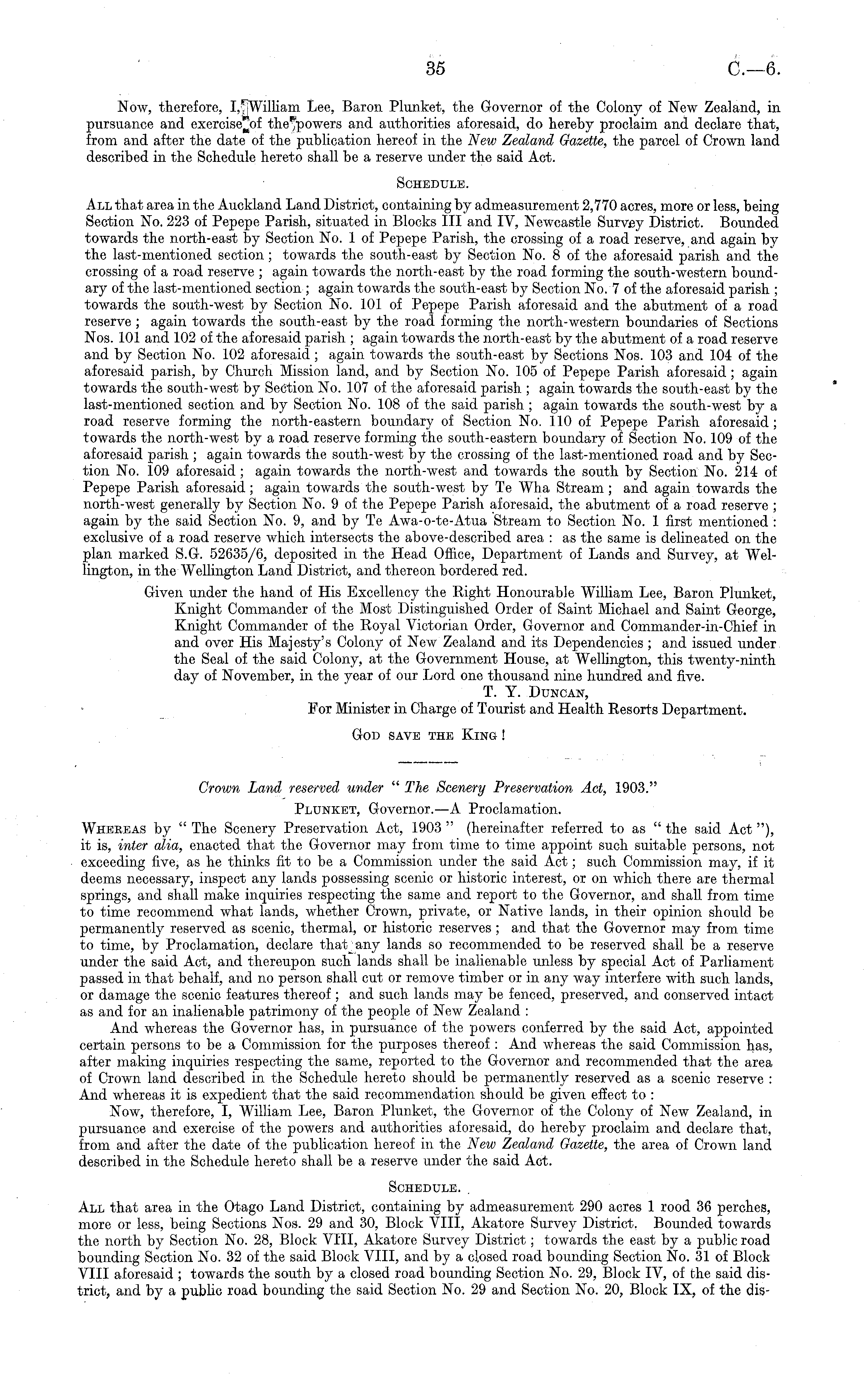 Now, therefore, I,\TWilliam Lee, Baron Plunket, the Governor of. the Colony of New Zealand, in pursuance and exercise M of and authorities aforesaid, do hereby proclaim and declare that, from and after the date of the publication hereof in the New Zealand Gazette, the parcel of Crown land described in the Schedule hereto shall be a reserve under the said Act. Schedule. All that area in the Auckland Land District, containing by admeasurement 2,770 acres, more or less, being Section No. 223 of Pepepe Parish, situated in Blocks 111 and IV, Newcastle Survey District. Bounded towards the north-east by Section No. 1 of Pepepe Parish, the crossing of a road reserve, and again by the last-mentioned section ; towards the south-east by Section No. 8 of the aforesaid parish and the crossing of a road reserve ; again towards the north-east by the road forming the south-western boundary of the last-mentioned section ; again towards the south-east by Section No. 7 of the aforesaid parish ; towards the south-west by Section No. 101 of Pepepe Parish aforesaid and the abutment of a road reserve ; again towards the south-east by the road forming the north-western boundaries of Sections Nos. 101 and 102 of the aforesaid parish ; again towards the north-east by the abutment of a road reserve and by Section No. 102 aforesaid ; again towards the south-east by Sections Nos. 103 and 104 of the aforesaid parish, by Church Mission land, and by Section No. 105 of Pepepe Parish aforesaid ; again towards the south-west by Section No. 107 of the aforesaid parish ; again towards the south-east by the last-mentioned section and by Section No. 108 of the said parish ; again towards the south-west by a road reserve forming the north-eastern boundary of Section No. 110 of Pepepe Parish aforesaid ; towards the north-west by a road reserve forming the south-eastern boundary of Section No. 109 of the aforesaid parish ; again towards the south-west by the crossing of the last-mentioned road and by Section No. 109 aforesaid ; again towards the north-west and towards the south by Section No. 214 of Pepepe Parish aforesaid ; again towards the south-west by Te Wha Stream ; and again towards the north-west generally by Section No. 9 of the Pepepe Parish aforesaid, the abutment of a road reserve ; again by the said Section No. 9, and by Te Awa-o-te-Atua Stream to Section No. 1 first mentioned : exclusive of a road reserve which intersects the above-described area : as the same is delineated on the plan marked S.G. 52635/6, deposited in the Head Office, Department of Lands and Survey, at Wellington, in the Wellington Land District, and thereon bordered red. Given under the hand of His Excellency the Right Honourable William Lee, Baron Plunket, Knight Commander of the Most Distinguished Order of Saint Michael and Saint George, Knight Commander of the Royal Victorian Order, Governor and Commander-in-Chief in and over His Majesty's Colony of New Zealand and its Dependencies ; and issued under the Seal of the said Colony, at the Government House, at Wellington, this twenty-ninth day of November, in the year of our Lord one thousand nine hundred and five. T. Y. Duncan, For Minister in Charge of Tourist and Health Resorts Department. God save the King !