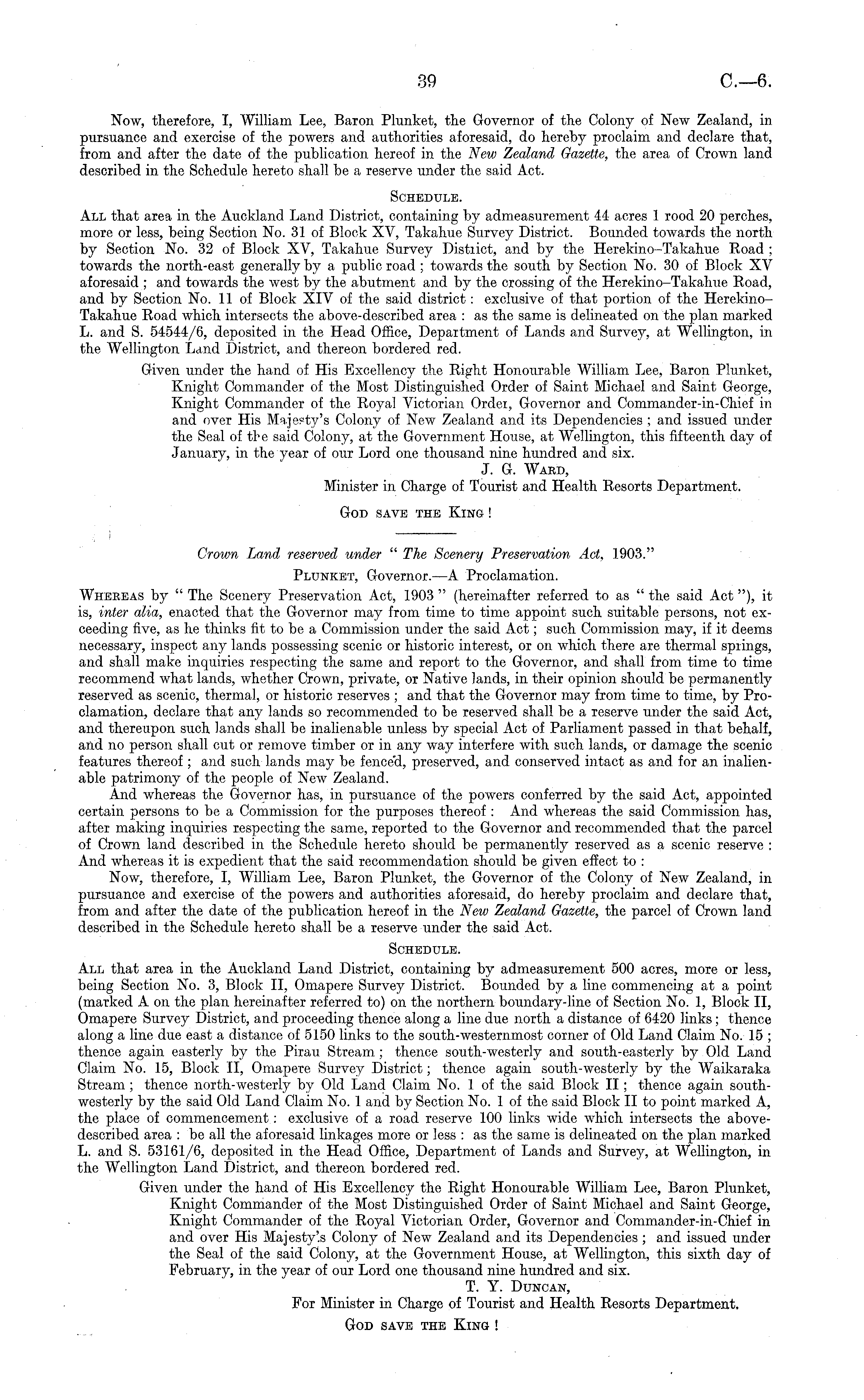 Crown Land reserved under " The Scenery Preservation Act, 1903." Plunket, Governor. —A Proclamation. Wheeeas by " The Scenery Preservation Act, 1903 " (hereinafter referred to as " the said Act "), it is, inter alia, enacted that the Governor may from time to time appoint such suitable persons, not exceeding five, as he thinks fit to be a Commission under the said Act; such Commission may, if it deems necessary, inspect any lands possessing scenic or historic interest, or on which there are thermal springs, and shall make inquiries respecting the same and report to the Governor, and shall from time to time recommend what lands, whether Crown, private, or Native lands, in their opinion should be permanently reserved as scenic, thermal, or historic reserves ; and that the Governor may from time to time, by Proclamation, declare that any lands so recommended to be reserved shall be a reserve under the said Act, and thereupon such lands shall be inalienable unless by special Act of Parliament passed in that behalf, and no person shall cut or remove timber or in any way interfere with such lands, or damage the scenic features thereof ; and such lands may be fenced, preserved, and conserved intact as and for an inalienable patrimony of the people of New Zealand. And whereas the Governor has, in pursuance of the powers conferred by the said Act, appointed certain persons to be a Commission for the purposes thereof : And whereas the said Commission has, after making inquiries respecting the same, reported to the Governor and recommended that the parcel of Crown land described in the Schedule hereto should be permanently reserved as a scenic reserve : And whereas it is expedient that the said recommendation should be given effect to : Now, therefore, I, William Lee, Baron Plunket, the Governor of the Colony of New Zealand, in pursuance and exercise of the powers and authorities aforesaid, do hereby proclaim and declare that, from and after the date of the publication hereof in the New Zealand Gazette, the parcel of Crown land described in the Schedule hereto shall be a reserve under the said Act. Schedule. All that area in the Auckland Land District, containing by admeasurement 500 acres, more or less, being Section No. 3, Block 11, Omapere Survey District. Bounded by a line commencing at a point (marked A on the plan hereinafter referred to) on the northern boundary-line of Section No. 1, Block 11, Omapere Survey District, and proceeding thence along a line due north a distance of 6420 links; thence along a line due east a distance of 5150 links to the south-westernmost corner of Old Land Claim No. 15 ; thence again easterly by the Pirau Stream ; thence south-westerly and south-easterly by Old Land Claim No. 15, Block 11, Omapere Survey District; thence again south-westerly by the Waikaraka Stream ; thence north-westerly by Old Land Claim No. lof the said Block II; thence again southwesterly by the said Old Land Claim No. 1 and by Section No. 1 of the said Block II to point marked A, the place of commencement: exclusive of a road reserve 100 links wide which intersects the abovedescribed area : be all the aforesaid linkages more or less : as the same is delineated on the plan marked L. and S. 53161/6, deposited in the Head Office, Department of Lands and Survey, at Wellington, in the Wellington Land District, and thereon bordered red. Given under the hand of His Excellency the Right Honourable William Lee, Baron Plunket, Knight Commander of the Most Distinguished Order of Saint Michael and Saint George, Knight Commander of the Royal Victorian Order, Governor and Commander-in-Chief in and over His Majesty'.s Colony of New Zealand and its Dependencies ; and issued under the Seal of the said Colony, at the Government House, at Wellington, this sixth day of February, in the year of our Lord one thousand nine hundred and six. T. Y. Duncan, For Minister in Charge of Tourist and Health Resorts Department. God save the King !