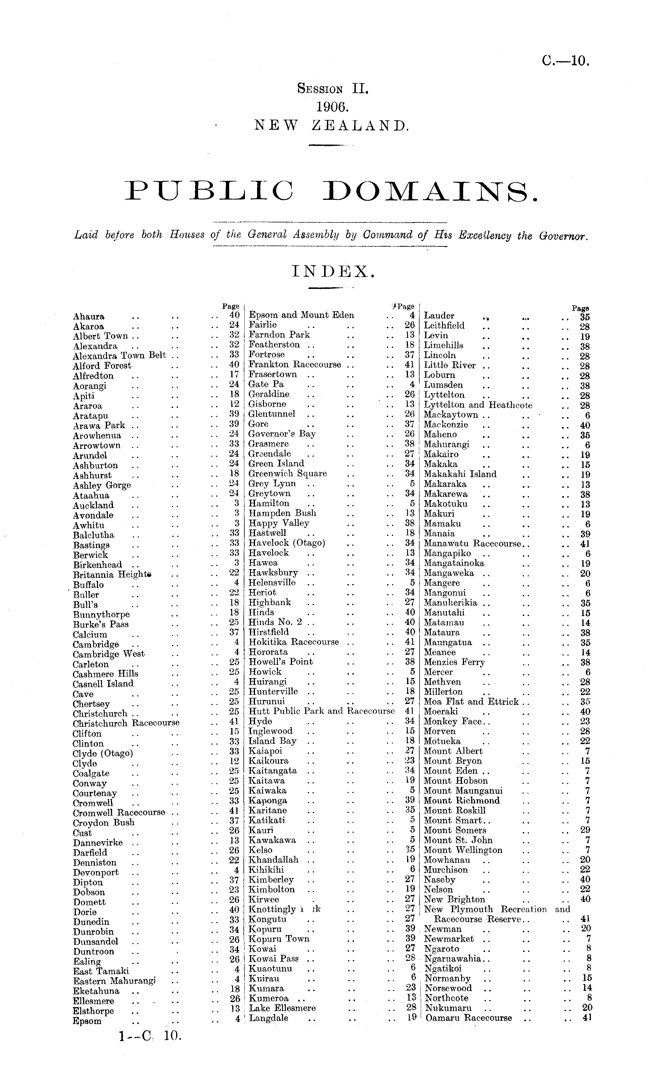 Page fPage Pago Ahaura .. .. .. 40 Epsom and Mount Eden .. 4 Lauder ~ ... .. 35 Akaroa . • . • .. 24 Fairlie .. .. .. 26 Leithfield .. .. .. 28 Albert Town .. .. . . 32 Farndon Park .. .. 13 Levin .. .. .. 19 Alexandra .. .. .. 32 Featherston .. .. .. 18 Limehills .. .. .. 38 Alexandra Town Belt .. .. 33 Fortroso .. .. .. 37 Lincoln .. .. .. 28 Alford Forest .. . . 40 Frankton Racecourse .. .. 41 Little River .. .. .. 28 Alfredton .. .. .. 17 Frasertown .. .. .. 13 Loburn .. .. .. 28 Aorangi .. .• .. 24 Gate Pa .. .. .. 4 Lumsden .. .. .. 38 Apiti .. . ■ .. 18 Geraldine .. .. .. 26 Lyttelton .. .. .. 28 Araroa '.. .. .. 12 Gisborne .. .. .. 13 Lyttelton and Heathcote .. 28 Aratapu .. .. .. 39 Glentunnel .. .. .. 26 Mackaytown .. .. • .. 6 Arawa Park .. .. .. 39 Gore .. .. .. 37 Mackenzie .. .. .. 40 Arowhenua .. .. .. 24 Governor's Bay .. .. 26 Maheno .. .. .. 35 Arrowtown .. .. .. 33 Grasmere .. .. .. 38 Mahurangi .. .. .. 6 Arundel .. .. .. 24 Greendale .. .. .. 27 Makairo .. .. .. 19 Ashburton . . .. .. 24 Green Island .. . . 34 Makaka .. .. .. 15 Ashhurst .. .. .. 18 Greenwich Square .. .. 34 Makakahi Island .. .. 19 Ashley Gorge .. .. 24 Grey Lynn .. .. .. 5 Makaraka .. .. .. 13 Ataahua .. ■ • .. 24 Greytown .. .. .. 34 Makarewa .. .. .. 38 Auckland .. • ■ . . 3 Hamilton .. .. .. 5 Makotuku .. .. 13 Avondale .. .. ..3 Hampden Bush .. ..13 Makuri .. .. ..19 Awhitu . . • • .. 3 Happy Valley .. .. 38 Mamaku .. .. .. 6 Balclutha . . . ■ .. 33 Hastwell .. .. .. 18 Manaia .. .. .. 39 Bastings .. •• ..33 Havelock (Otago) .. ..34 Manawatu Racecourse.. .. 41 Berwick .. • • .. 33 Havelock .. .. 13 Mangapiko .. .. .. 6 Birkenhead .. .. .. 3 Hawea .. .. 34 Mangatainoka .. 19 Britannia Height* .. .. 22 Hawksbury .. .. .. 34 Mangaweka .. . . .. 20 Buffalo .. •• ..4 Helensville .. .. ..5 Mangere .. .. ..6 Buller .. .. .. 22 Heriot .. .. 34 Mangonui .. .. .. 6 Bull's .. .. 18 Highbank .. .. .. 27 Manuherikia .. .. .. 35 Bunnythorpe .. .. -18 Hinds .. .. .. 40 Manutahi .. .. 15 Burkes Pass .. .. 25 Hinds No. 2 . . .. .. 40 Matamau .. .. 14 Calcium . . • • .. 37 Hirstfield .. .. .. 40 Mataura .. .. .. 38 Cambridge .. •• .. 4 Hokitika Racecourse .. .. 41 Maungatua .. .. .. 35 Cambridge West .. .. 4 Hororata .. .. .. 27 Meanee .. .. .. 14 Carleton .. . • .. 25 Howell's Point .. .. 38 Menzies Ferry .. .. 38 Cashmere Hills .. . . 25 Howick .. .. .. 5 Mercer .. .. 6 Casnell Island .. .. 4 Huirangi .. .. .. 15 Methven . . .. .. 28 o ave .. .. .. 25 Hunterville .. .. . . 18 Millerton .. .. .. 22 Chertsey .. •■ .. 25 Hurunui .. .. .. 27 Moa Flat and Ettrick .. .. 35 Christchurch . . . . .. 25 Hutt Public Park and Racecourse 41 Moeraki .. .. .. 40 Christchurch Racecourse .. 41 Hyde .. . . .. 34 Monkey Face.. .. .. 23 Clifton .. •• ..15 Inglewood .. .. ..15 Morven .. .. ..28 Clinton .. • • . . 33 Island Bay . . .. 18 Motueka .. .. .. 22 Clyde (Otago) • • . . 33 Kaiapoi .. .. .. 27 Mount Albert .. .. 7 Clyde- .. .. 12 Kaikoura .. .. 23 Mount Bryon .. 15 Coalgate . . • • . . 25 Kaitangata .. .. 34 Mount Eden .. .. .. 7 Conway .. • • .. 25 Kaitawa .. .. 19 Mount Hobson .. .. 7 Courtenay .. •• .. 25 Kaiwaka .. .. .. 5 Mount Maunganui .. .. 7 Cromwell .. • • .. 33 Kaponga .. .. 39 Mount Richmond .. .. 7 Cromwell Racecourse .. .. 41 Karitane .. .. .. 35 Mount Roskill .. .. 7 Croydon Bush .. .. 37 Katikati .. .. .. 5 Mount Smart.. .. .. 7 Q ua t , , .. . . 26 Kauri .. .. .. 5 Mount Somers .. 29 Dannevirke .. • • .. 13 Kawakawa .. .. .. 5 Mount St. John .. .. 7 Darfield . . • • .. 26 Kelso .. .. 35 Mount Wellington .. .. 7 Denniston .. • • .. 22 Khandallah .. .. ..19 Mowhanau .. .. .. 20 Devonport ..• • .. 4 Kihikihi .. .. .. 6 Murchison .. . . .. 22 Dipton • • .. 37 Kimberley .. .. .. 27 Naseby .. .. .. 40 Dobson '.'. ■■ .. 23 Kimbolton .. . . .. 19 Nelson .. .. .. 22 Domett .. • • .. 26 Kirwee . .. 27 New Brighton .. .. 40 j) or ; e .. .. .. 40 Knottingly i rk .. 27 New Plymouth Recreation and Dunedin •• ..33 Kongutu .. .. ..27 Racecourse Reserve.. .. 41 Dunrobin .. • • .. 34 Kopuru .. .. 39 Newman .. .. .. 20 Dunsandel .. .. .. 26 Kopuru Town .. 39 Newmarket .. .. .. 7 Duntroon '.'. ..34 Kowai .. .. . .27 Ngaroto .. .. ..8 Ealing .. •• ..26 Kowai Pass .. .. ..28 Ngaruawahia.. .. ..8 East Tamaki " .. .. 4 Kuaotunu .. .. .. 6 Ngatikoi .. .. .. 8 Eastern Mahurangi .. .. 4 Kuirau .. .. .. b Normanby .. .. .. 15 Eketahuna .. .. .. 18 Kumara .. .. .. 23 Norsewood .. .. 14 Ellesmere ..26 Kumeroa .. .. ..13 Northcote .. .. ..8 Elsthorpe .. . • .. 18 Lake Ellesmere .. .. 28 Nukumaru .. .. .. 20 Epsom .•• • * ' L an gcl a l e .. .. 19 Oamaru Racecourse .. .. 41 I—a 10.