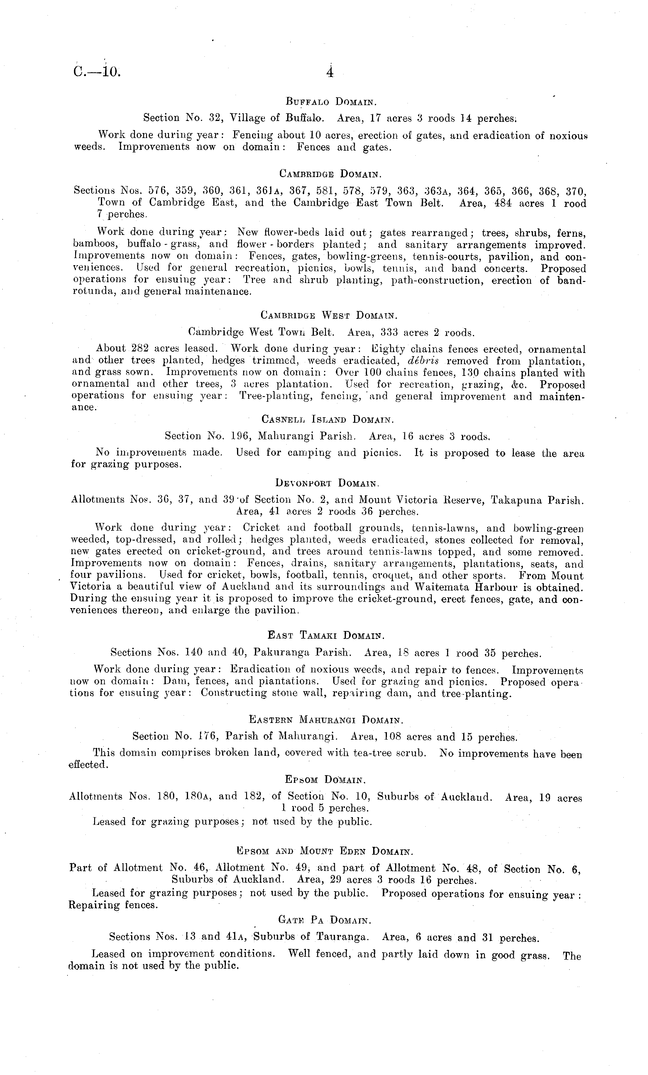 Buffalo Domain. Section No. 32, Village of Buffalo. Area, 17 acres 3 roods 14 perches. Work done during year: Fencing about 10 acres, erection of gates, and eradication of noxious weeds. Improvements now on domain : Fences and gates. Cambridge Domain. Sections Nos. 576, 359, 360, 361, 361 a, 367, 581, 578, 579, 363, :363a, 364, 365, 366, 368, 370, Town of Cambridge East, and the Cambridge East Town Belt. Area, 484 acres 1 rood 7 perches. Work done (hiring year: New flower-beds laid out; gates rearranged; trees, shrubs, ferns, bamboos, buffalo - grass, and flower - borders planted; and sanitary arrangements improved. Improvements now on domain: Fences, gates, bowling-greens, tennis-courts, pavilion, and conveniences. Used for general recreation, picnics, bowls, tenuis, and band concerts. Proposed operations for ensuing year: Tree and shrub planting, path-construction, erection of bandrotunda, and general maintenance. Cambiudgb West Domain. Cambridge West Town Belt. Area, 333 acres 2 roods. About 282 acres leased. Work done during year: Eighty chains fences erected, ornamental and other trees planted, hedges trimmed, weeds eradicated, debris removed from plantation, and grass sown. Improvements now on domain: Over 100 chains fences, 130 chains planted with ornamental and other trees, 3 acres plantation. Used for recreation, grazing, &c. Proposed operations for ensuing year: Tree-planting, fencing, and general improvement and maintenance. Casnell Island Domain. Section No. 196, Malmrangi Parish. Area, 16 acres 3 roods. No improvements made. Used for camping and picnics. It is proposed to lease the area for grazing purposes. Devonport Domain. Allotments Nos. 3G, 37, and 39 of Section No. 2, and Mount Victoria Keserve, Takapuna Parish. Area, 41 acres 2 roods 36 perches. Work done during year: Cricket and football grounds, tennis-lawns, and bowling-green weeded, top-dressed, and rolled; hedges planted, weeds eradicated, stones collected for removal, new gates erected on cricket-ground, and trees around tennis-lawns topped, and some removed. Improvements now on domain : Fences, drains, sanitary arrangements, plantations, seats, and four pavilions. Used for cricket, bowls, football, tennis, croquet, and other sports. From Mount Victoria a beautiful view of Auckland and its surroundings and Waitemata Harbour is obtained. During the ensuing year it is proposed to improve the cricket-ground, erect fences, gate, and conveniences thereon, and enlarge the pavilion. East Tamaki Domain. Sections Nos. 140 and 40, Pakuranga Parish. Area, 18 acres 1 rood 35 perches. Work done during year : Eradication of noxious weeds, and repair to fences. Improvements now on domain: Dam, fences, and plantations. Used for grazing and picnics. Proposed operations for ensuing year : Constructing stone wall, repairing dam, and tree-planting. Eastern Mahurangi Doaiain. Section No. 176, Parish of Mahurangi. Area, 108 acres and 15 perches. This domain comprises broken land, covered with tea-tree scrub. No improvements have been effected. Epsom Domain. Allotments Nos. 180, 180 a, and 182, of Section No. 10, Suburbs of Auckland. Area, 19 acres 1 rood 5 perches. Leased for grazing purposes; not used by the public. Epsom and Mount Eden Domain. Part of Allotment No. 46, Allotment No. 49, and part of Allotment No. 48, of Section No. 6, Suburbs of Auckland. Area, 29 acres 3 roods 16 perches. Leased for grazing purposes; not used by the public. Proposed operations for ensuing year : Repairing fences. Gate Pα Domain. Sections Nos. 13 and 41a, Suburbs of Tauranga. Area, 6 acres and 31 perches. Leased on improvement conditions. Well fenced, and partly laid down in good grass. The domain is not used by the public.
