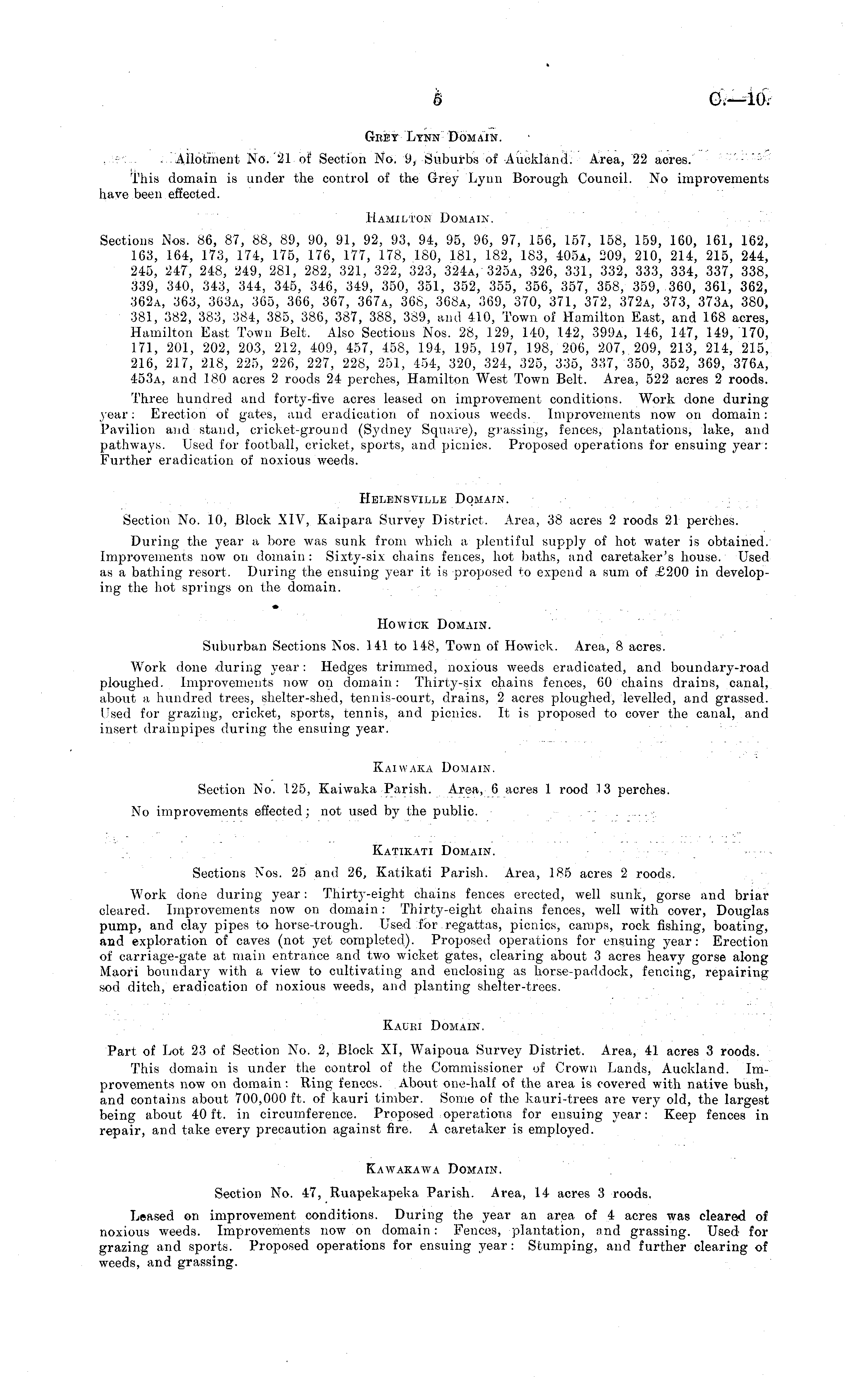 Grey Lynn Domain. . Allotment No. '21 of Section No. 9, Suburbs of Auckland. Area, 22 acres. This domain is under the control of the Grey Lynn Borough Council. No improvements have been effected. Hamilton Domain. Sections Nob. 86, 87, 88, 89, 90, 91, 92, 93, 94, 95, 96, 97, 156, 157, 158, 159, 160, 161, 162, 163, 164, 173, 174, 175, 176, 177, 178, 180, 181, 182, 183, 405 a, 209, 210, 214, 215, 244, 245, 247, 248, 249, 281, 282, 321, 322, 323, 324 a, 325 a, 326, 331, 332, 333, 334, 337, 338, 339, 340, 343, 344, 345, 346, 349, 350, 351, 352, 355, 356, 357, 358, 359, 360, 361, 362, 362 a, 363, 363 a, 365, 366, 367, 367 a, 368, 368 a, 369, 370, 371, 372, 372 a, 373, 373 a, 380, 381, 382, 383, 384, 385, 386, 387, 388, 339, and 410, Town of Hamilton East, and 168 acres, Hamilton East Town Belt. Also Sections Nos. 28, 129, 140, 142, 399 a, 146, 147, 149, 170, 171, 201, 202, 203, 212, 409, 457, 458, 194, 195, 197, 198, 206, 207, 209, 213, 214, 215, 216, 217, 218, 225, 226, 227, 228, 251, 454, 320, 324, 325, 335, 337, 350, 352, 369, 376 a, 453 a, and 180 acres 2 roods 24 perches, Hamilton West Town Belt. Area, 522 acres 2 roods. Three hundred and forty-five acres leased on improvement conditions. Work done during year: Erection of gates, and eradication of noxious weeds. Improvements now on domain: Pavilion and stand, cricket-ground (Sydney Square), grassing, fences, plantations, lake, and pathways. Used for football, cricket, sports, and picnics. Proposed operations for ensuing year : Further eradication of noxious weeds. Helens ville Domain. Section No. 10, Block XIV, Kaipara Survey District. Area, 38 acres 2 roods 21 perches. During the year a bore was sunk from which a plentiful supply of hot water is obtained. Improvements now on domain : Sixty-six chains fences, hot baths, and caretaker's house. Used as a bathing resort. During the ensuing year it is proposed to expend a sum of £200 in developing the hot springs on the domain. Ho wick Domain. Suburban Sections Nos. 141 to 148, Town of Howick. Area, 8 acres. Work done during year: Hedges trimmed, noxious weeds eradicated, and boundary-road ploughed. Improvements now on domain: Thirty-six chains fences, 60 chains drains, canal, about a hundred trees, shelter-shed, tennis-court, drains, 2 acres ploughed, levelled, and grassed. I'sed for grazing, cricket, sports, tennis, and picnics. It is proposed to cover the canal, and insert drainpipes during the ensuing j'ear. Kaiwaka Domain. Section No. 125, Kaiwaka Parish. Area, 6 acres 1 rood 13 perches. No improvements effected; not used by the public. Katikati Domain. Sections Nos. 25 and 26, Katikati Parish. Area, 185 acres 2 roods. Work done during year: Thirty-eight chains fences erected, well sunk, gorse and briar cleared. Improvements now on domain : Thirty-eight chains fences, well with cover, Douglas pump, and clay pipes to horse-trough. Used for regattas, picnics, camps, rock fishing, boating, and exploration of caves (not yet completed). Proposed operations for ensuing year: Erection of carriage-gate at main entrance and two wicket gates, clearing about 3 acres heavy gorse along Maori boundarj' with a view to cultivating and enclosing as horse-paddock, fencing, repairing sod ditch, eradication of noxious weeds, and planting shelter-trees. Kauri Domain. Part of Lot 23 of Section No. 2, Block XI, Waipoua Survey District. Area, 41 acres 3 roods. This domain is under the control of the Commissioner of Crown Lands, Auckland. Improvements now on domain : Ring fences. About one-half of the area is covered with native bush, and contains about 700,000 ft. of kauri timber. Some of the kauri-trees are very old, the largest being about 40 ft. in circumference. Proposed operations for ensuing year: Keep fences in repair, and take every precaution against fire. A caretaker is employed. Kawaeawa Domain. Section No. 47, Ruapekapeka Parish. Area, 14 acres 3 roods. Leased on improvement conditions. During the year an area of 4 acres was cleared of noxious weeds. Improvements now on domain: Fences, plantation, smd grassing. Used for grazing and sports. Proposed operations for ensuing year: Stumping, and further clearing of weeds, and grassing.