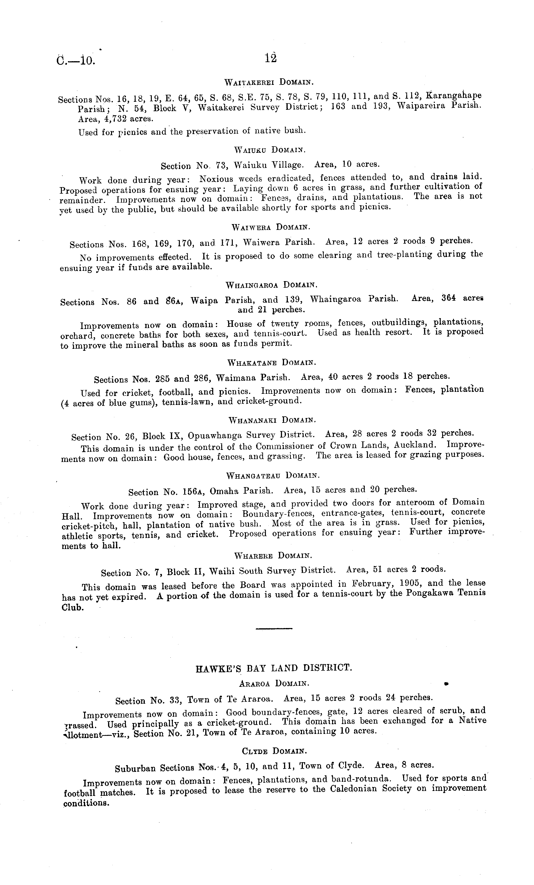 Waitakerei Domain. Sections Nob, 16, 18, 19, E. 64, 65, S. 68, S.E. 75, S. 78, S. 79, 110, 111, and S. 112, Karangahape Parish; N. 54, Block V, Waitakerei Survey District; 163 and 193, Waipareira Parish. Area, 4,732 acres. Used for picnics and the preservation of native bush. Waiuko Domain. Section No. 73, VVaiuku Village. Area, 10 acres. Work done during year: Noxious weeds eradicated, fences attended to, and drains laid. Proposed operations for ensuing year: Laying down 6 acres in grass, and further cultivation of remainder. Improvements now on domain: Fences, drains, and plantations. The area is not yet used by the public, but should be available shortly for sports and picnics. Waiweka Domain. Sections Nos. 168, 169, 170, and 171, Waiwera Parish. Area, 12 acres 2 roods 9 perches. No improvements effected. It is proposed to do some clearing and tree-planting during the ensuing year if funds are available. Whaingaroa Domain. Sections Nos. 86 and B"6a, Waipa Parish, and 139, Whaingaroa Parish. Area, 364 acres and 21 perches. Improvements now on domain: House of twenty rpoms, fences, outbuildings, plantations, orchard, concrete baths for both sexes, and tennis-court. Used as health resort. It is proposed to improve the mineral baths as soon as funds permit. Whakatane Domain. Sections Nos. 285 and 286, Waimana Parish. Area, 40 acres 2 roods 18 perches. Used for cricket, football, and picnics. Improvements now on domain: Fences, plantation (4 acres of blue gums), tennis-lawn, and cricket-ground. Whananaki Domain. Section No. 26, Block IX, Opuawhanga Survey District. Area, 28 acres 2 roods 32 perches. This domain is under the control of the Commissioner of Crown Lands, Auckland. Improvements now on domain: Good house, fences, and grassing. The area is leased for grazing purposes. Whangateau Domain. Section No. 156 a, Omaha Parish. Area, 15 acres and 20 perches. Work done during year: Improved stage, and provided two doors for anteroom of Domain Hall Improvements now on domain: Boundary-fences, entrance-gates, tennis-court, concrete cricket-pitch hall, plantation of native bush. Most of the area is in grass. Used for picnics, athletic sports, tennis, and cricket. Proposed operations for ensuing year: Further improvements to hall. Wharere Domain. Section No. 7, Block 11, Waihi South Survey District. Area, 51 acres 2 roods. This domain was leased before the Board was appointed in February, 1905, and the lease has not yet expired. A portion of the domain is used for a tennis-court by the Pongakawa lennis Club.