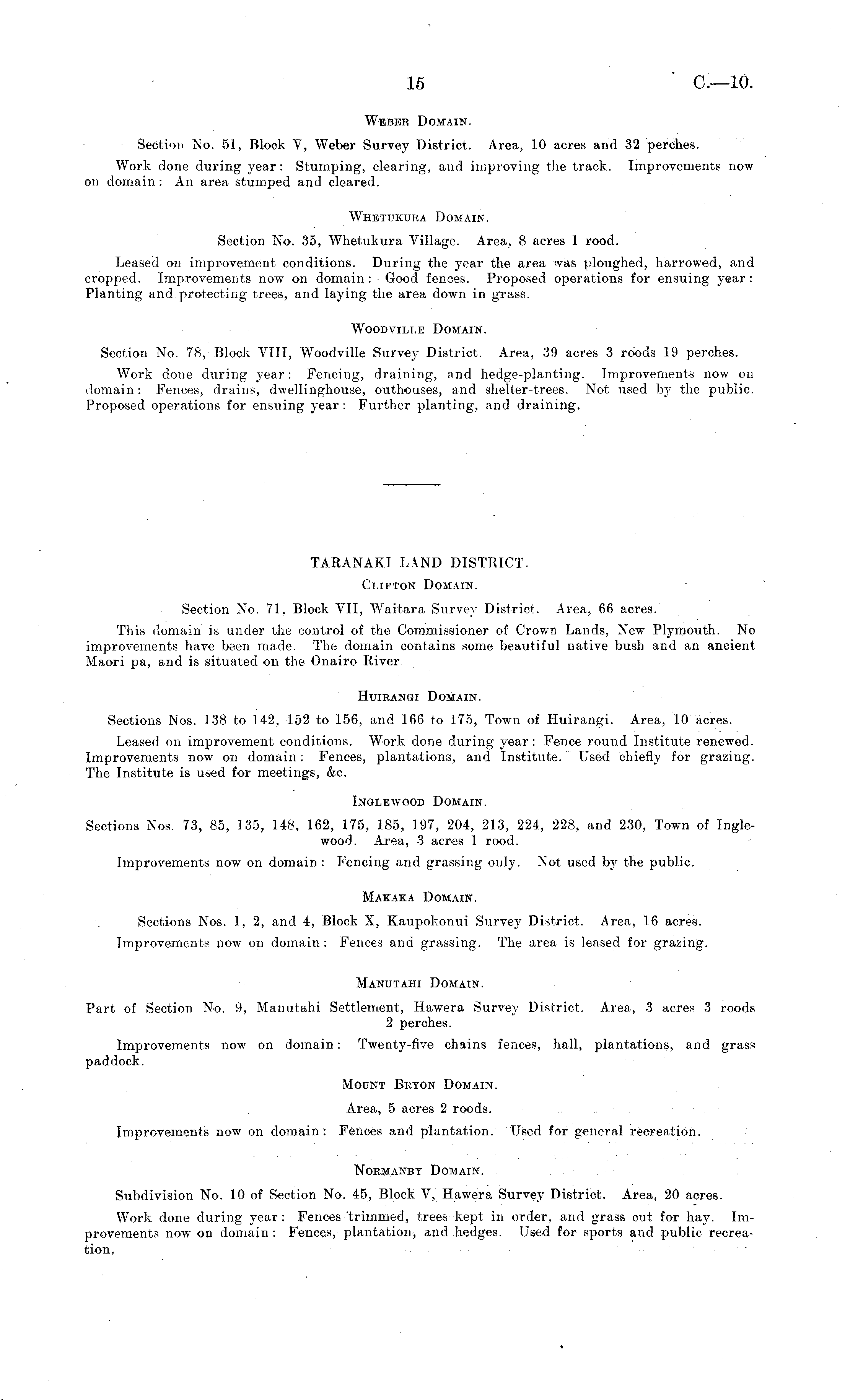 Weber Domain. Section No. 51, Block V, Weber Survey District. Area, 10 acres and 32 perches. Work done during year: Stumping, clearing, and improving the track. Improvements now on domain : An area stumped and cleared. Whetukitra Domain. Section No. 35, Whetukura Village. Area, 8 acres 1 rood. Leased on improvement conditions. During the year the area <vas ploughed, harrowed, and cropped. Improvements now on domain : Good fences. Proposed operations for ensuing year: Planting and protecting trees, and laying the area down in grass. Woodvilt.e Domain. Section No. 78, Block VIII, Woodville Survey District. Area, 39 acres 3 roods 19 perches. Work done during year: Fencing, draining, and hedge-planting. Improvements now on domain: Fences, drains, dwellinghouse, outhouses, and shelter-trees. Not used by the public. Proposed operations for ensuing year : Further planting, and draining.
