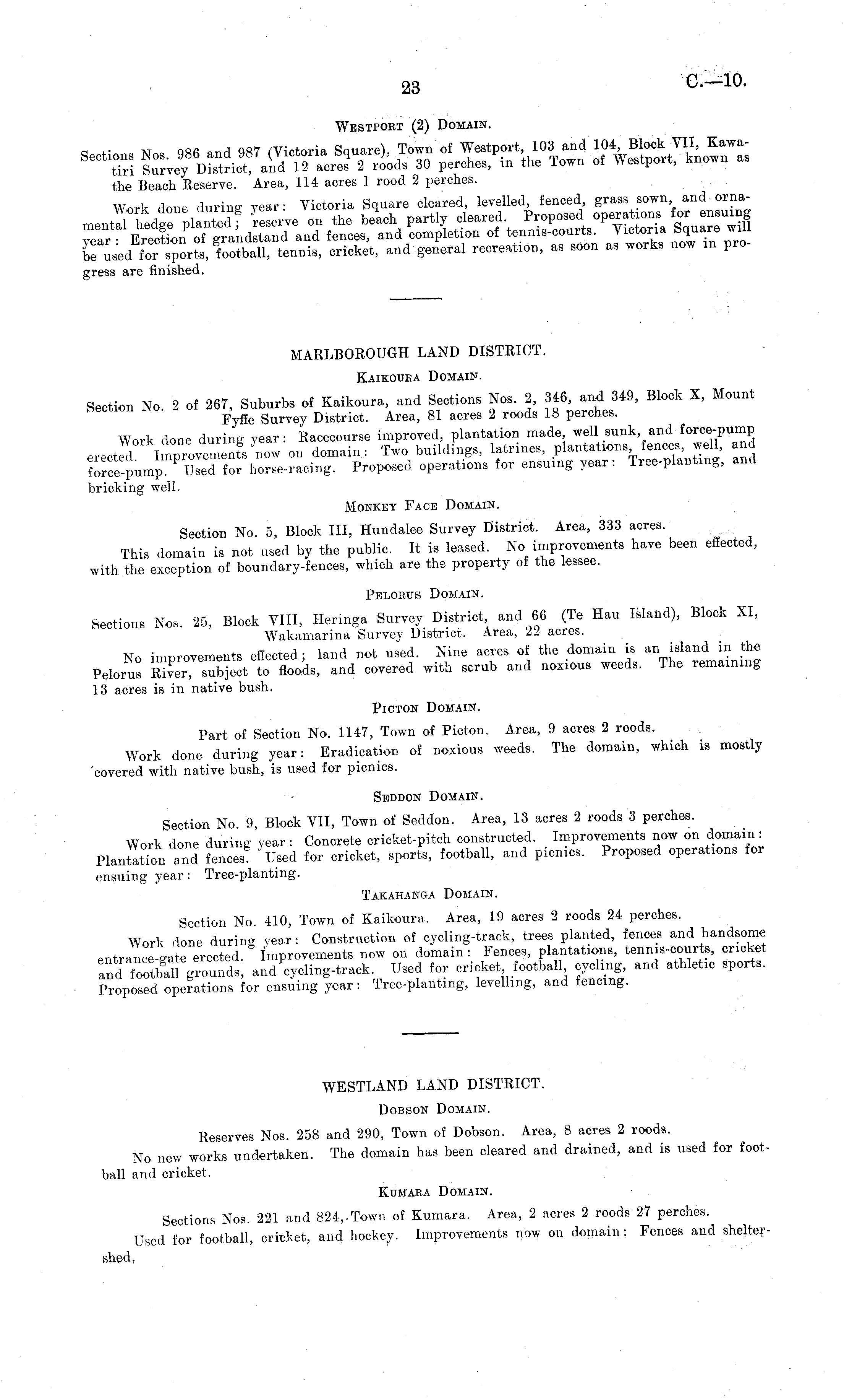 WESTLAND LAND DISTRICT. Dobson Domain. Reserves Nos. 258 and 290, Town of Dobson. Area, 8 acres 2 roods. No new works undertaken. The domain has been cleared and drained, and is used for football and cricket, Kumara Domain. Sections Nos. 221 and 824,.T0wn of Kumara. Area, 2 acres 2 roods 27 perches. Used for football, cricket, and hockey. Improvements now on domain: Fences and shelter shed,