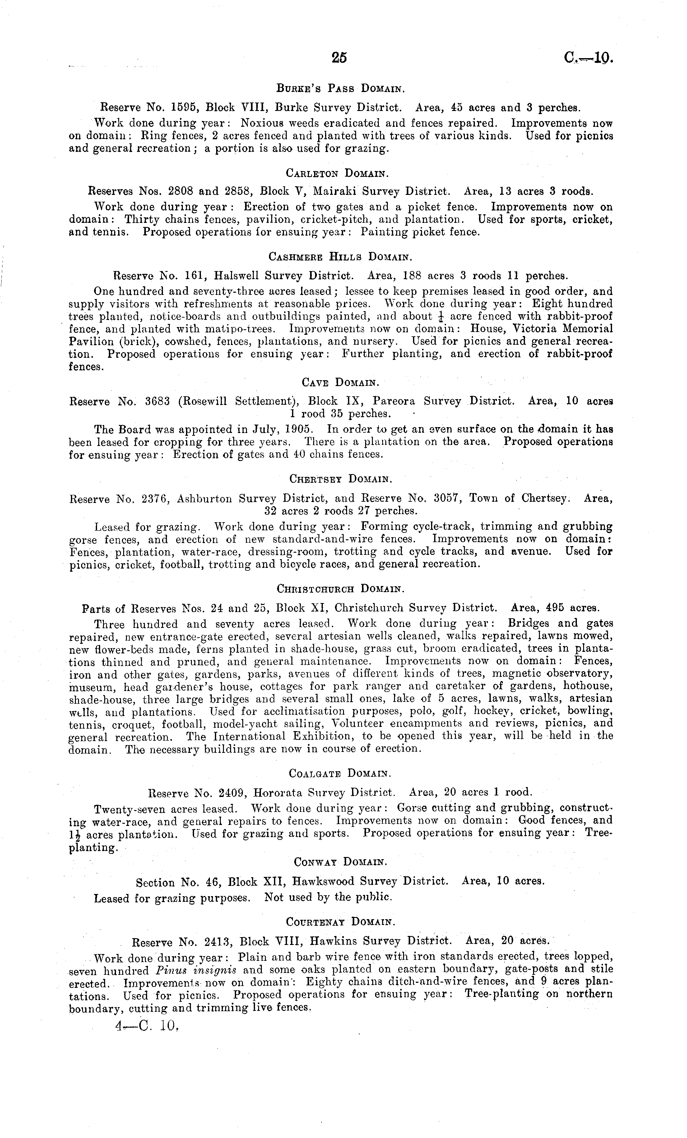 Burkes Pass Domain. Reserve No. 1595, Block VIII, Burke Survey District. Area, 45 acres and 3 perches. Work done during year : Noxious weeds eradicated and fences repaired. Improvements now on domain : Ring fences, 2 acres fenced and planted with trees of various kinds. Used for picnics and general recreation; a portion is also used for grazing. Carleton Domain. Reserves Nos. 2808 and 2858, Block V, Mairaki Survey District. Area, 13 acres 3 roods. Work done during year : Erection of two gates and a picket fence. Improvements now on domain: Thirty chains fences, pavilion, cricket-pitch, and plantation. Used for sports, cricket, and tennis. Proposed operations for ensuing year : Painting picket fence. Cashmere Hills Domain. Reserve No. 161, Halswell Survey District. Area, 188 acres 3 roods 11 perches. One hundred and seventy-three acres leased; lessee to keep premises leased in good order, and supply visitors with refreshments at reasonable prices. Work done during year: Eight hundred trees planted, notice-boards and outbuildings painted, and about J acre fenced with rabbit-proof fence, and planted with matipo-trees. Improvements now on domain : House, Victoria Memorial Pavilion (brick), cowshed, fences, plantations, and nursery. Used for picnics and general recreation. Proposed operations for ensuing year: Further planting, and erection of rabbit-proof fences. Cave Domain. Reserve No. 3683 (Rosewill Settlement), Block IX, Pareora Survey District. Area, 10 acres 1 rood 35 perches. The Board was appointed in July, 1905. In order to get an even surface on the domain it has been leased for cropping for three years. There is a plantation on the area. Proposed operations for ensuing year : Erection of gates and 40 chains fences. Chertsey Domain. Reserve No. 2376, Ashburton Survey District, and Reserve No. 3057, Town of Chertsey. Area, 32 acres 2 roods 27 perches. Leased for grazing. Work done during year: Forming cycle-track, trimming and grubbing gorse fences, and erection of new standard-and-wire fences. Improvements now on domain: Fences, plantation, water-race, dressing-room, trotting and cycle tracks, and avenue. Used for picnics, cricket, football, trotting and bicycle races, and general recreation. Christchurch Domain. Parts of Reserves Nos. 24 and 25, Block XI, Christchurch Survey District. Area, 495 acres. Three hundred and seventy acres leased. Work done during year: Bridges and gates repaired, new entrance-gate erected, several artesian wells cleaned, walks repaired, lawns mowed, new flower-beds made, ferns planted in shade-house, grass cut, broom eradicated, trees in plantations thinned and pruned, and general maintenance. Improvements now on domain: Fences, iron and other gates, gardens, parks, avenues of different kinds of trees, magnetic observatory, museum, head gaidener's house, cottages for park ranger and caretaker of gardens, hothouse, shade-house, three large bridges and several small ones, lake of 5 acres, lawns, walks, artesian wtlls, and plantations. Used for acclimatisation purposes, polo, golf, hockey, cricket, bowling, tennis, croquet, football, model-yacht sailing, Volunteer encampments and reviews, picnics, and general recreation. The International Exhibition, to be opened this year, will be held in the domain. The necessary buildings are now in course of erection. Coalgate Domain. Reserve No. 2409, Hororata Survey District. Area, 20 acres 1 rood. Twenty-seven acres leased. Work done during year: Gorse cutting and grubbing, constructing water-race, and general repairs to fences. Improvements now on domain: Good fences, and 1| acres plantation. Used for grazing and sports. Proposed operations for ensuing year: Treeplanting. Conway Domain. Section No. 46, Block XII, Hawkswood Survey District. Area, 10 acres. Leased for grazing purposes. Not used by the public. Courtenay Domain. Reserve No. 241.3, Block VIII, Hawkins Survey District. Area, 20 acres. Work done during year: Plain and barb wire fence with iron standards erected, trees lopped, seven hundred Pinus insignis and some oaks planted on eastern boundary, gate-posts and stile erected. Improvements-now on domain': Eighty chains ditch-and-wire fences, and 9 acres plantations. Used for picnics. Proposed operations for ensuing year: Tree-planting on northern boundary, cutting and trimming live fences. 4r-C. 10,