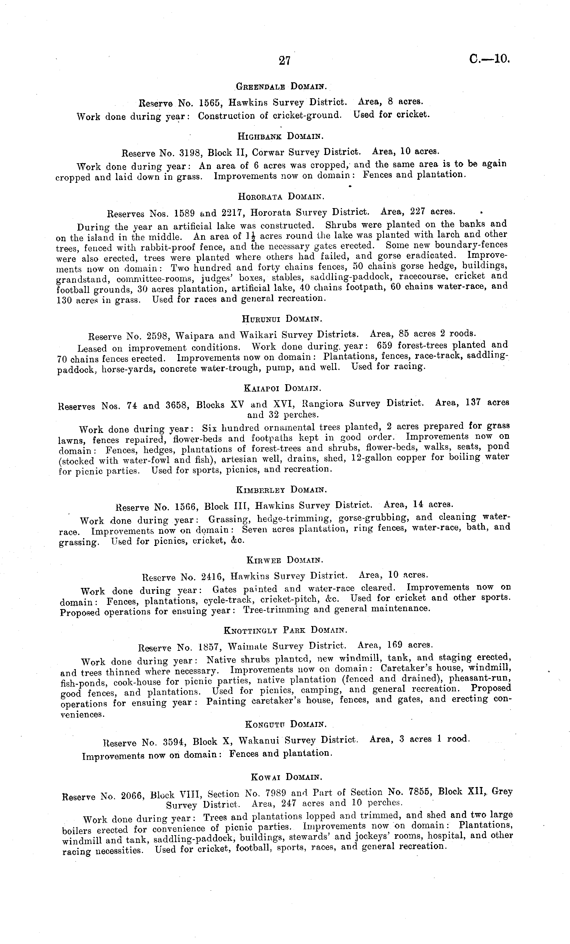 Greendale Domain. Reserve No. 1565, Hawkins Survey District. Area, 8 acres. Work done during year: Construction of cricket-ground. Used tor cricket. Highbank Domain. Reserve No. 3198, Block 11, Corwar Survey Distriot. Area, 10 acres. Work done during year: An area of 6 acres was cropped, and the same area is to be again cropped and laid down in grass. Improvements now on domain: Fences and plantation. Hokorata Domain. Reserves Nos. 1589 and 2217, Hororata Survey District. Area, 227 acres. During the year an artificial lake was constructed. Shrubs were planted on the banks and on the island in the middle. An area of 1J acres round the lake was planted with larch and other trees, fenced with rabbit-proof fence, and the necessary gates erected. Some new boundary-fences were also erected, trees were planted where others had failed, and gorse eradicated. Improvements now on domain : Two hundred and forty chains fences, 50 chains gorse hedge, buildings, grandstand, committee-rooms, judges' boxes, stables, saddling-paddock, racecourse, cricket and football grounds, 30 acres plantation, artificial lake, 40 chains footpath, 60 chains water-race, and 130 acres in grass. Used for races and general recreation. Hurunui Domain. Reserve No. 2598, Waipara and Waikari Survey Districts. Area, 85 acres 2 roods. Leased on improvement conditions. Work done during, year: 659 forest-trees planted and 70 chains fences erected. Improvements now on domain: Plantations, fences, race-track, saddlingpaddock, horse-yards, concrete water-trough, pump, and well. Used for racing. Kaiapoi Domain. Reserves Nos. 74 and 3658, Blocks XV and XVI, Rangiora Survey District. Area, 137 acres and 32 perches. Work done during year: Six hundred ornamental trees planted, 2 acres prepared for grass lawns, fences repaired, flower-beds and footpaths kept in good order. Improvements now on domain- Fences, hedges, plantations of forest-trees and shrubs, flower-beds, walks, seats, pond (stocked with water-fowl and fish), artesian well, drains, shed, 12-gallon copper for boiling water for picnic parties. Used for sports, picnics, and recreation. KiMBERLBY Domain. Reserve No. 1566, Block 111, Hawkins Survey District. Area, 14 acres. Work done during year: Grassing, hedge-trimming, gorse-grubbing, and cleaning waterrace. Improvements now on domain : Seven acres plantation, ring fences, water-race, bath, and grassing. Used for picnics, cricket, &o. Kirwee Domain. Reserve No. 2416, Hawkins Survey District. Area, 10 acres. Work done during year: Gates painted and water-race cleared. Improvements now on domain- Fences, plantations, cycle-track, cricket-pitch, &c. Used for cricket and other sports. Proposed operations for ensuing year: Tree-trimming and general maintenance. Knottinglt Park Domain. Reserve No. 1857, Waimate Survey District. Area, 169 acres. Work done during year: Native shrubs planted, new windmill, tank, and staging erected, and trees thinned where necessary. Improvements now on domain: Caretaker's house, windmill, fish-ponds cook-house for picnic parties, native plantation (fenced and drained), pheasant-run, good fences, and plantations. Used for picnics, camping, and general recreation. Proposed operations for ensuing year : Painting caretaker's house, fences, and gates, and erecting conveniences. KoNGUTiT Domain. Reserve No. 3594, Block X, Wakanui Survey District. Area, 3 acres 1 rood. Improvements now on domain: Fences and plantation. Kowai Domain. Reserve No. 2066, Block VIII, Section No. 7989 and Part of Section No. 7855, Block XII, Grey Survey District. Area, 247 acres and 10 perches. Work done during year: Trees and plantations lopped and trimmed, and shed and two large boilers erected for convenience of picnic parties. Improvements now on domain : Plantations, windmill and tank, saddling-paddock, buildings, stewards' and jockeys rooms, hospital, and other racing necessities. Used for cricket, football, sports, races, and general recreation.
