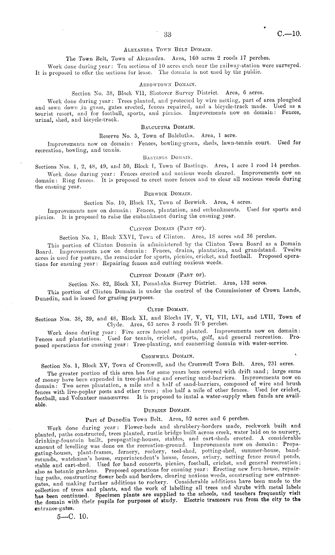 Alexandra Town Belt Domain. The Town Belt, Town of Alexandra. Area, 160 acres 2 roods 17 perches. Work done during year: Ten sections of 10 acres each near the railway-station were surveyed. It is proposed to offer the sections for lease. The domain is not used by the public. Arrowtown Domain. Section No. 38, Block Vll, Shotover Survey District. Area, 6 acres. Work done during year: Trees planted, and protected by wire netting, part of area ploughed and sown down ,in grass, gates erected, fences repaired, and a bicycle-track made._ Used as a tourist resort, and for football, sports, and picnics. Improvements now on domain: Fences, urinal, shed, and bicycle-track. Balclutha Domain. Reserve No. 5, Town of Balclutha. Area, 1 acre. Improvements now on domain: Fences, bowling-green, sheds, lawn-tennis court. Used for recreation, bowling, and tennis. Bastings Domain. Sections Nos. 1, 2, 48, 49, and 50, Block I, Town of Bastings. Area, 1 acre 1 rood 14 perches. Work done during year: Fences erected and noxious weeds cleared. Improvements now on domain: Ring fences. It is proposed to erect more fences and to clear all noxious weeds during the ensuing year. Berwick Domain. Section No. 10, Block IX, Town of Berwick. Area, 4 acres. Improvements now on domain: Fences, plantation, and embankments. Used for sports and picnics. It is proposed to raise the embankment during the ensuing year. Clinton Domain (Part of). Section No. 1, Block XXVI, Town of Clinton. Area, 18 acres and 36 perches. This portion of Clinton Domain is administered by the Clinton Town Board as a Domain Board. Improvements now on domain: Fences, drains, plantation, and grandstand. Twelve acres is used for pasture, the remainder for sports, picnics, cricket, and football. Proposed operations for ensuing year: Repairing fences and cutting noxious weeds. Clinton Domain (Part of). Section No. 82, Block XI, Pomahaka Survey District. Area, 132 acres. This portion of Clinton Domain is under the control of the Commissioner of Crown Lands, Dunedin, and is leased for grazing purposes. Clyde Domain. Sections Nos. 38, 39, and 48, Block XI, and Blocks IV, V, VI, VII, LVI, and LVII, Town of Clyde. Area, 63 acres 3 roods 2L5 perches. Work done during year: Five acres fenced and planted. Improvements now on domain: Fences and plantations." Used for tennis, cricket, sports, golf, and general recreation. Proposed operations for ensuing year: Tree-planting, and connecting domain with water-service. Cromwell Domain. Section No. 1, Block XV, Town of Cromwell, and the Cromwell Town Belt. Area, 231 acres. The greater portion of this area has for some years been covered with drift sand; large sums of money have been expended in tree-planting and erecting sand-barriers. Improvements now on domain : Two acres plantation, a mile and a half of sand-barriers, composed of wire and brush fences with live-poplar posts and other trees; also half a mile of other fences. Used for cricket, football, and Volunteer manoeuvres. It is proposed to instal a water-supply when funds are available. Dunedin Domain. Part of Dunedin Town Belt. Area, 52 acres and 6 perches. Work done during year: Flower-beds and shrubbery-borders made, rockwork built and planted paths constructed, trees planted, rustic bridge built across creek, water laid on to nursery, drinking-fountain built, propagating-houses, stables, and cart-sheds erected. A considerable amount of levelling was done on the recreation-ground. Improvements now on domain: Propa-gating-houses, plant-frames, fernery, rockery, tool-shed, potting-shed, summer-house, bandrotunda watchman's house, superintendent's house, fences, aviary, netting fence round ponds, stable and cart-shed. Used for band concerts, picnics, football, cricket, and general recreation; also as botanic gardens. Proposed operations for ensuing year: Erecting new fern-house, repairing paths constructing flower beds and borders, clearing noxious weeds, constructing new entrancegates ana making further additions to rockery. Considerable additions have been made to the collection of trees and plants, and the work of labelling all trees and shrubs with metal labels has been continued. Specimen plants are supplied to the schools, and teachers frequently visit the domain with their pupils for purposes of study. Electric tramcars run from the city to the entrance-gates. 5—C. 10.