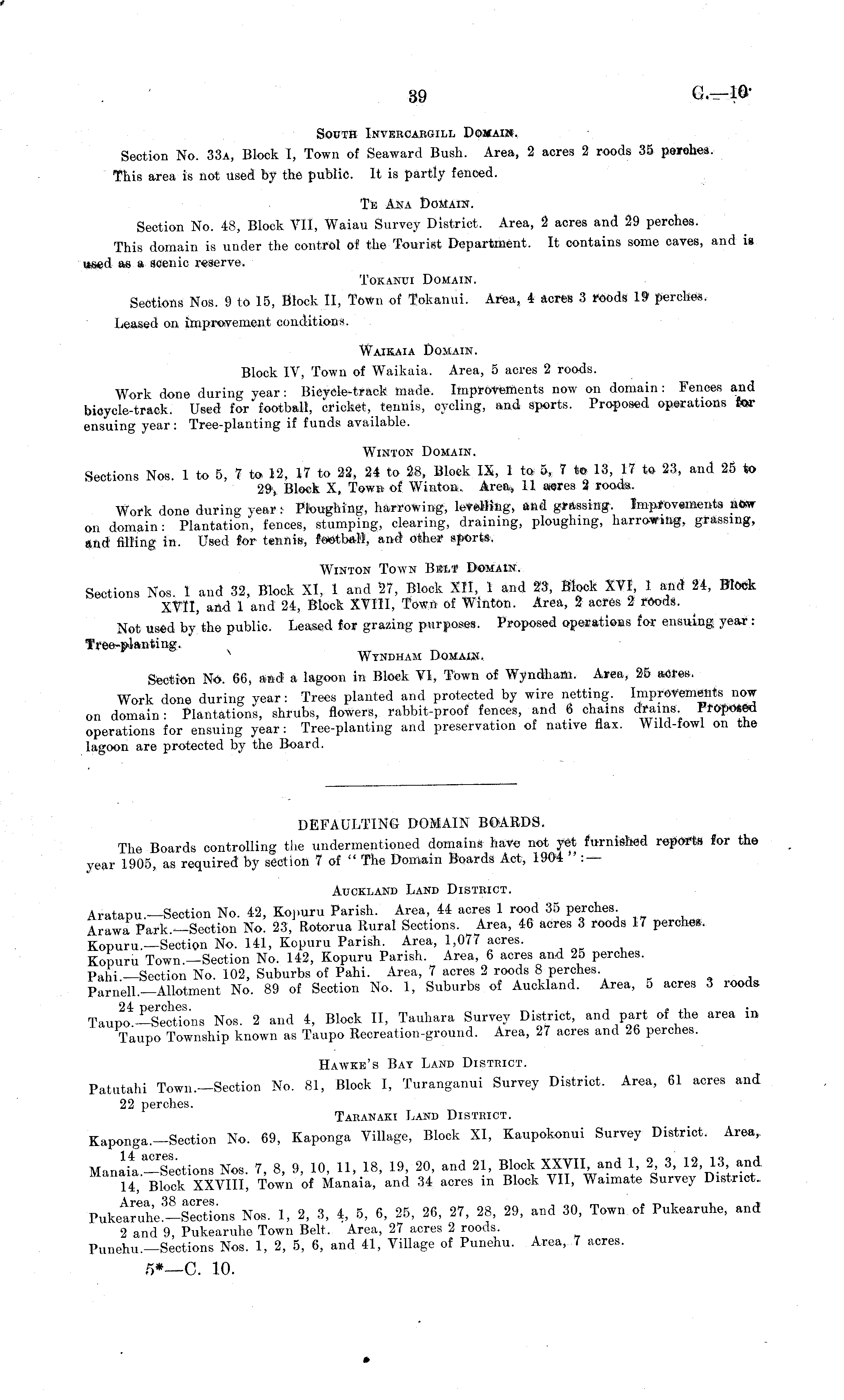 South Invercaegill Domain. Section No. 33a, Block I, Town of Seaward Bush. Area, 2 acres 2 roods 35 perches. This area is not used by the public. It is partly fenced. Te Ana Domain. Section No. 48, Block VII, Waiau Survey District. Area, 2 acres and 29 perches. This domain is under the control of the Tourist Department. It contains some caves, and is used as a scenic reserve. Tokanui Domain. Sections Nos. 9to 15, Block 11, Town of Tokanui. Area, 4 acres 3 roods 19 perches. Leased on improvement conditions. Waikaia Domain. Block IV, Town of Waikaia. Area, 5 acres 2 roods. Work done during year: Bicycle-track made. Improvements now on domain : Fences and bicycle-track. Used for "football, cricket, tennis, cycling, and sports. Proposed operations for ensuing year: Tree-planting if funds available. Winton Domain. Sections Nos. 1 to 5, 7 to 12, 17 to 22, 24 to 28, Block IX, 1 to 5, 7 to 13, 17 to 23, and 25 to 29, Block X, Town of Winton. Area, 11 acres 2 roods. Work done during year : Ploughing, harrowing, levelling, and grassing. Improvements now on domain: Plantation, fences, stumping, clearing, draining, ploughing, harrowing, grassing, and filling in. Used for tennis, football, and , other sports. Winton Town Belt Domain. Sections Nos 1 and 32, Block XI, 1 and 27, Block XII, 1 and 23, Block XVI, 1 and 24, Block XVII, and 1 and 24, Block XVIII, Town of Winton. Area, 2 acres 2 roods. Not used by the public. Leased for grazing purposes. Proposed operations for ensuing year: free-planting. Wtndham Domain. Section No. 66, and a lagoon in Block VI, Town of Wyndham. Area, 25 acres. Work done during year: Trees planted and protected by wire netting. Improvements now on domain: Plantations, shrubs, flowers, rabbit-proof fences, and 6 chains drains Proposed operations for ensuing year: Tree-planting and preservation of native flax. Wild-fowl on the lagoon are protected by the Board.
