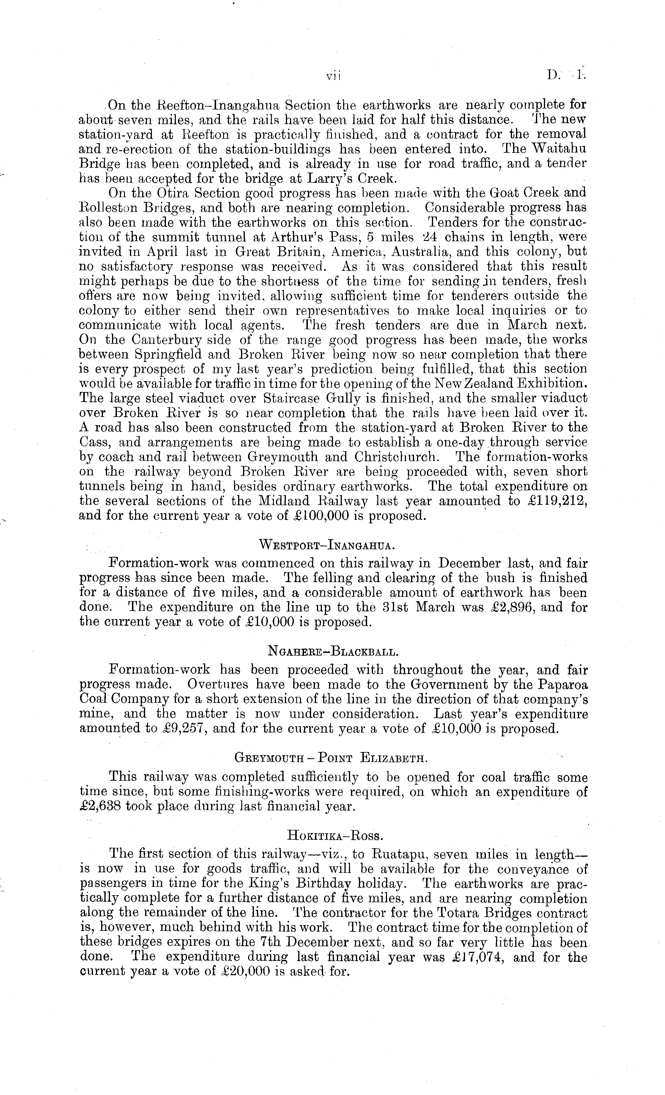 On the Reefton-Inangahua Section the earthworks are nearly complete for about seven miles, and the rails have been laid for half this distance. The new station-yard at Reefton is practically finished, and a contract for the removal and re-erection of the station-buildings has been entered into. The Waitahu Bridge has been completed, and is already in use for road traffic, and a tender has been accepted for the bridge at Larry's Creek. On the Otira Section good progress has been made with the Goat Creek and Rolleston Bridges, and both are nearing completion. Considerable progress has also been made with the earthworks on this section. Tenders for the contraction of the summit tunnel at Arthur's Pass, 5 miles 24 chains in length, were invited in April last in Great Britain, America, Australia, and this colony, but no, satisfactory response was received. As it was considered that this result might perhaps be due to the shortness of the time for sending in tenders, fresli offers are now being invited, allowing sufficient time for tenderers outside the colony to either send their own representatives to make local inquiries or to communicate with local agents. The fresh tenders are due in March next. On the Canterbury side of the range good progress has been made, the works between Springfield and Broken River being now so near completion that there is every prospect of my last year's prediction being fulfilled, that this section would be available for traffic in time for the opening of the New Zealand Exhibition. The large steel viaduct over Staircase Gully is finished, and the smaller viaduct over Broken River is so near completion that the rails have been laid over it. A road has also been constructed from the station-yard at Broken River to the Cass, and arrangements are being made to establish a one-day through service by coach and rail between Greymouth and Christchurch. The formation-works on the railway beyond Broken River are being proceeded with, seven short tunnels being in hand, besides ordinary earthworks. The total expenditure on the several sections of the Midland Railway last year amounted to £119,212, and for the current year a vote of £100,000 is proposed. We stport-Inangahua . Formation-work was commenced on this railway in December last, and fair progress has since been made. The felling and clearing of the bush is finished for a distance of five miles, and a considerable amount of earthwork has been done. The expenditure on the line up to the 31st March was £2,896, and for the current year a vote of £10,000 is proposed. Ngahere-Blackball. Formation-work has been proceeded with throughout the year, and fair progress made. Overtures have been made to the Government by the Paparoa Coal Company for a short extension of the line in the direction of that company's mine, and the matter is now under consideration. Last year's expenditure amounted to £9,257, and for the current year a vote of £10,000 is proposed. Greymouth - Point Elizabeth. This railway was completed sufficiently to be opened for coal traffic some time since, but some finishing-works were required, on which an expenditure of £2,638 took place during last financial year. Hokitika-Ross. The first section of this railway—viz., to Ruatapu, seven miles in length— is now in use for goods traffic, and will be available for the conveyance of passengers in time for the King's Birthday holiday. The earthworks are practically complete for a further distance of five miles, and are nearing completion along the remainder of the line. The contractor for the Totara Bridges contract is, however, much behind with his work. The contract time for the completion of these bridges expires on the 7th December next, and so far very little has been done. The expenditure during last financial year was £17,074, and for the current year a vote of £20,000 is asked for.