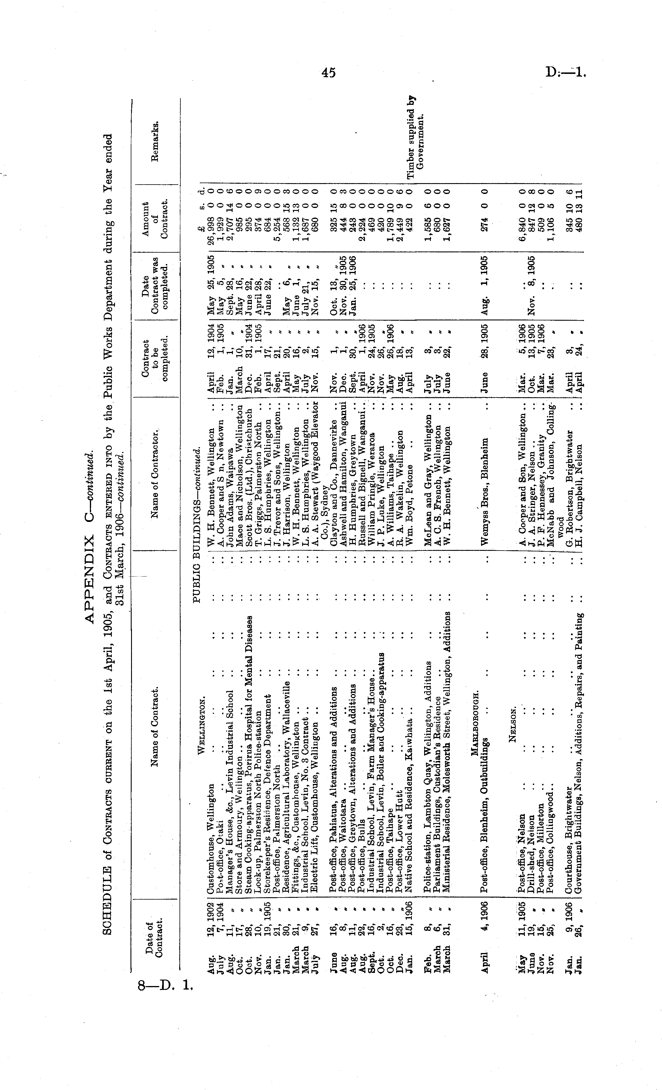 Date of Contract. Name of Contract. Name of Contractor. Contract to be completed. Date Contract was completed. Amount of Contract. Remarks. Wellington. PUBLIC B JILDINGS— continued. £ s. d. 26,998 0 0 1,929 0 0 2,707 14 6 985 0 0 295 0 0 374 0 9 684 0 0 5,254 0 0 568 15 3 1,132 13 0 1,687 0 0 680 0 0 Aug. 12, 1902 July 7, 1904 Aug. 11, „ Oct. 17, „ Oct. 28, „ Nov. 10, „ Jan. 19, 1905 Jan. 21, „ Jan. 30, , March 21, „ March 9, . July 27, . Customhouse, Wellington Po*t-omce, Otaki Manager's House, &c, Levin Industrial School Store and Armoury, Wellington .. Steam Cooking-apparatus, Porirua Hospital for Mental Diseases Lock-up, Palmerston North Police-station Storekeeper's Residence, Defence Department Post-office, Palmerston North Residence, Agricultural Laboratory, Wallaceville Fittings, &c, Customhouse, Wellington .. Industrial School, Levin, No. 3 Contract Electric Lift, Customhouse, Wellington W. H. Bennett, Wellington A. Cooper and S n, Newtown .. John Adams, Waipawa Mace and Nicholson, Wellington Scott Bros. (Ltd.), Christchurch T. Griggs, Palmerston North L. S. Humphries, Wellington .. J. Trevor and Sons, Wellington.. J. Harrison, Wellington W. H. Bennett, Wellington L. S. Humphries, Wellington .. A. A. Stewart (Waygood Elevator Co.), Sydney Clayton and Co., Dannevirke .. Ashwell and Hamilton, Waoganui H. Humphries, Greytown Russell and Bignell, Wanganui.. William Pringle, Weraroa J. P. Luke, Wellington A. Williams, Taihape .. R. A. Wakelin, Wellington Wm. Boyd, Petone April 12, 1904 Feb. 1, 1905 Jan. 1, „ March 10, . Dec. 31, 1904 Feb. 1, 1905 April 17, „ Sept. 21, „ April 20, „ May 16, „ July 2, „ Nov. 15, „ May 25, 1905 May 5, „ Sept. 28, „ May 16, „ June 22, „ April 28, „ June 22, „ May 6, „ June 1, „ July 21, „ Nov. 15, „ June 16, . Aug. 8, , Aug. 11, » Aug. 22, , Sept. 16, » Oot. 2, „ Oct. 16, „ Dec. 23, „ Jan. 15, 1906 Post-office, Pahiatua, Alterations and Additions .. Post-office, Waitotara Post-office, Greytown, Alterations and Additions Post-office, Bulls Industrial School, Levin, Farm Manager's House.. Industrial School, Levin, Boiler and Cooking-apparatus Post-office, Taihape Post-office, Lower Hutt Native School and Residence, Kaiwhata Nov. 1, „ Deo. 1, „ Sept. 30, , April 1, 1906 Nov. 24, 1905 Nov. 26, . May 26, 1906 Aug. 18, . April 13, „ Oct. 13, „ Nov. 30, 1905 Jan. 25, 1906 325 15 0 444 8 3 243 0 0 2,224 0 0 469 0 0 420 0 0 1,789 10 0 2,449 9 6 422 0 0 Timber supplied b; Government. Feb. 8, „ March 6, „ March 31, . Police-station, Lambton Quay, Wellington, Additions Parliament Buildings, Custodian's Residence Ministerial Residence, Molesworth Street, Wellington, Additions McLean and Gray, Wellington .. A. C. S. French, Wellington W. H. Bennett, Wellington July 3, . July 3, „ June 22, , 1,585 6 0 680 0 0 1,627 0 0 April 4, 1906 Mablbobough. Post-office, Blenheim, Outbuildings Wemyss Bros., Blenheim June 28, 1905 Aug. 1, 1905 274 0 0 May 11,1905 June 19, » Nov. 16, . Nov. 25, , Nelson. Post-office, Nelson Drill-shed, Nelson Post-office, Millerton Post-office, Collingwood.. A. Cooper and Son, Wellington .. J. A. StriDger, Nelson .. P. F. Hennessey, Granity McNabb and Johnson, Collingwood G. Robertson, Brightwater H. J. Campbell, Nelson Mar. 5, 1906 Oct. 13, 1905 Mar. 7, 1906 Mar. 23, „ Nov. 8, 1905 6,840 0 0 847 12 8 509 0 0 1,106 5 0 Jan. 9, 1906 Jan. 26, , Courthouse, Brightwater Government Buildings, Nelson, Additions, Repairs, and Painting April 3, . April 24, , 345 10 6 480 13 11