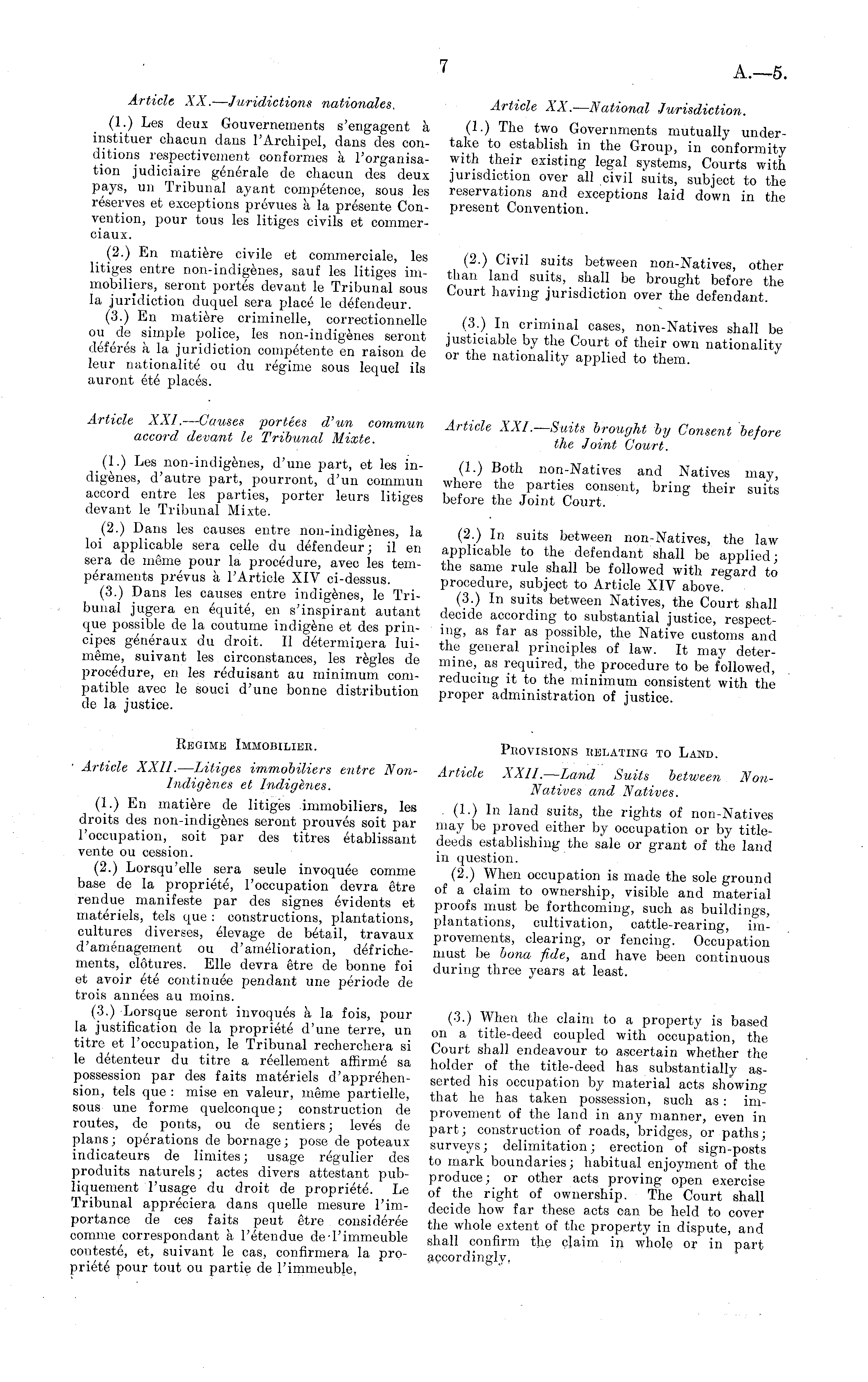 Article XX. — National Jurisdiction. a, (1.) The two Governments mutually under- - take to establish in the Group, in conformity ,- with their existing legal systems, Courts with x jurisdiction over all civil suits, subject to the s reservations and exceptions laid down in the present Convention. s (2.) Civil suits between non-Natives, other than land suits, shall be brought before the 3 Court having jurisdiction over the defendant. (3.) In criminal cases, non-Natives shall be justiciable by the Court of their own nationality ' or the nationality applied to them. 5 ' Article XXl. — Suits brought by Consent before the Joint Court. (1.) Both non-Natives and Natives may, where the parties consent, bring their suits before the Joint Court. (2.) In suits between non-Natives, the law applicable to the defendant shall be applied; the same rule shall be followed with regard to procedure, subject to Article XIV above. (3.) In suits between Natives, the Court shall decide according to substantial justice, respecting, as far as possible, the Native customs and the general principles of law. It may determine, as required, the procedure to be followed, reducing it to the minimum consistent with the proper administration of justice. Provisions delating to Lano. Article XXll. — Land Suits between NonNatives and Natives. (1.) In land suits, the rights of non-Natives may be proved either by occupation or by titledeeds establishing the sale or grant of the land in question. (2.) When occupation is made the sole ground of a claim to ownership, visible and material proofs must be forthcoming, such as buildings, plantations, cultivation, cattle-rearing, improvements, clearing, or fencing. Occupation must be bona -fide, and have been continuous during three years at least. (3.) When the claim to a property is based on a title-deed coupled with occupation, the Court shall endeavour to ascertain whether the holder of the title-deed lias substantially asserted his occupation by material acts showing that ho has taken possession, such as : improvement of the land in any manner, even in part; construction of roads, bridges, or paths; surveys; delimitation; erection of sign-posts to mark boundaries; habitual enjoyment of the produce; or other acts proving open exercise of the right of ownership. The Court shall decide how far these acts can be held to cover the whole extent of the property in dispute, and shall confirm the claim in whole or in part accordingly.