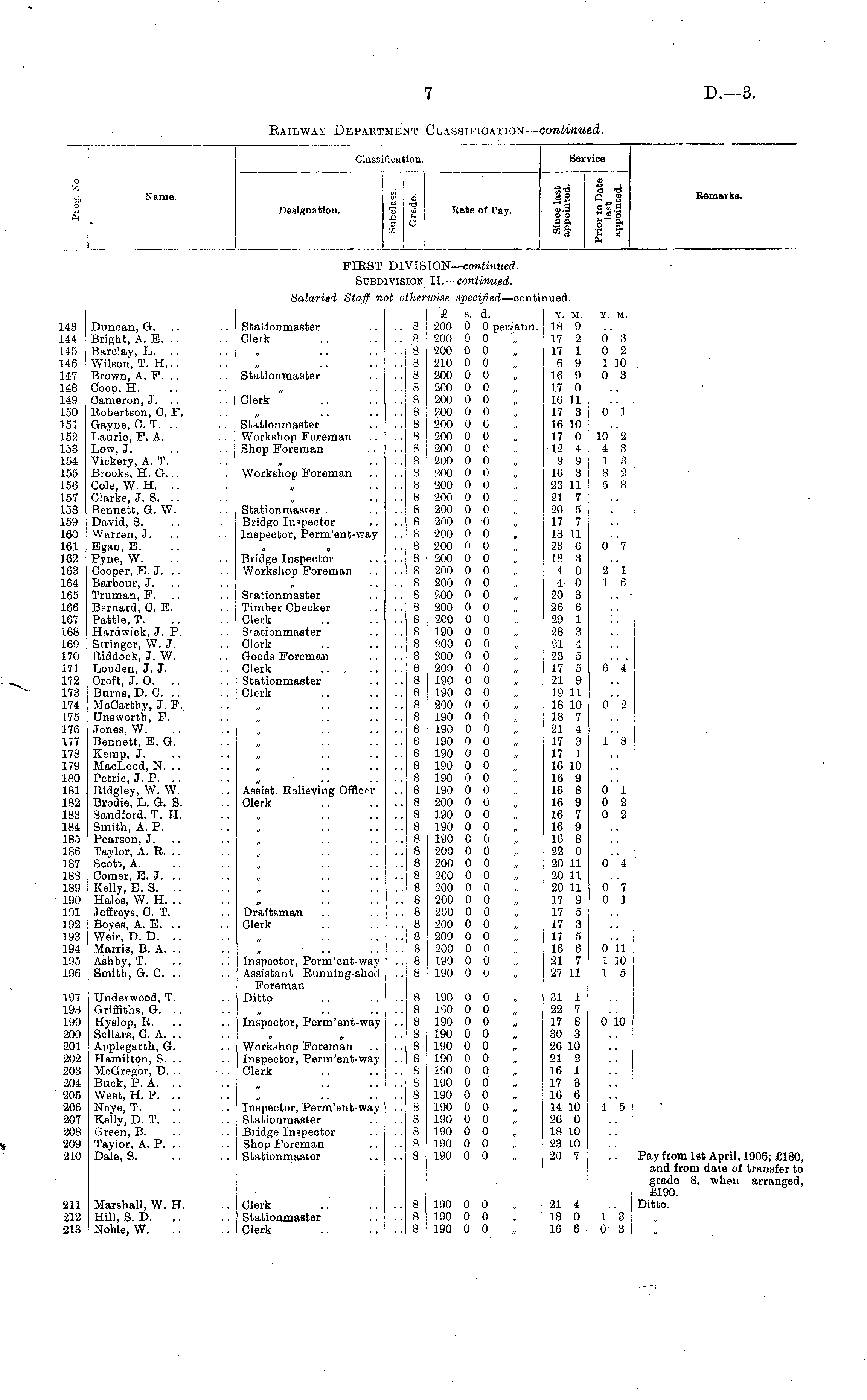 Classification. Service 6 A o ft ft Name. W . i V <*3 j ■§ 5 Eate of Pay. & Js PS ©.9 °«.9 © o 3 o a a ft a »§* I & ft Remarks. Designation, FIRST Subd: DP 7 IS ! I ON— continued. II.— continued. :vis: ION 143 144 145 146 147 148 149 150 151 152 153 154 155 156 157 158 159 160 161 162 163 164 165 166 167 168 169 170 171 172 173 174 175 176 177 178 179 180 181 182 183 184 185 186 187 188 189 190 191 192 193 194 195 196 Duncan, G. Bright, A. E. Barclay, L. Wilson, T. H... Brown, A. F. Coop, H. Cameron, J. .. Robertson, 0. F. Gayne, 0. T. Laurie, F. A. Low, J. Vickery, A. T. Brooks, H. G... Cole, W. H. Clarke, J. S. Bennett, G. W. David, S. Warren, J. Egan, E. Pyne, W. Cooper, E. J. Barbour, J. Truman, F. Bernard, 0. E. Pattle, T. Hardwick, J. P. Stringer, W. J. Riddock, J. W. Louden, J. J. Croft, J. O. Burns, D. 0. .. MoCarthy, J. F. Unsworth, P. Jones, W. Bennett, E. G. Kemp, J. MacLeod, N. .. Petrie.J. P. .. Ridgley, W. W. Brodie, L. G. S. Sandford, T. H, Smith, A. P. Pearson, J. Taylor, A. R. .. Scott, A. Comer, E. J. Kelly, E. S. Hales, W. H. . . Jeffreys, 0. T. Boyes, A. E. Weir, D. D. Marris, B. A. Ashby, T, Smith, G. 0. Salaried Staff ni Stationmaster Clerk Stationmaster Clerk Stationmaster Workshop Foreman Shop Foreman Workshop Foreman Stationmaster Bridge Inspector Inspector, Perm'ent-way Bridge Inspector Workshop Foreman Stationmaster Timber Checker Clerk Stationmaster Clerk Goods Foreman Clerk Stationmaster Clerk >t 01 ■ her 8 8 '8 8 8 8 8 8 8 8 8 8 8 8 8 8 8 8 8 8 8 8 8 8 8 8 8 8 8 8 8 8 8 8 8 8 8 8 8 8 8 8 8 8 8 8 8 8 8 8 8 8 8 8 •wise specified —oonti | £ s. d. 200 0 0 per.'ann. 200 0 0 200 0 0 210 0 0 200 0 0 200 0 0 200 0 0 200 0 0 200 0 0 200 0 0 200 0 0 200 0 0 200 0 0 200 0 0 200 0 0 200 0 0 200 0 0 200 0 0 200 0 0 200 0 0 I 200 0 0 200 0 0 200 0 0 200 0 0 200 0 0 190 0 0 200 0 0 200 0 0 200 0 0 190 0 0 190 0 0 200 0 0 190 0 0 190 0 0 190 0 0 190 0 0 190 0 0 190 0 0 190 0 0 200 0 0 190 0 0 190 0 0 190 0 0 200 0 0 200 0 0 200 0 0 200 0 0 200 0 0 200 0 0 200 0 0 200 0 0 200 0 0 190 0 0 190 0 0 ued. Y. M. Y. M. 18 9 .. 17 2 0 3 17 1 0 2 6 9 j 1 10 16 9 i 0 3 17 0 16 11 17 3 0 1 16 10 17 0 10 2 12 4 4 3 9 9 13 16 3 : 8 2 23 11 5 8 21 7 20 5 17 7 18 11 23 6 0 7 18 3 4 0 2 1 4 0 16 20 3 .. - 26 6 29 1 ;. 28 3 21 4 23 5 17 5 6 4 21 9 19 1.1. 18 10 0 2 18 7 21 4 17 3 18 17 1 16 10 16 9 16 8 0 1 16 9 0 2 16 7 0 2 16 9 16 8 22 0 20 11 0 4 20 11 20 11 0 7 17 9 0 1 17 5 17 3 17 5 16 6 0 11 21 7 1 10 27 11 15 Assist. Rolieving Officer Clerk Draftsman Clerk Inspector, Perm'ent-way Assistant Running-shed Foreman Ditto 197 198 199 200 201 202 203 204 205 206 207 208 209 210 Underwood, T. Griffiths, G. .. Hyslop, R. Sellars, 0. A. .. Applegarth, G. Hamilton, S. .. McGregor, D. .. Buck, P. A. West, H. P. Noye, T. Kelly, D. T. Green, B. Taylor, A. P. Dale, S. Inspector, Perm'ent-way Workshop Foreman .. j Inspector, Perm'ent-way | Clerk 8 8 8 8 8 8 8 8 8 8 8 8 8 8 190 0 0 ISO 0 0 190 0 0 190 0 0 190 0 0 190 0 0 190 0 0 190 0 0 190 0 0 190 0 0 190 0 0 190 0 0 190 0 0 190 0 0 31 1 22 7 17 8 0 10 30 3 26 10 21 2 16 1 17 3 16 6 14 10 4 5 26 0 18 10 23 10 20 7 Inspector, Perm'ent-way Stationmaster Btidge Inspector Shop Foreman Stationmaster Pay from 1st April, 1906; £180, and from date of transfer to grade 8, when arranged, £190. Ditto. 211 212 213 Marshall, W. H. Hill, S. D. Noble, W. Clerk Stationmaster Clerk 8 8 8 190 0 0 190 0 0 190 0 0 21 4 18 0 16 6 13 0 3