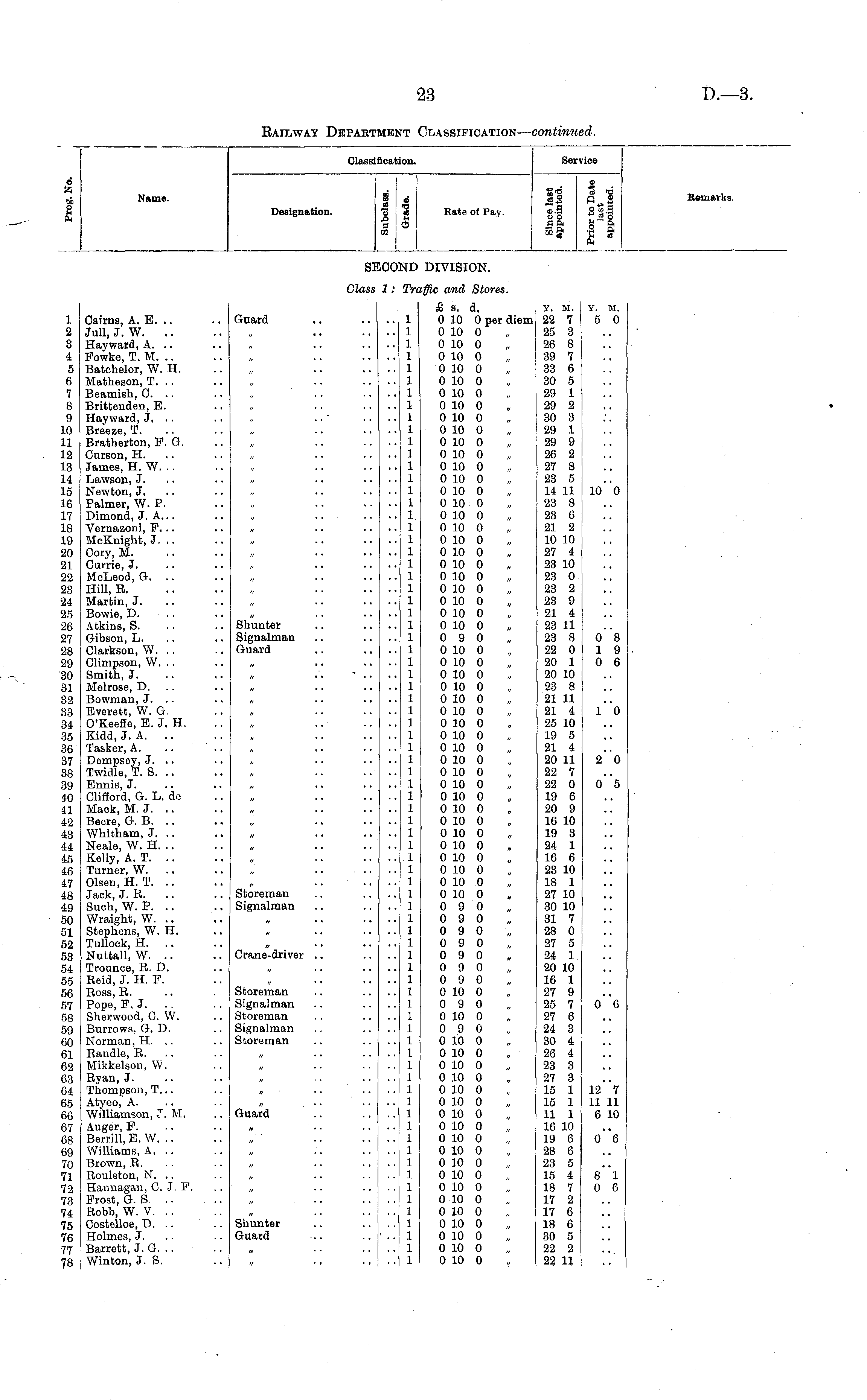 Classification. Service d X M O ft ft Name. Designation. 03 re cd 3 ■» a 08 3 C5 CO Rate of Pay. CD ■gid el 03 |S P 2 cd.9 °».9 uo " o a a ft" n a o, .g 0. <■ P a ft Remarks SI ico: SfD DIVISION. Class 1: Trc 'iffic and Stores. 1 2 3 4 5 6 7 8 9 10 11 12 13 1.4 15 16 17 18 19 20 21 22 23 24 25 26 27 28 29 30 31 32 83 34 35 36 37 38 39 40 41 42 43 44 45 46 47 48 49 50 51 52 53 54 55 56 57 58 59 00 61 62 63 64 65 66 07 03 09 70 71 72 73 74 75 76 77 78 Cairns, A. E. .. Jull, J. W. Hay ward, A. .. Fowke, T. M. .. Batchelor, W. H. Matheson, T. .. Beamish, 0. .. Brittenden, E. Hayward, J, .. Breeze, T. Bratherton, P. G. Curson, H. James, H. W. .. Lawson, J. Newton, J. Palmer, W. P. Dimond, J. A... Vernazoni, F. .. McKnight, J. .. Cory, M. Currie, J. McLeod, G. .. Hill, R. Martin, J. Bowie, D. Atkins, S. Gibson,L. Clarkson, W. Climpson, W. .. Smith, J. Melrose, D. .. Bowman, J. .. Everett, W. G. O'Keeffe, E. J. H. Kidd, J. A. Tasker, A. Dempsey, J. .. Twidle, T. S. Ennis, J. Clifford, G. L. de Mack, M. J. Beere, G. B. Whitham, J. .. Neale, W. H. .. Kelly, A. T. Turner, W. Olsen, H. T. .. Jack, J. R. Such, W. P. Wraight, W. .. Stephens, W. H. Tullock, H. .. Nuttall, W. .. Trounce, R. D. Reid, J. H. F. Ross, R. Pope, F. J. Sherwood, 0. W. Burrows, G. D. Norman, H. .. Randle, R. Mikkelson, W. Ryan, J. Thompson, T... Atyeo, A. Williamson, J. M. Auger, F. Berrill, E. W. .. Williams, A. .. Brown, R. Roulston, N. .. Hannagan, O. J. F. Frost, G. SRobb, W. V. Costelloe, D. .. Holmes, J. Barrett, J. G. Winton, J. S, Guard Shunter Signalman Guard 1 1 1 1 1 1 1 1 1 1 1 1 1 1 1 1 1 1 1 1 1 1 1 1 1 1 1 1 1 1 1 1 1 1 1 1 1 1 1 1 1 1 1 1 1 1 1 1 1 1 1 1 1 1 1 1 1 1 1 1 1 1 1 1 1 1 1 1 1 1 1 1 1 1 1 1 1 1 £ s. d. 0 10 0 per diem 0 10 0 0 10 0 0 10 0 0 10 0 0 10 0 0 10 0 0 10 0 0 10 0 0 10 0 0 10 0 0 10 0 0 10 0 0 10 0 0 10 0 0 10 0 0 10 0 0 10 0 0 10 0 0 10 0 0 10 0 0 10 0 0 10 0 0 10 0 0 10 0 0 10 0 0 9 0 0 10 0 0 10 0 0 10 0 0 10 0 0 10 0 0 10 0 0 10 0 0 10 0 0 10 0 0 10 0 0 10 0 0 10 0 0 10 0 0 10 0 0 10 0 0 10 0 0 10 0 0 10 0 0 10 0 0 10 0 0 10 0 0 9 0 0 9 0 0 9 0 0 9 0 0 9 0 0 9 0 0 9 0 0 10 0 0 9 0 0 10 0 0 9 0 0 10 0 0 10 0 0 10 0 0 10 0 0 10 0 0 10 0 0 10 0 0 10 0 0 10 0 0 10 0 0 10 0 0 10 0 0 10 0 0 10 0 0 10 0 0 10 0 0 10 0 0 10 0 0 10 0 Y. M. 22 7 25 3 26 8 39 7 33 6 30 5 29 1 29 2 30 3 29 1 29 9 26 2 27 8 23 5 14 11 23 8 23 6 21 2 10 10 27 4 23 10 23 0 23 2 23 9 21 4 23 11 23 8 22 0 20 1 20 10 23 8 21 11 21 4 25 10 19 5 21 4 20 11 22 7 22 0 19 6 20 9 16 10 19 3 24 1 16 6 23 10 18 1 27 10 30 10 31 7 28 0 27 5 24 1 20 10 16 1 27 9 25 7 27 6 24 3 30 4 26 4 23 3 27 3 15 1 15 1 11 1 16 10 19 6 28 6 23 5 15 4 18 7 17 2 17 6 18 6 30 5 22 2 22 11 Y. M. 5 0 10 "o 0 8 1 9 0 6 1 "o 2 - 0 0 "5 Storeman Signalman Crane-driver .. Storeman Signalman Storeman Signalman Storeman o"6 Guard 12 7 11 11 6 10 o'*6 8."l 0 6 Shunter Guard