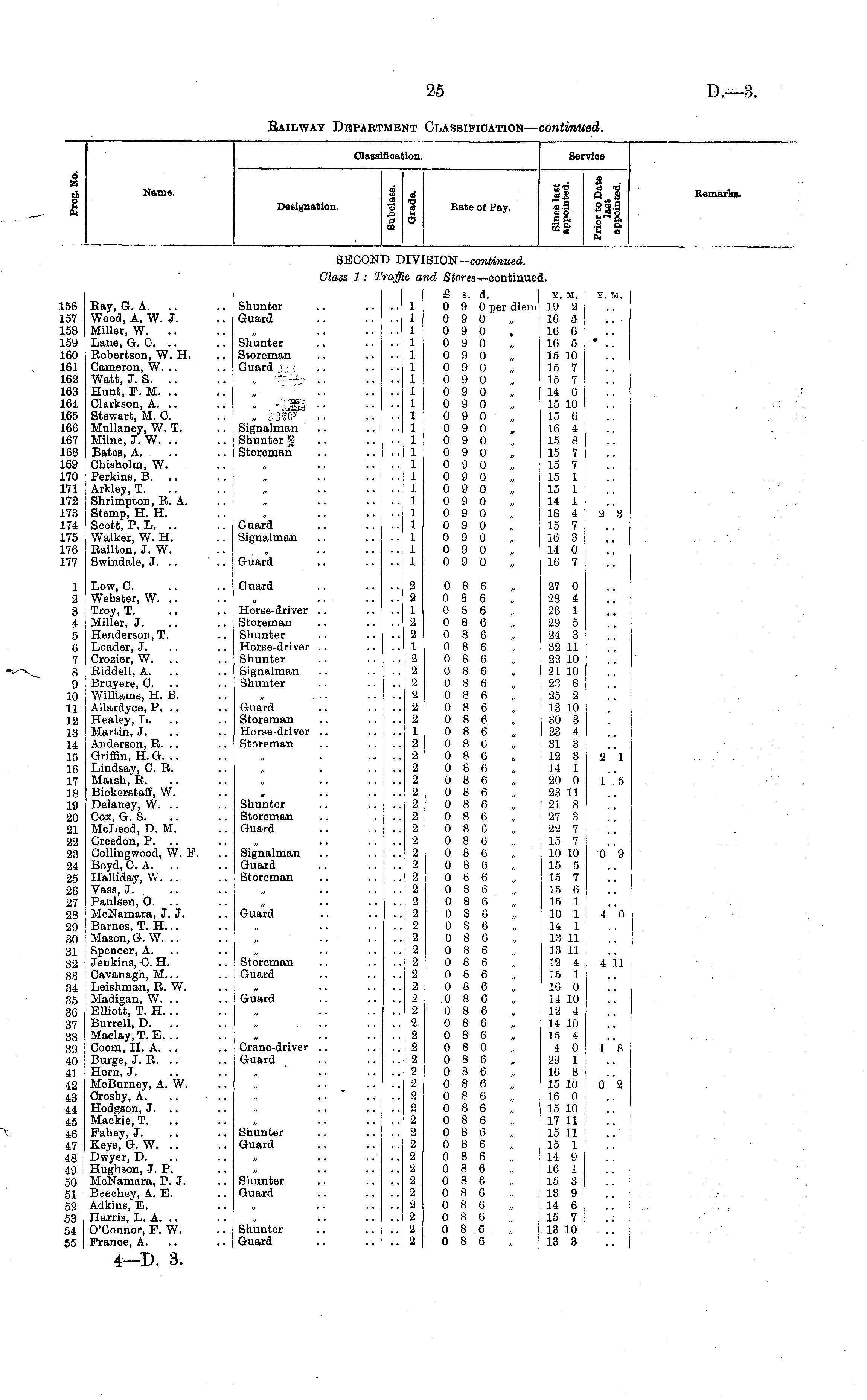 Classi iflcat tion. Service £ Name. Designation. CO 3 o J2 a co <o •a c3 ft o Rate of Pay. CD re-S ** «' If Q.S a a g a ~_ 3 3 Remarks. secon: )IV1 BION— continued. Class 1 : I ic a'. nd Stores —continuei 1. 156 157 L58 159 160 161 162 163 164 165 166 167 168 [69 170 171 172 173 [74 175 176 177 Ray, G. A. Wood, A. W. J. Miller, W. .. Lane, G. 0. Robertson, W. H. Cameron, W. .. Watt, J. S. Hunt, F. M. Clarkson, A. .. Stewart, M. C. Mullaney, W. T. Milne, J. W. Bates, A. Chisholm, W. Perkins, B. Arkley, T. Shrimpton, R. A. Stemp, H. H. Scott, P. L. Walker, W. H. Railton, J. W. Swindale, J. .. Shunter Guard Shunter Storeman Guard ,: - .-■iw;- " ....<=&£.',.' ■ • „ 0 3W Signalman Shunter | Storeman 1 1 1 1 1 1 1 1 1 1 1 1 1 1 1 1 1 1 1 1 1 1 £ s. d. 0 9 0 per diem 0 9 0 0 9 0 , 0 9 0 0 9 0 0 9 0 0 9 0 0 9 0 0 9 0 0 9 0 0 9 0 , 0 9 0 0 9 0 0 9 0 0 9 0 0 9 0 0 9 0 0 9 0 0 9 0 0 9 0 0 9 0 0 9 0 Y. M. 19 2 16 5 16 6 16 5 15 10 15 7 15 7 14 6 15 10 15 6 16 4 15 8 15 7 15 7 15 1 15 1 14 1 18 4 15 7 16 3 14 0 16 7 Y. M. * Guard Signalman 2 "a Guard 1 2 3 4 5 6 7 8 9 10 11 12 13 14 15 16 17 18 19 20 21 22 23 24 25 26 27 28 29 30 31 32 33 34 35 36 37 38 39 40 41 42 43 44 45 46 47 48 49 50 51 52 53 54 55 Low, 0. Webster, W. .. Troy, T. Miller, J. Henderson, T. Loader, J. Crozier, W. Riddell, A. .. Bruyere, 0. Williams, H. B. Allardyce, P. .. Healey, L. Martin, J. Anderson, R. .. Griffin, H. G. .. Lindsay, 0. R. Marsh, R. Bickerstaff, W. Delaney, W. .. Cox, G. S. McLeod, D. M. Creedon, P. Collingwood, W. F. Boyd, 0. A. Halliday, W. .. Vass, J. Paulsen, O. McNamara, J. J. Barnes, T. H... Mason, G. W. Spencer, A. Jenkins, 0. H. Cavanagh, M... Leishman, R. W. Madigan, W. .. Elliott, T. H. .. Burrell, D. .. Maclay, T. E. .. Ooom, H. A. Burge, J. R. Horn, J. McBurney, A. W. Crosby,A. Hodgson, J. .. Mackie, T. Pahey, J. Keys, G. W. Dwyer, D. Hughson, J. P. McNamara, P. J. Beeohey, A. E. Adkins, E. Harris, L. A. O'Connor, P. W. Pranoe, A. Guard Horse-driver Storeman Shunter Horse-driver Shunter Signalman Shunter Guard Storeman Horse-driver Storeman Shunter Storeman Guard Signalman Guard Storeman Guard 2 2 1 2 2 1 2 2 2 2 2 2 1 2 2 2 2 2 2 2 2 2 2 2 2 2 2 2 2 2 2 2 2 2 2 2 ■2 2 2 2 2 2 2 2 2 2 2 2 2 2 2 2 2 2 2 0 8 6 0 8 6 0 8 6 0 8 6 0 8 6 0 8 6 0 8 6 0 8 6 0 8 6 0 8 6 0 8 6 0 8 6 0 8 6 0 8 6 0 8 6 0 8 6 0 8 6 0 8 6 0 8 6 0 8 6 0 8 6 0 8 6 0 8 6 0 8 6 0 8 6 0 8 6 0 8 6 0 8 6 0 8 6 0 8 6 0 8 6 0 8 6 0 8 6 0 8 6 0 8 6 0 8 6 0 8 6 0 8 6 0 8 0 0 8 6 0 8 6 0 8 6 0 8 6 0 8 6 0 8 6 0 8 6 0 8 6 0 8 6 0 8 6 0 8 6 0 8 6 0 8 6 0 8 6 0 8 6 0 8 6 27 0 28 4 26 1 29 5 24 3 32 11 22 10 21 10 23 8 25 2 13 10 30 3 23 4 31 3 12 3 14 1 20 0 23 11 21 8 27 3 22 7 15 7 10 10 15 5 15 7 15 6 15 1 10 1 14 1 13 11 13 11 1.2 4 15 1 16 0 14 10 12 4 14 10 15 4 4 0 29 1 16 8 15 10 16 0 15 10 17 11 15 11 15 1 14 9 16 1 15 3 13 9 14 6 15 7 13 10 13 3 2*1 l'.'fi 0 "9 4 "0 Storeman Guard 4 11 Guard Crane-driver Guard l' - 8 0 "2 Shunter Guard Shunter Guard Shunter Guard