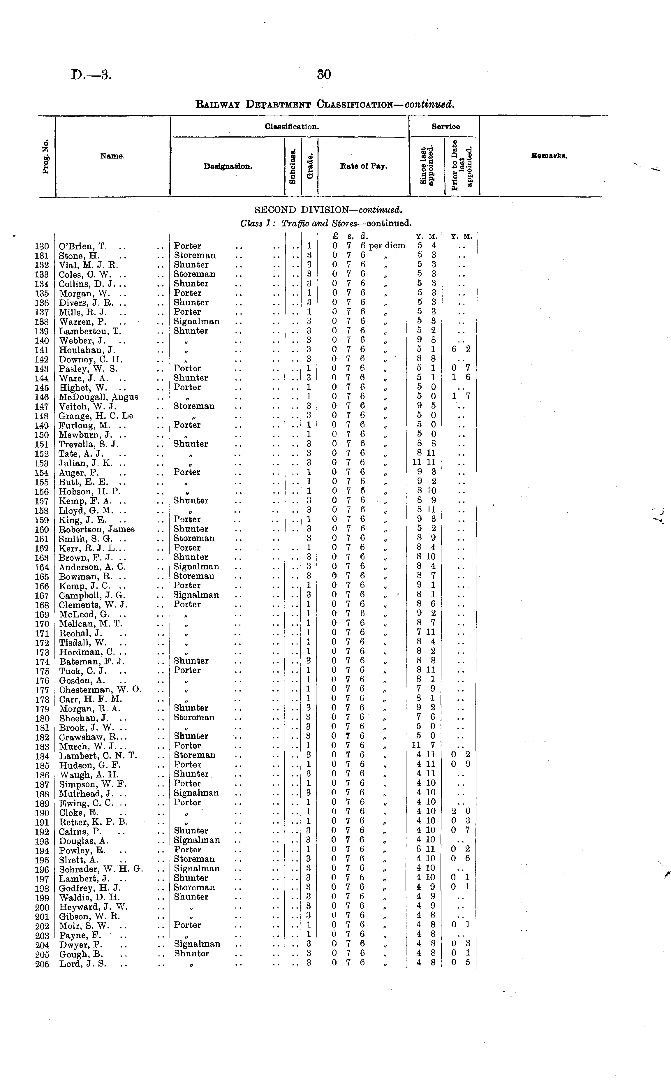 Classification. Service d X si o a Name. _ OT s © 0 CO _ _■ s CD re's if "d aS P.2 „ a o re a 8 3 _"'8 aa gp, B_ 3 3 ft Remarks. Designation. Rate of Pay. seco: ID D1V 'ISION — continued. Class I: Vet; fie a\ nd Stores —oontinuec u .30 .81 .32 .33 .84 .35 36 .37 .38 .39 .40 41 42 .43 .44 .45 .46 .47 .48 49 .50 .51 52 .58 54 .55 .56 57 .58 59 .60 .61 62 .63 .64 .65 .66 .07 .68 -69 170 L71 72 173 174 175 176 177 178 179 180 L81 182 183 L84 185 186 187 188 189 190 .91 .92 .93 .94 -95 .96 197 198 99 100 !01 !02 !08 !04 !05 !06 O'Brien, T. .. Stone, H. Vial, M. J. R. Coles, 0. W. Collins, D. J. .. Morgan, W. .. Divers, J. R. Mills, R. J. Warren, P. Lamberton, T. Webber, J. Houlahan, J. Downey, O H. Pasley, W. S. Ware, J. A. Highet, W. .. McDougall, Angus Veitch, W. J. Grange, H. O. Le Furlong, M. .. Mewburn, J. .. Trevella, S. J. Tate, A. J. Julian, J. K. Auger, P. Butt, E. E. Hobson, H. P. Kemp, P. A. .. Lloyd, G. M. King, J. E. Robertson, James Smith, S. G. Kerr, R.J. L... Brown, P.J. Anderson, A. 0. Bowman, R. .. Kemp, J. C Campbell, J. G. Clements, W. J. McLeod, G. .. Melican, M. T. Reehal, J. Tisdall, W. .. Herdman, C. .. Bateman, F. J. Tuck, C.J. Gosden, A. Chesterman, W. O. Carr, H. F. M. Morgan, R. A. Sheehan, J. Brook, J. W. Crawshaw, R... Murob, W. J. .. Lambert, C. N. T. Hudson, G. P. Waugh, A. H. Simpson, W. F. Muirhead, J. .. Ewing, CO. Cloke, E. Retter, K. P. B. Cairns, P. Douglas, A. Powley, R. Sirett, A. Schrader, W. H. G. Lambert, J. .. Godfrey, H. J. Waldie, D. H. Hey ward, J. W. Gibson, W. R. Moir, S. W. Payne, F. Dwyer, P. Gough, B. Lord, J. S. .. Porter Storeman Shunter Storeman Shunter Porter Shunter Porter Signalman Shunter Porter Shunter Porter Storeman Porter Shunter Porter Shunter Porter Shunter Storeman Porter Shunter Signalman Storeman Porter Signalman Porter 1 3 3 3 3 1 3 1 3 3 3 3 3 1 3 1 1 3 3 1 1 3 3 3 1 1 1 3 3 1 3 3 1 3 3 3 1 3 1 1 1 1 1 1 3 1 1 1 1 3 3 3 3 1 3 1 3 1 3 1 1 1 3 3 1 3 3 3 3 3 3 3 1 1 8 3 3 £ s, d. 0 7 6 per diem 0 7 6 0 7 6 0 7 6 0 7 6 0 7 6 0 7 6 0 7 6 0 7 6 0 7 6 0 7 6 0 7 6 0 7 6 0 7 6 0 7 6 0 7 6 0 7 6 0 7 6 0 7 6 0 7 6 0 7 6 0 7 6 0 7 6 0 7 6 0 7 6 0 7 6 0 7 6 0 7 6 .„ 0 7 6 0 7 6 0 7 6 0 7 6 0 7 6 0 7 6 0 7 6 6 7 6 0 7 6 0 7 6 0 7 6 0 7 6 0 7 6 0 7 6 0 7 6 0 7 6 0 7 6 0 7 6 0 7 6 0 7 6 0 7 6 „ I 0 7 6 0 7 6 0 7 6 0 T 6 0 7 6 0 7 6 0 7 6 0 7 6 0 7 6 0 7 6 0 7 6 0 7 6 0 7 6 0 7 6 0 7 6 0 7 6 0 7 6 0 7 6 0 7 6 0 7 6 0 7 6 0 7 6 0 7 6 0 7 6 0 7 6 0 7 6 0 7 6 0 7 6 Y. M. 5 4 5 3 5 3 5 3 5 3 5 3 5 3 5 3 5 3 5 2 9 8 5 1 8 8 5 1 5 1 5 0 5 0 9 5 5 0 5 0 5 0 8 8 8 11 11 11 9 3 9 2 8 10 8 9 8 11 9 3 5 2 8 9 8 4 8 10 8 4 8 7 9 1 8 1 8 6 9 2 8 7 7 11 8 4 8 2 8 8 8 11 8 1 7 9 8 1 9 2 7 6 5 0 5 0 11 7 4 11 4 11 4 11 4 10 4 10 4 10 4 10 4 10 4 10 4 10 6 11 4 10 4 10 4 10 4 9 4 9 4 9 4 8 4 8 4 8 4 8 4 8 4 8 Y. M. 6 "2 o"7 1 6 1 "7 Shunter Porter Shunter Storeman Shunter Porter Storeman Porter Shunter Porter Signalman Porter 0 "2 0 9 2 0 0 3 0 7 Shunter Signalman Porter Storeman Signalman Shunter Storeman Shunter 0 "2 0 6 o"i 0 1 Porter 0 "l Signalman Shunter 0 3 0 1 0 5