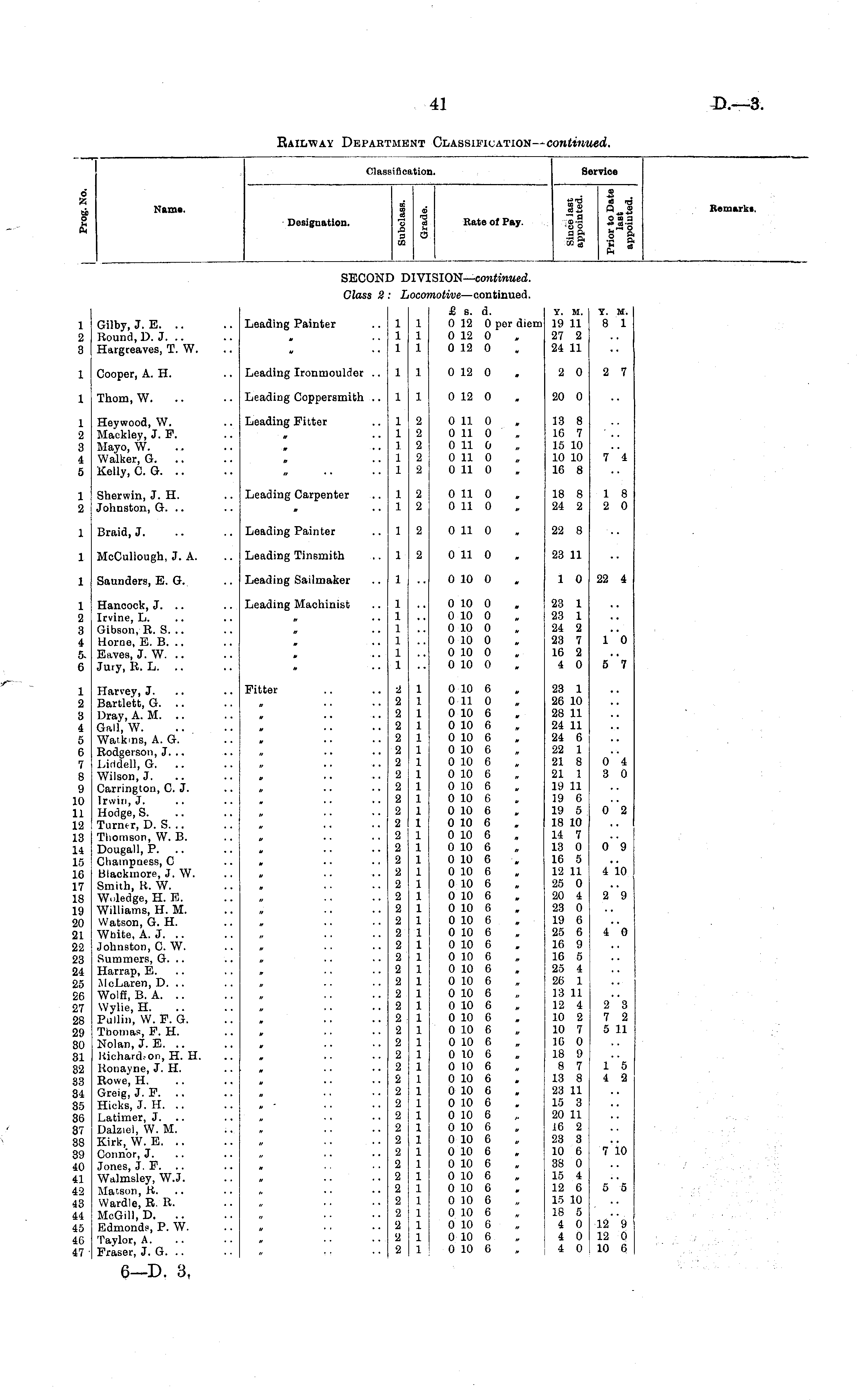d X A o a Name. Designation. Classificatioi re re 3 J3 a to a 03 a ft O to ._; 44 . £03 ca 03 2 a Q a ••§ 2 3-9 a 8 T.™ o aft g ft SI" 'S3 ft * Service Remarks. Rate of Pay. secon: IV] 3ION — continued. Class 2 >co; lotive —continued. 1 2 3 Gilby, J. E. Round, D. J. .. Hargreaves, T. W. Leading Painter 1 1 1 1 1 1 £ s. d. 0 12 0 per diem 0 12 0 0 12 0 Y. M. 19 11 27 2 24 11 Y. M. 8 1 Cooper, A. H. Leading Ironmoulder .. 1 1 0 12 0 2 0 2 7 Thorn, W. Leading Coppersmith .. 1 1 0 12 0 20 0 1 2 3 4 5 Heywood, W. Mackley, J. F. Mayo, W. Walker, G. .. Kelly, C. G. Leading Fitter 1 1 1 1 1 2 2 2 2 2 0 11 0 0 11 0 0 11 0 0 11 0 0 11 0 13 8 16 7 15 10 10 10 16 8 7"4 1 2 Sherwin, J. H. Johnston, G. .. Leading Carpenter 1 1 2 2 0 11 0 0 11 0 18 8 24 2 1 8 2 0 1 Braid, J. Leading Painter 1 2 0 11 0 22 8 1 McCullough, J. A. Leading Tinsmith 1 2 0 11 0 23 11 Saunders, E. G. Leading Sailmaker 1 0 10 0 1 0 22 4 1 2 3 4 5 6 Hancock, J. .. Irvine, L. Gibson, R. S. .. Home, E. B. .. Eaves, J. W. Jury, R. L. Leading Machinist 1 1 1 1 1 1 0 10 0 0 10 0 0 10 0 0 10 0 0 10 0 0 10 0 23 1 23 1 24 2 23 7 16 2 4 0 i"o 5"7 1 2 3 4 5 6 7 8 9 .0 .1 .2 .3 .4 .5 .6 7 8 .9 10 !l 12 13 14 15 16 17 18 19 10 51 52 13 14 55 50 17 18 10 10 11 12 13 14 15 10 17 Harvey, J. Bartlett, G. .. Dray, A. M. .. Gall, W. Watk,ns, A. G. Rodgeison, J. .. Liddell, G. .. Wilson, J. Carrington, O. J. Irwin, J. Hodge, S. Turner, D. S. .. Thomson, W. B. Dougall, P. .. Champness, C Blackmore, J. W. Smith, R. W. W<.ledge, H. E. Williams, H. M. Watson, G. H. White, A. J. .. Johnston, C. W. Summers, G. .. Harrap, E. McLaren, D. .. Wolff, B. A. Wylie, H. Pullin, W. F. G. Thomas, F. H. Nolan, J. E. .. Kichard.-on, H. H. Ronayne, J. H. Rowe, H. Greig, J. P. Hicks, J. H. Latimer, J. Dalziel, W. M. Kirk, W. E. .. Connor, J. Jones, J. P. Walmsley, W.J. Matson, R. Wardle, R. R. McGili.D. .. Edmonds, P. W. Taylor, A. Praser, J. G. .. Fitter 2 2 2 2 2 2 2 2 2 2 2 2 2 2 2 2 2 2 2 2 2 2 2 2 2 2 2 2 2 2 2 2 2 2 2 2 2 2 2 2 2 2 2 2 2 2 2 1 1 1 1 1 1 1 1 1 1 1 1 1 1 1 1 1 1 1 1 1 1 1 1 1 1 1 1 1 1 1 1 1 1 1 1 1 1 1 1 1 1 1 1 1 1 1 0 10 6 0 11 0 0 10 6 0 10 6 0 10 6 0 10 6 0 10 6 0 10 6 0 10 6 0 10 6 0 10 6 0 10 6 0 10 6 0 10 6 0 10 6 0 10 6 0 10 6 0 10 6 0 10 6 0 10 6 0 10 6 0 10 6 0 10 6 0 10 6 0 10 6 0 10 6 0 10 6 0 10 6 0 10 6 0 10 6 0 10 6 0 10 6 0 10 6 0 10 6 0 10 6 0 10 6 0 10 6 0 10 6 0 10 6 0 10 6 0 10 6 0 10 6 0 10 6 0 10 6 0 10 6 0 10 6 0 10 6 23 1 26 10 28 11 24 11 24 6 22 1 21 8 21 1 19 11 19 6 19 5 18 10 14 7 13 0 16 5 12 11 25 0 20 4 23 0 19 6 25 6 16 9 16 5 25 4 26 1 13 11 12 4 10 2 10 7 16 0 18 9 8 7 13 8 23 11 15 3 20 11 16 2 23 3 10 6 38 0 15 4 12 6 15 10 18 5 4 0 4 0 4 0 0 4 3 0 02 o"9 4*io 2"9 4"o 2 3 7 2 5 11 15 4 2 7 - io 5"5 12 9 12 0 10 6