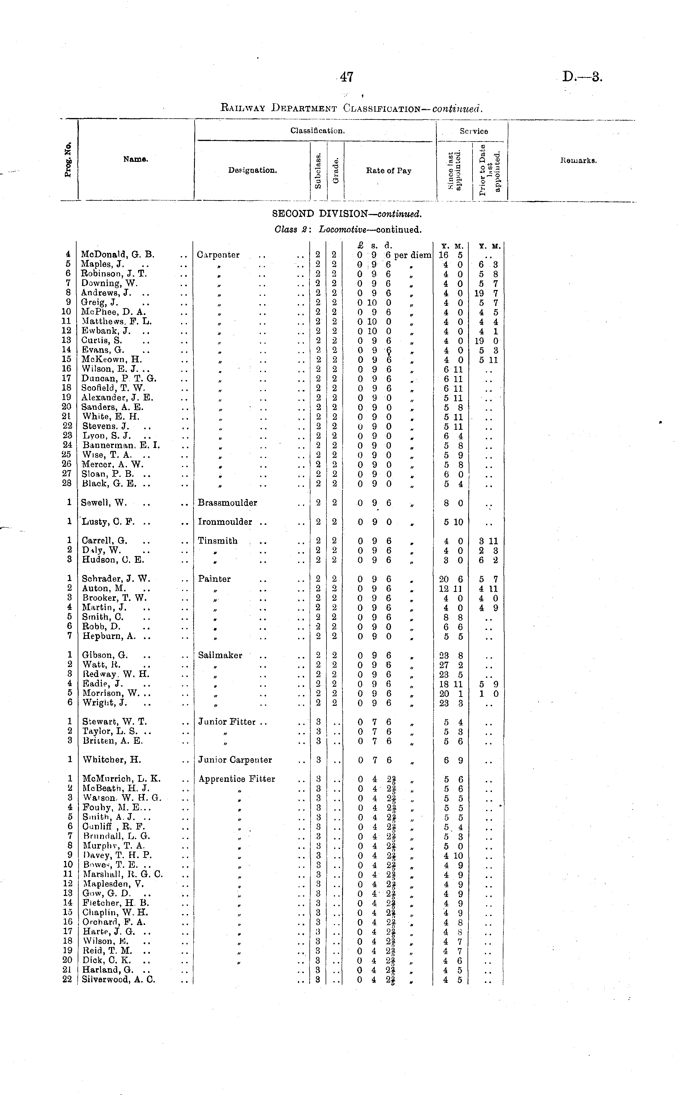 Classification. Service d X i Name. Designation. CO 3 03 CJ 33 I o ca _l Rate of Pay ! 2 tf 03 d o3 82 0 2 a-3 -21-3 11 ° a d ft - Keniarks. secon: d: [VII 3I0N— continued. Class 2 L< icon <.otive —continued. 4 5 6 7 8 9 10 11 12 13 14 15 16 17 18 19 20 21. 22 23 24 25 20 27 28 McDonald, G. B. Maples, J. Robinson, J. T. Downing, W. Andrews, J. Greig, J. McPhee, D. A. Matthews, P. L. Ewbank, J. Curtis, S. Evans, G. McKeown, H. Wilson, E. J. .. Duncan, P. T. G. Scofield, T. W. Alexander, J. E. Sanders, A. E. White, E. H. Stevens. J. Lyon, S. J. Bannerman, E. I. Wise, T. A. .. Mercer, A. W. Sloan, P. B. .. Black, G. E. Carpenter 2 2 2 2 2 2 2 2 2 2 2 2 2 2 2 2 2 2 2 2 2 2 2 2 2 2 2 2 2 2 2 2 2 2 2 2 2 2 2 2 2 2 2 2 2 2 2 2 2 2 £ s. d. 0 9 6 per diem '. 0 9 6 0 9 6 0 9 6 0 9 6 0 10 0 0 9 6 0 10 0 0 10 0 0 9 6 0 9 6 0 9 6 0 9 6 0 9 6 0 9 6 0 9 0 0 9 0 0 9 0 0 9 0 0 9 0 0 9 0 0 9 0 0 9 0 0 9 0 0 9 0 Y. M. Y. M. 16 5 4 0 6 3 4 0 5 8 4 0 5 7 4 0 19 7 4 0 5 7 4 0 4 5 4 0 4 4 4 0 4 1 4 0 19 0 4 0 5 3 4 0 5 11 6 11 6 11 6 11 5 11 5 8 5 11 .. 5 11 6 4 5 8 5 9 5 8 6 0 5 4 Y. M. 6 3 5 8 5 7 19 7 5 7 4 5 4 4 4 1 19 0 5 3 5 11 1 Sawell, W. .. Brassmoulder 2 2 0 9 6 8 0 1 Lusty, 0. F. Ironmoulder 2 2 0 9 0 5 10 1 2 3 Carrell, G. .. D-ily, W. Hudson, C E. Tinsmith .. 2 2 2 2 2 2 0 9 6 0 9 6 0 9 6 4 0 3 11 4 0 2 3 3 0 6 2 3 11 2 3 6 2 1 2 3 4 5 6 7 Schrader, J. W. Auton, M. Brooker, T. W. Martin, J. Smith, 0. Robb, D. Hepburn, A. .. Painter 2 2 2 2 2 ■2 2 2 2 2 2 2 2 2 0 9 6, ! 0 9 6. 0 9 6 0 9 6 0 9 6 0 9 0 0 9 0 20 6 5 7 12 11 4 11 4 0 4 0 4 0 4 9 8 8 6 6 5 5 5 7 4 11 4 0 4 9 1 2 8 4 5 6 Gibson, G. Watt, R. Red way. W. H. Eadie, J. Morrison, W. .. Wright, J. Sailmaker 2 2 2 2 2 2 2 2 2 2 2 2 0 9 6 . ! 0 9 6 ,, ! 0 9 6 1 0 9 6 0 9 6, I 0 9 6, : 23 8 27 2 23 5 18 11 5 9 20 1 10 23 3 5"9 1 0 1 2 3 Stewart, W. T. Taylor, L. S. Britten, A. E. Junior Fitter 3 3 3 0 7 6 0 7 6 0 7 6 5 4 5 3 5 6 1 Whitcher, H. Junior Carpenter 3 0 7 6 6 9 1 2 3 4 5 6 7 8 9 10 11 12 13 14 15 10 17 18 19 20 21 22 McMurrich, L. K. McBeath, H. J. Watson. W. H. G. Fouhy, M. E... Smith, A.J. .. Cmliff , R. F. Brundall, L. G. Murpbv, T. A. Davey, T. H. P. B-nve-i, T. E. Marshall, R. G. C Maplesden, V. Gow, G. D. .. Fletcher, H. B. Chaplin, W. H. Orchard, F. A. Harte, J. G. Wilson, Jii. Reid, T. M. .. Dick, C. K. .. Harland, G. .. Silverwood, A. C Apprentice Fitter 3 3 3 3 3 3 3 3 3 3 3 3 3 3 3 3 3 3 3 3 3 3 0 4 2| „ 0 4 2f „ 0 4 2f „ 0 4 25} „ 0 4 2§ „ 0 4 2§ „ 0 4 2| „ 0 4 2| „ 0 4 2f „ 0 4 25} „ 0 4 23 , 0 4 28 „ 0 4- 24} „ 0 4 2§ , 0 4 24 „ 0 4 25} . 0 4 2| „ 0 4 2?, 0 4 24} „ 0 4 25} „ 0 4 2}, 0 4 2f , 5 6 5 6 5 5 5 5 5 5 5 4 5 3 5 0 4 10 4 9 4 9 4 9 4 9 4 9 4 9 4 8 4 8 4 7 4 7 4 6 4 5 4 5
