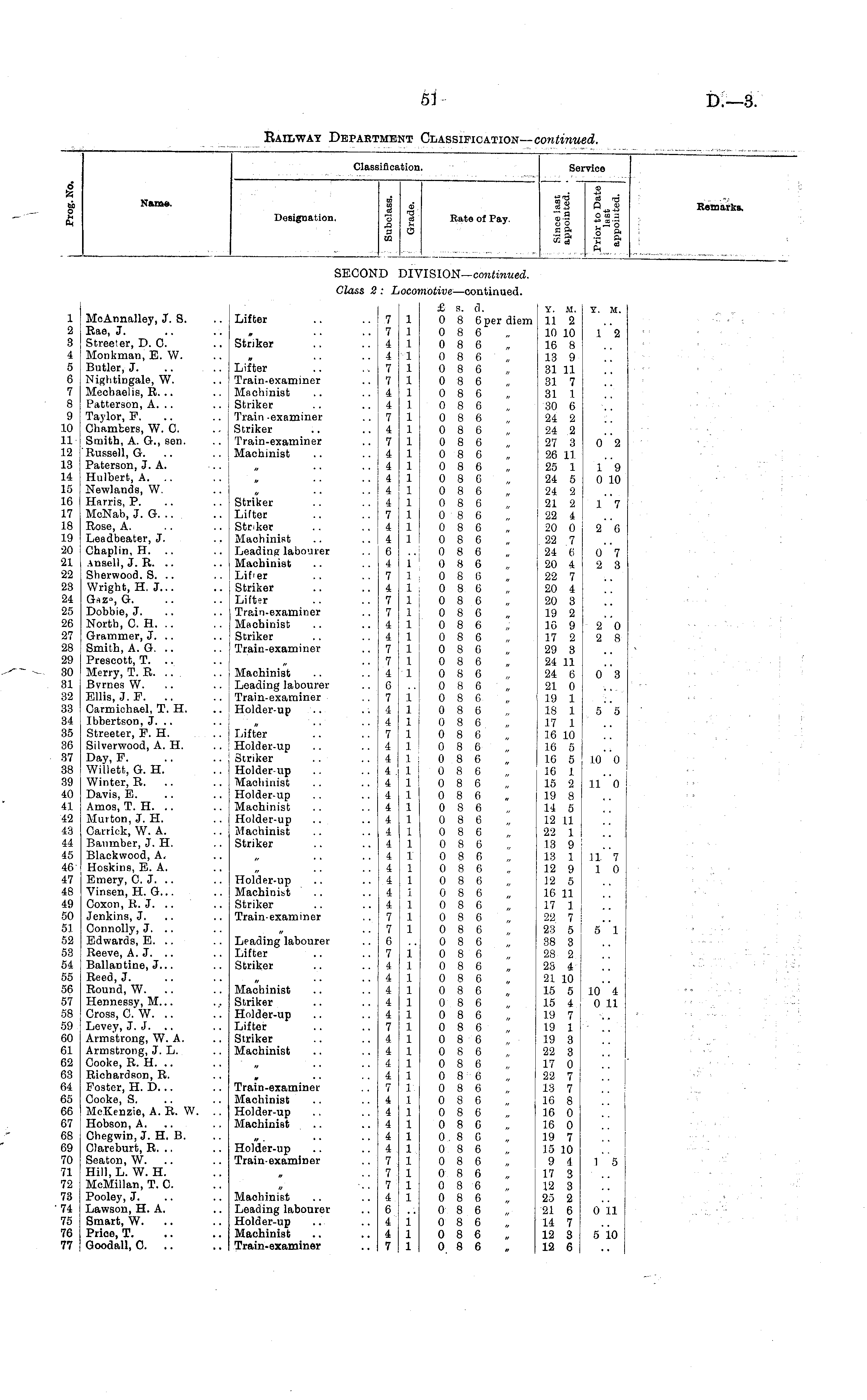 Classifici iion. Service d X to O Name. Designation. CO si 11 J3 3 CO a 03 c3 ft e Rate of Pay. it IA a .9 ° « a J,,.J.ijj * Remarks, SECON D >r\ TSION— continued. Class 2 )Co; notive —continued. l 2 3 4 5 6 7 8 9 10 11 12 13 14 15 16 17 18 19 20 21 22 23 24 25 26 27 28 29 30 31 32 33 34 35 86 37 38 39 40 41 42 43 44 45 46 47 48 49 50 51 52 58 54 55 56 57 58 59 60 61 02 63 64 65 66 67 68 69 70 71 72 73 74 75 76 77 McAnnalley, J. S. Rae, J. Streeter, D. 0. Monkman, E. W. Butler, J. Nightingale, W. Mechaelis, R. .. Patterson, A. .. Taylor, P. Chambers, W. 0. Smith, A. G., sen. Russell, G. Paterson, J. A. Hulbert, A. Newlands, W. Harris, P. McNab, J. G. .. Rose, A. Leadbeater, J. Chaplin, H. Ansell, J. R. .. Sherwood. S. .. Wright, H. J... Gsz», G. Dobbie, J. North, O. H. .. Grammer, J. .. Smith, A. G. Prescott, T. .. Merry, T. R. Bvrnes W. Ellis, J. P. .. Carmichael, T. H. Ibbertson, J. .. Streeter, F. H. Silverwood, A. H. Day, F. Willett, G. H. Winter, R. Davis, E. Amos, T. H. Murton, J. H. Carrick, W. A. Baumber, J. H. Blackwood, A. Hoskins, E. A. Emery, C.J. Vinsen, H. G... Coxon,R. J. Jenkins, J. Connolly, J. .. Edwards, E. .. Reeve, A.J. Ballantine, J... Reed, J. Round, W. .. Hennessy, M... Cross, C. W. Levey, J. J. Armstrong, W. A. Armstrong, J. L. Cooke, R. H. Richardson, R. Foster, H. D. .. Cooke, S. McKenzie, A. R. W. Hobson, A. Chegwin, J. H. B. Clareburt, R. .. Seaton, W. Hill.L. W. H. McMillan, T. C. Pooley, J. Lawson, H. A. Smart, W. Price, T. Goodall, O. .. Lifter Striker Lifter Train-examiner Machinist Striker Train -examiner Striker Train-examiner Machinist Striker Lifter Striker Machinist Leading labourer Machinist Lif'er Striker Lifter Train-examiner Machinist Striker Train-examiner Machinist Leading labourer Train-examiner Holder-up Lifter Holder-up Striker Holder-up Machinist Holder-up Machinist Holder-up Machinist Striker 7 7 4 4 7 7 4 4 7 4 7 4 4 4 4 4 7 4 4 6 4 7 4 7 7 4 4 7 7 4 6 7 4 4 7 4 4 4 . 4 4 4 4 4 4 4 4 4 4 4 7 7 6 7 4 4 4 4 4 7 4 4 4 4 7 4 4 4 4 4 7 7 7 4 6 4 4 7 1 1 1 1 1 1 1 1 1 1 1 1 1 1 1 1 1 1 1 1 1 1 1 1 1 1 1 1 1 1 1 1 1 1 1 1 1 1 i 1 1 1 1 1 1 1 1 1 £ s. d. 0 8 6 per diem 0 8 6 0 8 6 0 8 6 0 8 6 0 8 6 0 8 6 0 8 6 0 8 6 0 8 6 0 8 6 0 8 6 0 8 6 0 8 6 0 8 6 0 8 6 0 8 6 0 8 6 0 8 6 0 8 6 0 8 6 0 8 6 0 8 6 0 8 6 0 8 6 0 8 6 0 8 6 0 8 6 0 8 6 0 8 6 0 8 6 0 8 6 0 8 6 0 8 6 0 8 6 0 8 6 0 8 6 0 8 6 0 8 6 0 8 6 0 8 6 0 8 6 0 8 6 0 8 6 0 8 6 0 8 6 0 8 6 0 8 6 0 8 6 0 8 6 0 8 6 0 8 6 0 8 6 0 8 6 0 8 6 0 8 6 0 8 6 0 8 6 0 8 6 0 8 6 0 8 6 0 8 6 0 8 6 0 8 6 0 8 6 0 8 6 0 8 6 0 . 8 G 0 8 6 0 8 6 0 8 6 0 8 6 0 8 6 0 8 6 0 8 6 0 8 6 0 8 6 Y. M. 11 2 10 10 16 8 13 9 31 11 31 7 31 1 30 6 24 2 24 2 27 3 26 11 25 1 24 5 24 2 21 2 22 4 20 0 22 7 24 6 20 4 22 7 20 4 20 3 19 2 16 9 17 2 29 3 24 11 24 6 21 0 19 1 18 1 1.7 1 16 10 16 5 16 5 16 1 15 2 19 8 14 5 12 11 22 1 13 9 13 1 12 9 12 5 16 11 17 1 22 7 23 5 38 3 28 2 23 4 21 10 15 5 15 4 19 7 19 1 19 3 22 3 17 0 22 7 13 7 16 8 16 0 16 0 19 7 15 10 9 4 17 3 12 3 25 2 21 6 14 7 12 3 12 6 Y. M. i"a 0 2 l' 9 0 10 l"j 2 'e o"7 2 3 2 0 2 8 0*3 5 5 10 0 n"o ll' 7 1 0 Holder-up Machinist Striker Train-examiner Leading labourer Lifter Striker 5 1 Machinist Striker Holder-up Lifter Striker Machinist 1 1 1 1 1 1 1 1 1 1 1 1 1 1 1 1 1 1 1 1 1 10 "4 0 11 Train-examiner Machinist Holder-up Machinist . .. Holder-up Train-examiner l' 5 Maohinist Leading labourer Holder-up Machinist Train-examiner 1 1 1 0 11 5 io
