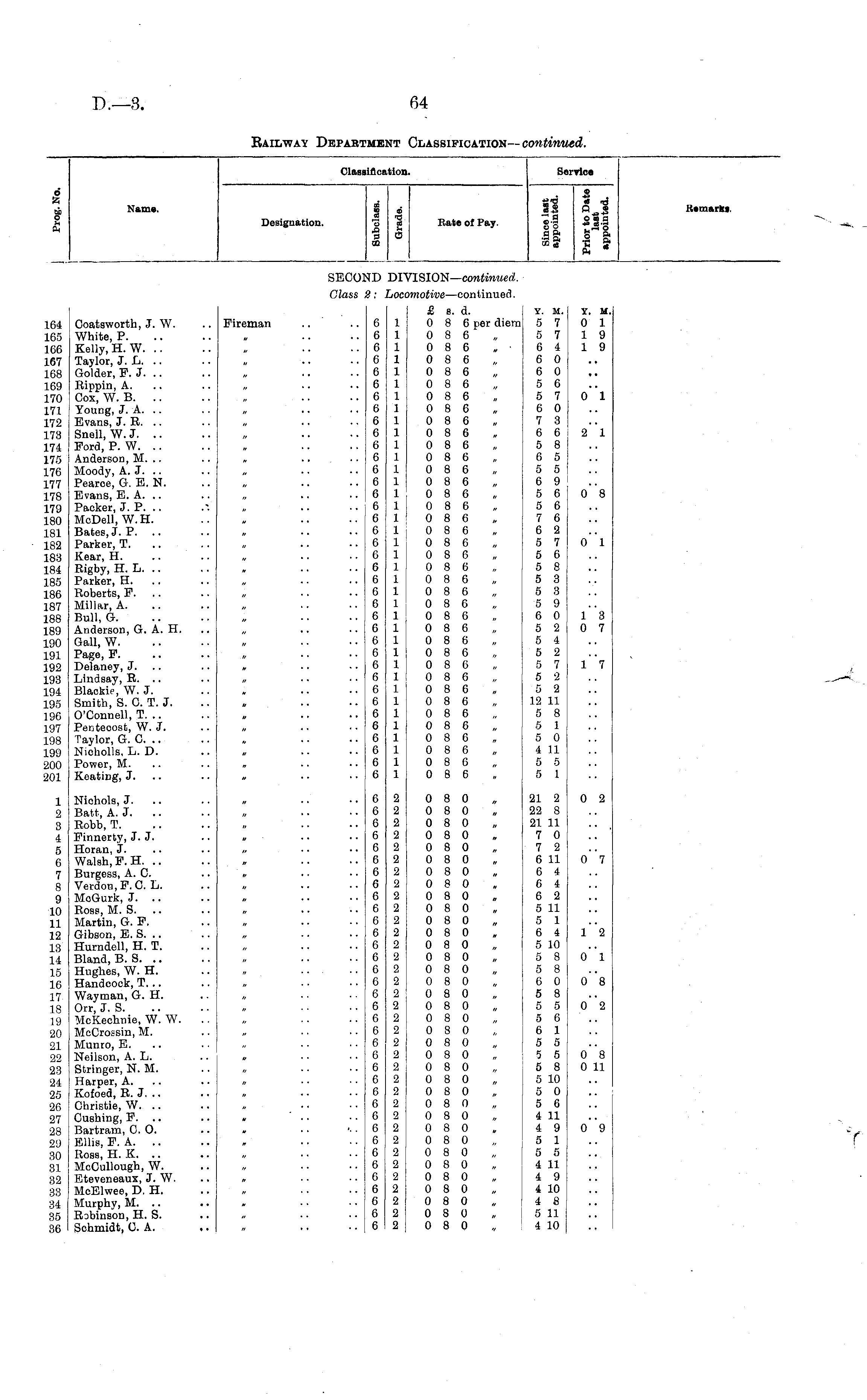 Classification. Service d X 9 ft ft Name. core 3 J2 3 CO a ■a 3 ft a Rate of Pay. s 3_ 0_« ••I & 3.9 aa go, a_ | 3 . Remarks. Designation. seco: I) DP /ISION — continued. Glass ,OCi motive —con linued. 164 105 166 167 108 169 170 171 172 173 [74 175 L76 177 178 [79 [80 181 182 [83 184 185 180 187 188 189 190 191 192 193 194 195 196 107 108 199 200 !01 Coatsworth, J. W. White, P. Kelly, H. W. .. Taylor, J. L. Golder, F. J. Rippin, A. Cox, W. B. Young, J. A. Evans, J. R. Snell, W. J. Ford, P. W. Anderson, M. .. Moody, A. J. Pearoe, G. E. N. Evans, E. A. Packer, J. P. McDell, W. H. Bates, J. P. Parker, T. Kear, H. Rigby, H. L. Parker, H. Roberts, F. .. Millar, A. Bull, G. Anderson, G. A. H. Gall, W. Page, F. Delaney, J. Lindsay, R. .. Blackie, W. J. Smith, S. 0. T. J. O'Connell, T. .. Pentecost, W. J. Taylor, G. 0. Nicholls, L. D. Power, M. Keating, J. Fireman 6 6 6 6 6 6 6 6 6 6 6 6 6 6 6 6 6 6 6 6 6 6 6 6 6 6 6 6 6 6 6 6 6 6 6 6 0 6 1 1 1 1 1 1 1 1 1 1 1 1 1 1 1 1 1 1 1 1 1 1 1 1 1 1 1 1 1 1 1 1 1 1 1 1 1 1 £ s. d. 0 8 6 per diem 0 8 6 0 8 6 0 8 6 0 8 6 0 8 6 0 8 6 0 8 6 0 8 6 0 8 6 0 8 6 0 8 6 0 8 6 0 8 6 0 8 6 0 8 6 0 8 6 0 8 6 0 8 6 0 8 6 0 8 6 0 8 6 0 8 6 0 8 6 0 8 6 0 8 6 0 8 6 0 8 6 0 8 6 0 8 6 0 8 6 0 8 6 0 8 6 0 8 6 0 8 6 0 8 6 0 8 6 0 8 6 Y. M. 5 7 5 7 6 4 6 0 6 0 5 6 5 7 6 0 7 3 6 6 5 8 6 5 5 5 6 9 5 6 5 6 7 6 6 2 5 7 5 6 5 8 5 3 5 3 5 9 6 0 5 2 5 4 5 2 5 7 5 2 5 2 12 11 5 8 5 1 5 0 4 11 5 5 5 1 Y. M. 0 1 1 9 1 9 o"i 2 1 o"8 0 1 18 0 7 1 7 1 2 3 4 5 6 7 8 9 10 11 12 13 14 15 16 17 18 19 20 21 22 23 24 25 26 27 28 20 30 81 32 33 34 35 30 Nichols, J. Batt, A. J. Robb, T. Finnerty, J. J. Horan, J. Walsh, P. H. .. Burgess, A. 0. Verdon.F.O. L. McGurk, J. .. Ross, M. S. Martin, G. F. Gibson,E. S. .. Hurndell, H. T. Bland, B. S. Hughes, W. H. Handcock, T. .. Wayman, G. H. Orr, J. S. McKechnie, W. W. McCrossin, M. Munro, E. Neilson, A. L. Stringer, N. M. Harper, A. Kofoed, R.J... Christie, W. .. Cushing, F. .. Bartram, 0. 0. Ellis, F. A. .. Ross, H. K. McCullough, W. Eteveneaux, J. W. McElwee, D. H. Murphy, M. .. Robinson, H. S. Schmidt, C. A. 6 6 0 6 6 6 6 6 6 6 6 6 0 6 0 6 6 6 (5 6 6 6 6 6 6 6 6 6 6 6 6 0 6 6 6 6 2 2 2 2 2 2 2 2 2 2 2 2 2 2 2 2 2 2 2 2 2 2 2 2 2 2 2 2 2 2 2 2 2 2 2 2 0 8 0 0 8 0 0 8 0 0 8 0 0 8 0 0 8 0 0 8 0 0 8 0 0 8 0 0 8 0 0 8 0 0 8 0 0 8 0 0 8 0 0 8 0 0 8 0 0 8 0 0 8 0 0 8 0 0 8 0 0 8 0 0 8 0 0 8 0 0 8 0 0 8 0 0 8 0 0 8 0 0 8 0 0 8 0 0 8 0 0 8 0 0 8 0 0 8 0 0 8 0 0 8 0 0 8 0 21 2 22 8 21 11 7 0 7 2 6 11 6 4 6 4 6 2 5 11 5 1 6 4 5 10 5 8 5 8 6 0 5 8 5 5 5 6 6 1 5 5 5 5 5 8 5 10 5 0 5 6 4 11 4 9 5 1 5 5 4 11 4 9 4 10 4 8 5 11 4 10 0 2 o"7 i"a o"i 0 '8 0*2 0 8 0 11 0 9