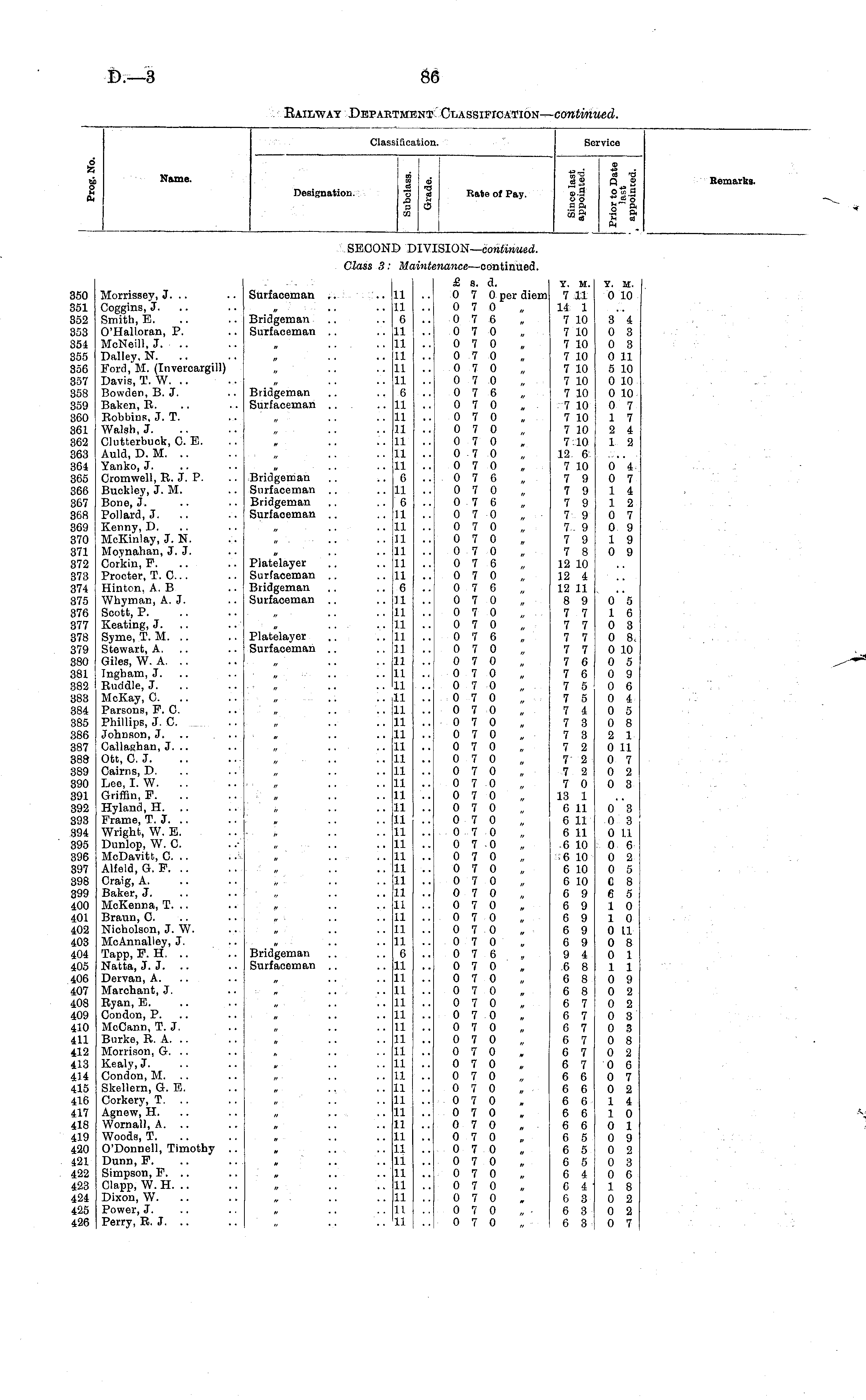 d S5 bh o ft ft Name. Classification. re co a 3 *** cj ed J3 ft 3 O CO Rate of Pay. a •g-d d 03 «S 0 2 a.9 °-S.a a o c* o c a g- a aj -S S ft Service Remarks. Designation. SEOON. )iv: [SION— continued. Class 3: linti '-nance —continued. 350 351 352 353 354 355 356 357 358 359 360 361 362 363 364 365 366 367 368 369 370 371 372 373 374 375 376 377 378 379 380 381 382 383 384 385 386 387 388 389 390 391 392 393 394 395 396 397 398 399 400 401 402 403 404 405 406 407 408 409 410 411 412 413 414 415 416 417 418 419 420 421 422 423 424 425 426 Morrissey, J. .. Coggins, J. Smith, E. O'Halloran, P. McNeill, J. .. Dalley, N. Ford, M. (Invercargill) Davis, T. W. .. Bowden, B. J. Baken, R. Robbins, J. T. Walsh, J. Clutterbuck, 0. E. Auld, D. M. .. Yanko, J. Cromwell, R. J. P. Buckley, J. M. Bone, J. Pollard, J. Kenny, D. McKinlay, J. N. Moynahan, J. J. Corkin, F. Procter, T. 0... Hinton, A. B Whyman, A. J. Scott, P. Keating, J. Syme, T. M. .. Stewart, A. Giles, W. A. .. Ingham, J. Ruddle, J. McKay, 0. Parsons, F. 0. Phillips, J. C Johnson, J. .. ... Callaghan, J. .. Ott, C.J. Cairns, D. .. Lee, I. W. Griffin, F. Hyland, H. .. Frame, T. J. .. Wright, W. E. Dunlop, W. 0. McDavitt, 0. .. Alfeld, G. P. .. Craig, A. Baker, J. McKenna, T. .. Braun, 0. Nicholson, J. W. McAnnalley, J. Tapp, F. H. .. Natta, J. J. Dervan, A. Marchant, J. Ryan, E. Condon, P. McCann, T. J. Burke, R. A. .. Morrison, G. .. Kealy, J. Condon, M. .. Skellern, G. E. Corkery, T. Agnew,H. Wornall, A. .. Woods, T. O'Donnell, Timothy .. Dunn, F. Simpson, F. .. Clapp, W. H. .. Dixon, W. Power, J. Perry, R. J. .. Surfaceman .. Bridgeman Surfaceman .. Bridgeman Surfaceman .. Bridgeman Surfaceman Bridgeman Surfaceman .. Platelayer Surfaceman .. Bridgeman Surfaceman .. Platelayer Surfaceman .. 11 11 (5 11 11 11 11 11 6 11 11 11 11 11 11 6 11 6 11 1.1 11 11 11 11 6 11 11 11 11 11 11 11 11 11 11 11 11 11 1.1 1.1 11 11 11 11 11 11 11 11 11 11 11 11 11 11 0 11 11 11. 11 11 11 11 11 11 11 11 11 11 11 11 11 11 11 11 1.1. 11 11 £ s. d. 0 7 0 per diem 0 7 0 0 7 6 0 7 0 0 7 0 0 7 0 0 7 0 0 7 0 0 7 6 0 7 0 0 7 0 0 7 0 0 7 0 0 7 0 0 7 0 0 7 6 0 7 0 0 7 6 0 7 0 „ 0 7 0 0 7 0 0 7 0 0 7 6 0 7 0 0 7 6 0 7 0 0 7 0 0 7 0 0 7 6 0 7 0 0 7 0 0 7 0 0 7 0 0 7 0 0 7 0 0 7 0 0 7 0 0 7 0 0 7 0 0 7 0 0 7 0 0 7 0 0 7 0 0 7 0 0 7 0 0 7 0 0 7 0 0 7 0 0 7 0 0 7 0 0 7 0 0 7 0 0 7 0 0 7 0 0 7 6 0 7 0 0 7 0 0 7 0 0 7 0 0 7 0 0 7 0 0 7 0 0 7 0 0 7 0 „ 0 7 0 0 7 0 0 7 0 0 7 0 0 7 0 0 7 0 0 7 0 0 7 0 0 7 0 0 7 0 0 7 0 0 7 0 0 7 0 Y. M. 7 11: 14 1 7 10 7 10 7 10 7 10 7 10 7 10 7 10 7 10 7 10 7 10 7 10 12 6 7 10 7 9 7 9 7 9 7 9 7 9 7 9 7 8 12 10 12 4 12 11 8 9 7 7 7 7 7 7 7 7 7 6 7 6 7 5 7 5 7 4 7 3 7 3 7 2 7 2 7 2 7 0 13 1 6 11 6 11 6 11 6 10 6 10 6 10 6 10 6 9 6 9 6 9 6 9 6 9 9 4 6 8 6 8 6 8 6 7 6 7 6 7 6 7 6 7 6 7 6 6 6 6 6 6 6 6 6 6 6 5 6 5 6 5 6 4 6 4 6 3 6 3 6 3 Y. M. 0 10 3 4 0 3 0 3 0 11 5 10 0 10 0 10 0 7 1 7 2 4 1 2 0 4 0 7 1 4 1 2 0 7 0 9 1 9 0 9 0 5 1 6 0 3 0 8, 0 10 0 5 0 9 0 6 0 4 0 5 0 8 2 1 0 11 0 7 0 2 0 3 Bridgeman Surfaceman .. 0 3 0 3 0 11 0 6 0 2 0 5 C 8 6 5 1 0 1 0 0 11 0 8 0 1 1 1 0 9 0 2 0 2 0 3 0 3 0 8 0 2 0 6 0 7 0 2 1 4 1 0 0 1 0 9 0 2 0 3 0 6 1 8 0 2 0 2 0 7
