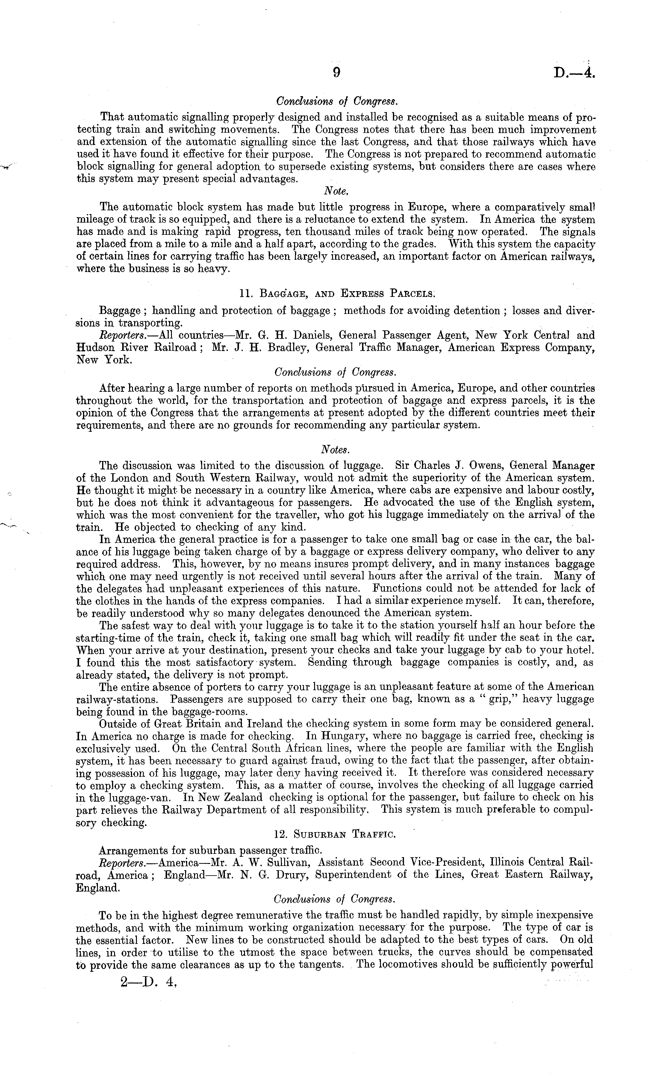 Conclusions of Congress. That automatic signalling properly designed and installed be recognised as a suitable means of protecting train and switching movements. The Congress notes that there has been much improvement and extension of the automatic signalling since the last Congress, and that those railways which have used it have found it effective for their purpose. The Congress is not prepared to recommend automatic block signalling for general adoption to supersede existing systems, but considers there are cases where this system may present special advantages. Note. The automatic block system has made but little progress in Europe, where a comparatively small mileage of track is so equipped, and there is a reluctance to extend the system. In America the system has made and is making rapid progress, ten thousand miles of track being now operated. The signals are placed from a mile to a mile and a half apart, according to the grades. With this system the capacity of certain lines for carrying traffic has been largely increased, an important factor on American railways, where the business is so heavy. 11. Baggage, and Expeess Pabcels. Baggage ; handling and protection of baggage ; methods for avoiding detention ; losses and diversions in transporting. Reporters. —All countries—Mr. G. H. Daniels, General Passenger Agent, New York Central and Hudson River Railroad ; Mr. J. H. Bradley, General Traffic Manager, American Express Company, New York. Conclusions of Congress. After hearing a large number of reports on methods pursued in America, Europe, and other countries throughout the world, for the transportation and protection of baggage and express parcels, it is the opinion of the Congress that the arrangements at present adopted by the different countries meet their requirements, and there are no grounds for recommending any particular system. Notes. The discussion was limited to the discussion of luggage. Sir Charles J. Owens, General Manager of the London and South Western Railway, would not admit the superiority of the American system. He thought it might be necessary in a country like America, where cabs are expensive and labour costly, but he does not think it advantageous for passengers. He advocated the use of the English system, which was the most convenient for the traveller, who got his luggage immediately on the arrival of the train. He objected to checking of any kind. In America the general practice is for a passenger to take one small bag or case in the car, the balance of his luggage being taken charge of by a baggage or express delivery company, who deliver to any required address. This, however, by no means insures prompt delivery, and in many instances baggage which one may need urgently is not received until several hours after the arrival of the train. Many of the delegates had unpleasant experiences of this nature. Functions could not be attended for lack of the clothes in the hands of the express companies. I had a similar experience myself. It can, therefore, be readily understood why so many delegates denounced the American system. The safest way to deal with your luggage is to take it to the station yourself half an hour before the starting-time of the train, check it, taking one small bag which will readily fit under the seat in the car. When your arrive at your destination, present your checks and take your luggage by cab to your hotel. I found this the most satisfactory system. Sending through baggage companies is costly, and, as already stated, the delivery is not prompt. The entire absence of porters to carry your luggage is an unpleasant feature at some of the American railway-stations. Passengers are supposed to carry their one bag, known as a " grip," heavy luggage being found in the baggage-rooms. Outside of Great Britain and Ireland the checking system in some form may be considered general. In America no charge is made for checking. In Hungary, where no baggage is carried free, checking is exclusively used. On the Central South African lines, where the people are familiar with the English system, it has been necessary to guard against fraud, owing to the fact that the passenger, after obtaining possession of his luggage, may later deny having received it. It therefore was considered necessary to employ a checking system. This, as a matter of course, involves the checking of all luggage carried in the luggage-van. In New Zealand checking is optional for the passenger, but failure to check on his part relieves the Railway Department of all responsibility. This system is much preferable to compulsory checking. 12. Suburban Teapfic. Arrangements for suburban passenger traffic. Reporters. —America—Mr. A. W. Sullivan, Assistant Second Vice-President, Illinois Central Railroad, America ; England—Mr. N. G. Drury, Superintendent of the Lines, Great Eastern Railway, England. Conclusions of Congress. To be in the highest degree remunerative the traffic must be handled rapidly, by simple inexpensive methods, and with the minimum working organization necessary for the purpose. The type of car is the essential factor. New lines to be constructed should be adapted to the best types of cars. On old lines, in order to utilise to the utmost the space between trucks, the curves should be compensated to provide the same clearances as up to the tangents. The locomotives should be sufficiently powerful 2—D. 4,