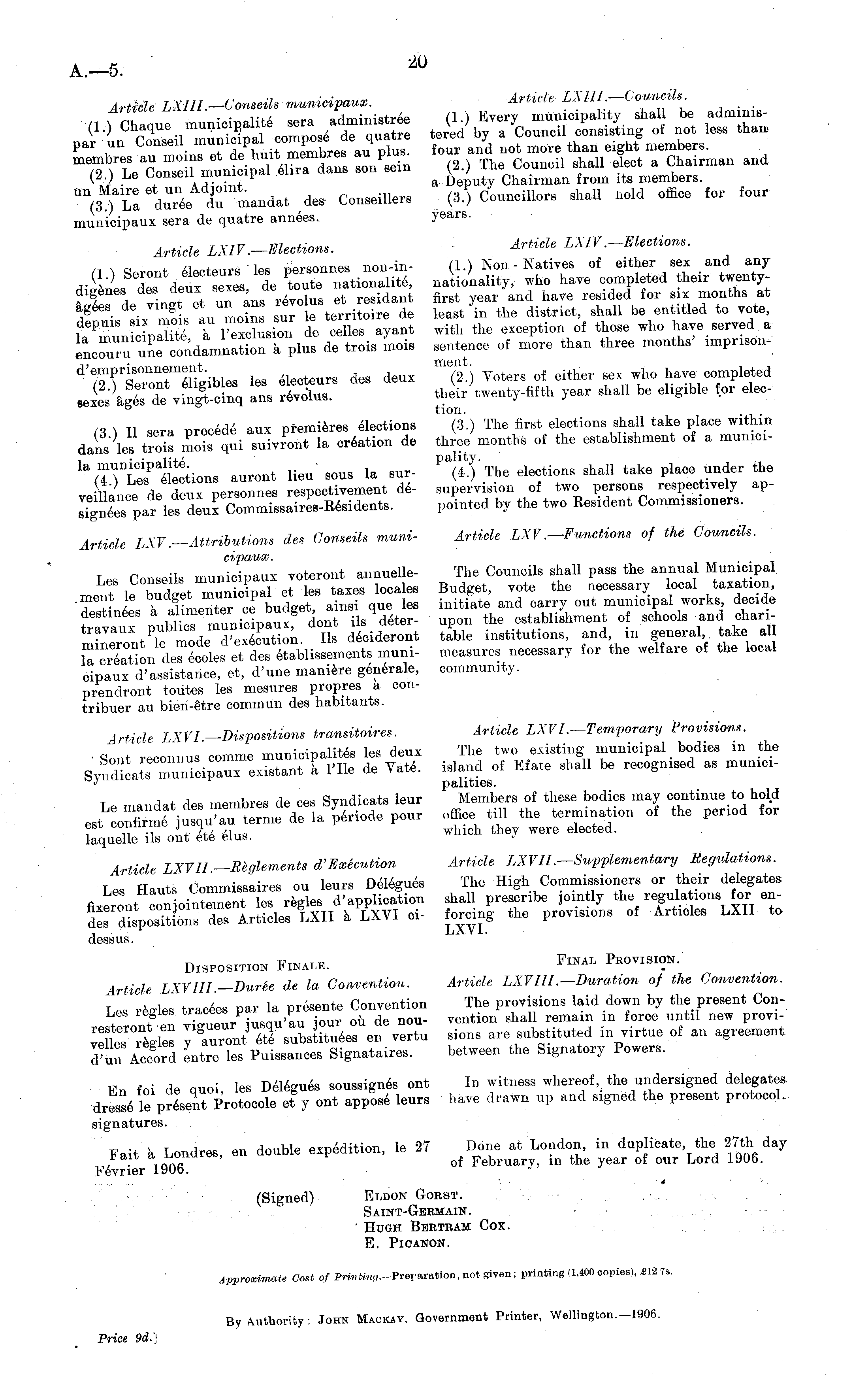 Article LXlll. — Conseils munici fauna. (1.) Chaque municipality sera administree par un Conseil municipal compose de quatre 1 membres au moms et de huit membres au plus. (2.) Le Conseil municipal elira dans son sem un Maire et un Adjoint. (3.) La duree dv mandat dcs Conseillers municipaux sera de quatre annees. Article LXIV. — Elections. (1 ) Seront electeurs les personnes iion-in-digenes dcs deux sexes, de toute natioualite &gees de vingt et un ans revolus et residant depuis six mois au moms sur le territoire de la municipality a l'exclusion de celles_ ayant encouru une condamnation a plus de trois mois d'emprisonnement. (2.) Seront eligibles les electeurs dcs deux sexes ages de vingt-cinq ans re>olus. (3 ) II sera procede aux premieres elections dans les trois mois gui suivront la creation de la municipality. (4 ) Les elections auront lieu sous la surveillance de deux personnes respectivement designees par les deux Commissaires-Residents. Article LXV. Attributions dcs Gonseils municipaux. Les Conseils municipaux voteront armuellement le budget municipal et les taxes locales destinees a alimenter cc budget, ainsi que les travaux publics municipaux, dont ils determineront le mode d'execution. Ils decideront la creation dcs ecoles et dcs etablisseinents municipaux d'assistance, et, dune mamere generate, prendront toutes les mesures propres a contribuer au bien-Stre commun dcs habitants. Article LXVI. — Dispositions transitoires. ■ Sont reconnus comme municipality les deux Syndicate municipaux existant a l'lle de Vate. Le mandat dcs membres de ces Syndicate leur est jusqu'au terme de la periode pour laquelle ils out etc elus. Article LXV II .—Beglements d'Execution Les Hauts (Jommissaires ou leurs Delegues fixeront conjointement les regies d'application dcs dispositions dcs Articles LXII a LXVI cidessus. Disposition Finale. Article LXV lll.—Duree de Iα Convention. Les regies tracees par la presente Convention resteront en vigueur jusqu'au jour ou de nouvelles regies y auront etc substituees en vertu dun Accord entre les Puissances Signataires. En foi de quoi, les Dengues soussignes ont dressd le present Protocole et y ont appos6 leurs signatures. Fait a Londres, en double expedition, le 27 Fevrier 1906.