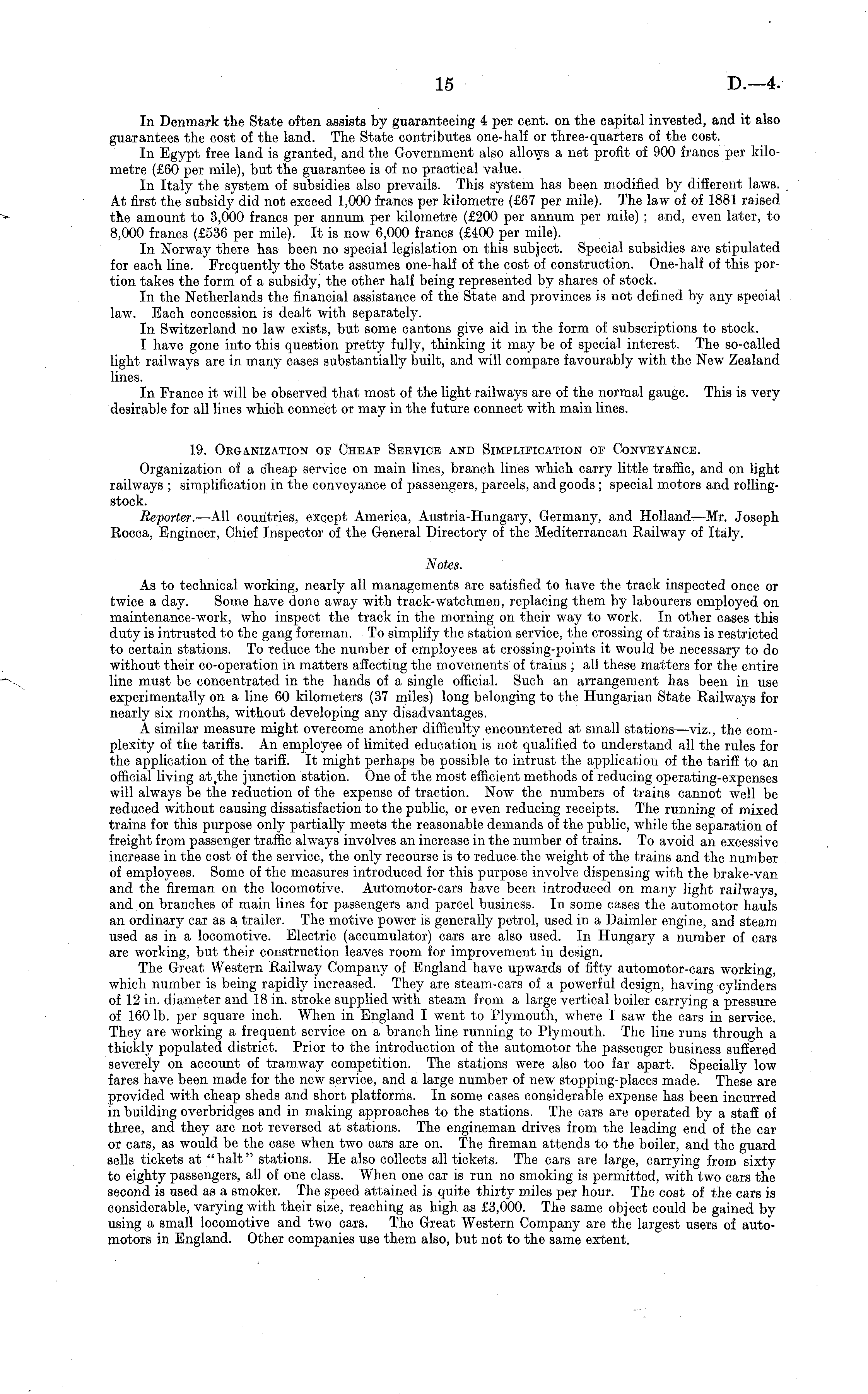 In Denmark the State often assists by guaranteeing 4 per cent, on the capital invested, and it also guarantees the cost of the land. The State contributes one-half or three-quarters of the cost. In Egypt free land is granted, and the Government also allows a net profit of 900 francs per kilometre (£6O per mile), but the guarantee is of no practical value. In Italy the system of subsidies also prevails. This system has been modified by different laws. At first the subsidy did not exceed 1,000 francs per kilometre (£67 per mile). The law of of 1881 raised the amount to 3,000 francs per annum per kilometre (£2OO per annum per mile) ; and, even later, to 8,000 francs (£536 per mile). It is now 6,000 francs (£4OO per mile). In Norway there has been no special legislation on this subject. Special subsidies are stipulated for each line. Frequently the State assumes one-half of the cost of construction. One-half of this portion takes the form of a subsidy, the other half being represented by shares of stock. In the Netherlands the financial assistance of the State and provinces is not defined by any special law. Each concession is dealt with separately. In Switzerland no law exists, but some cantons give aid in the form of subscriptions to stock. I have gone into this question pretty fully, thinking it may be of special interest. The so-called light railways are in many cases substantially built, and will compare favourably with the New Zealand lines. In France it will be observed that most of the light railways are of the normal gauge. This is very desirable for all lines which connect or may in the future connect with main lines. 19. Oeganization of Cheap Sebvice and Simplification of Conveyance. Organization of a cheap service on main lines, branch lines which carry little traffic, and on light railways ; simplification in the conveyance of passengers, parcels, and goods ; special motors and rollingstock. Reporter. —All countries, except America, Austria-Hungary, Germany, and Holland—Mr. Joseph Rocca, Engineer, Chief Inspector of the General Directory of the Mediterranean Railway of Italy. Notes. As to technical working, nearly all managements are satisfied to have the track inspected once or twice a day. Some have done away with track-watchmen, replacing them by labourers employed on maintenance-work, who inspect the track in the morning on their way to work. In other cases this duty is intrusted to the gang foreman. To simplify the station service, the crossing of trains is restricted to certain stations. To reduce the number of employees at crossing-points it would be necessary to do without their co-operation in matters affecting the movements of trains ; all these matters for the entire line must be concentrated in the hands of a single official. Such an arrangement has been in use experimentally on a line 60 kilometers (37 miles) long belonging to the Hungarian State Railways for nearly six months, without developing any disadvantages. A similar measure might overcome another difficulty encountered at small stations—viz., the complexity of the tariffs. An employee of limited education is not qualified to understand all the rules for the application of the tariff. It might perhaps be possible to intrust the application of the tariff to an official living at,the junction station. One of the most efficient methods of reducing operating-expenses will always be the reduction of the expense of traction. Now the numbers of trains cannot well be reduced without causing dissatisfaction to the public, or even reducing receipts. The running of mixed trains for this purpose only partially meets the reasonable demands of the public, while the separation of freight from passenger traffic always involves an increase in the number of trains. To avoid an excessive increase in the cost of the service, the only recourse is to reduce the weight of the trains and the number of employees. Some of the measures introduced for this purpose involve dispensing with the brake-van and the fireman on the locomotive. Automotor-cars have been introduced on many light railways, and on branches of main lines for passengers and parcel business. In some cases the automotor hauls an ordinary car as a trailer. The motive power is generally petrol, used in a Daimler engine, and steam used as in a locomotive. Electric (accumulator) cars are also used. In Hungary a number of cars are working, but their construction leaves room for improvement in design. The Great Western Railway Company of England have upwards of fifty automotor-cars working, which number is being rapidly increased. They are steam-cars of a powerful design, having cylinders of 12 in. diameter and 18 in. stroke supplied with steam from a large vertical boiler carrying a pressure of 160 lb. per square inch. When in England I went to Plymouth, where I saw the cars in service. They are working a frequent service on a branch line running to Plymouth. The line runs through a thickly populated district. Prior to the introduction of the automotor the passenger business suffered severely on account of tramway competition. The stations were also too faT apart. Specially low fares have been made for the new service, and a large number of new stopping-places made. These are provided with cheap sheds and short platforms. In some cases considerable expense has been incurred in building overbridges and in making approaches to the stations. The cars are operated by a staff of three, and they are not reversed at stations. The engineman drives from the leading end of the car or cars, as would be the case when two cars are on. The fireman attends to the boiler, and the guard sells tickets at "halt" stations. He also collects all tickets. The cars are large, carrying from sixty to eighty passengers, all of one class. When one car is run no smoking is permitted, with two cars the second is used as a smoker. The speed attained is quite thirty miles per hour. The cost of 