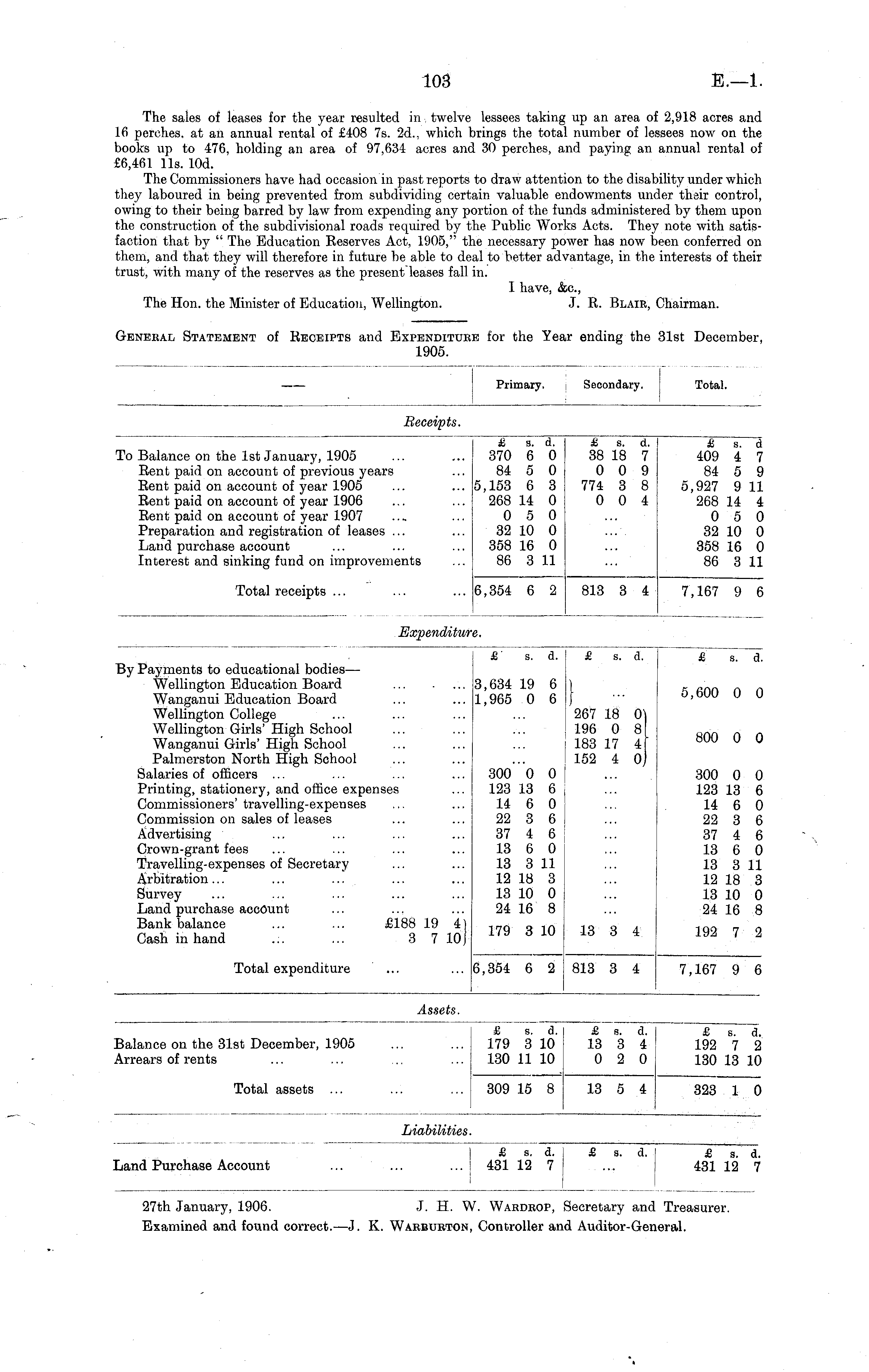 The sales of leases for the year resulted in twelve lessees taking up an area of 2,918 acres and 16 perches, at an annual rental of £408 7s. 2d., which brings the total number of lessees now on the books up to 476, holding an area of 97,634 acres and 30 perches, and paying an annual rental of £6,461 11s. 10d. The Commissioners have had occasion in past reports to draw attention to the disability under which they laboured in being prevented from subdividing certain valuable endowments under their control, owing to their being barred by law from expending any portion of the funds administered by them upon the construction of the subdivisional roads required by the Public Works Acts. They note with satisfaction that by " The Education Reserves Act, 1905," the necessary power has now been conferred on them, and that they will therefore in future be able to deal to better advantage, in the interests of their trust, with many of the reserves aa the present leases fall in. I have, &c, The Hon. the Minister of Education, Wellington. J. R. Blair, Chairman.