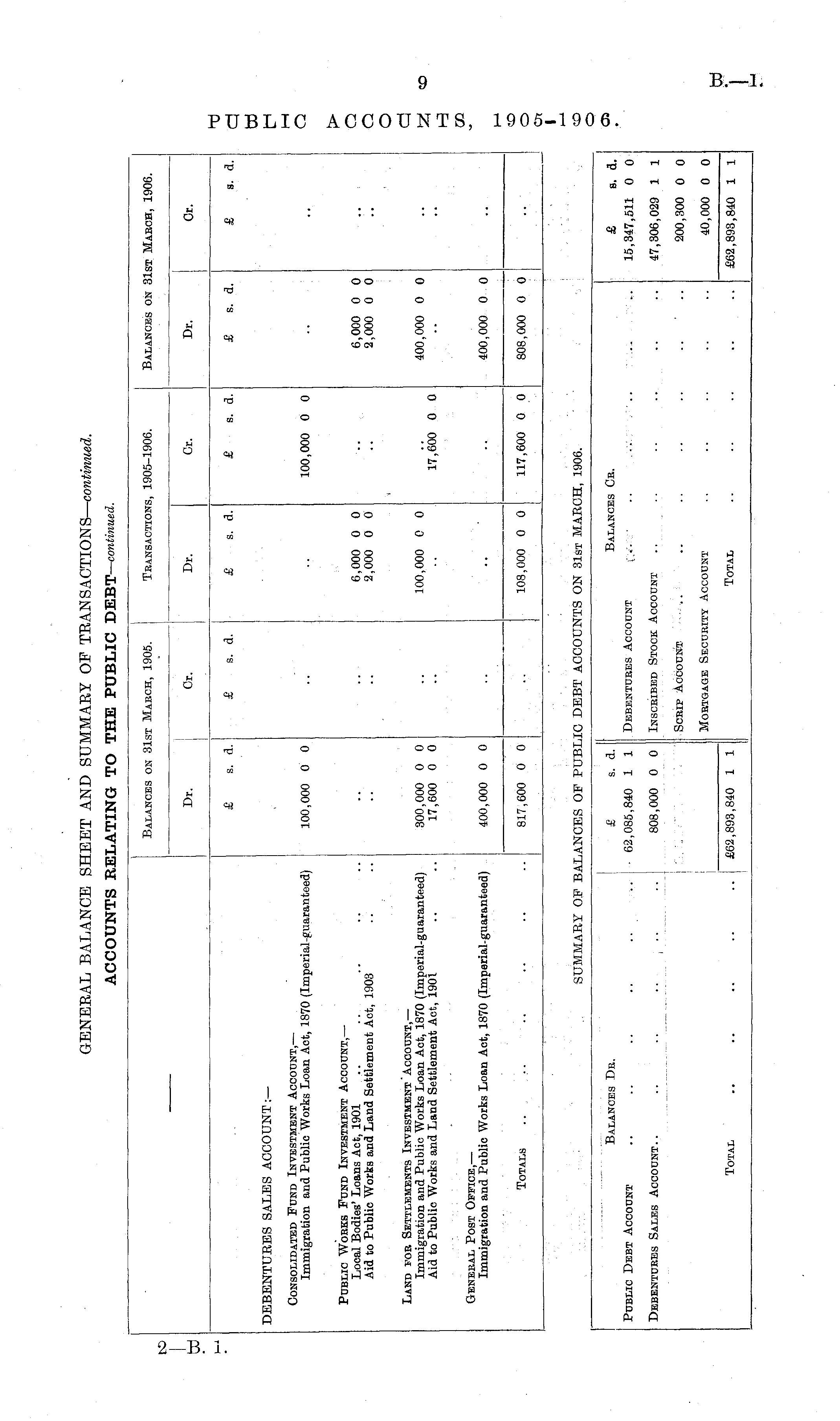 Balances on 31st Mabch, 1905. Tkansactions, 1905-1906. Balances on 31st March, 1906. Dr. Or. Dr. Or. Dr. Or. £ s. d. £ s. d. £ s. d. £ s. d. £ s. d. £ s. d. DEBENTUEBS SALES ACCOUNT:— Consolidated Pond Investment Account, — Immigration and Public Works Loan Act, 1870 (Imperial-guaranteed) 100,000 0 0 100,000 0 0 Public Works Fund Investment Account, — Local Bodies' Loans Act, 1901 Aid to Public Works and Land Settlement Act, 1903 6,000 0 0 2,000 0 0 6,000 0 0 2,000 0 0 Land fob Settlements Investment Account, — Immigration and Public Works Loan Act, 1870 (Imperial-guaranteed) Aid to Public Works and Land Settlement Act, 1901 300,000 0 0 17,600 0 0 100,000 0 0 17,600 0 0 400,000 0 0 General Post Office, — Immigration and Public Works Loan Act, 1870 (Imperial-guaranteed) 400,000 0 0 400,000 0 0 Totals 817,600 0 0 108,000 0 0 117,600 0 0 808,000 0 0 SUMMARY OP BALANCES OP PUB! ,10 DEBT ACCOUNTS ON 31st MAECH, 1906. Balances Dβ. £ s. d. Balances Ce. £ s. a. Public Debt Account Debentures Sales Account.. .. • 62,085,840 1 1 808,000 0 0 Debentures Account (.. ■ 15,347,511 0 0 Inscribed Stock Account 47,306,029 1 1 Scbip Account. 200,300 0 0 Mortgage Security Account 40,000 0 0 Total i £62,893,840 1 1 ! £62,893,840 1 1 Total £62,893,840 1 1