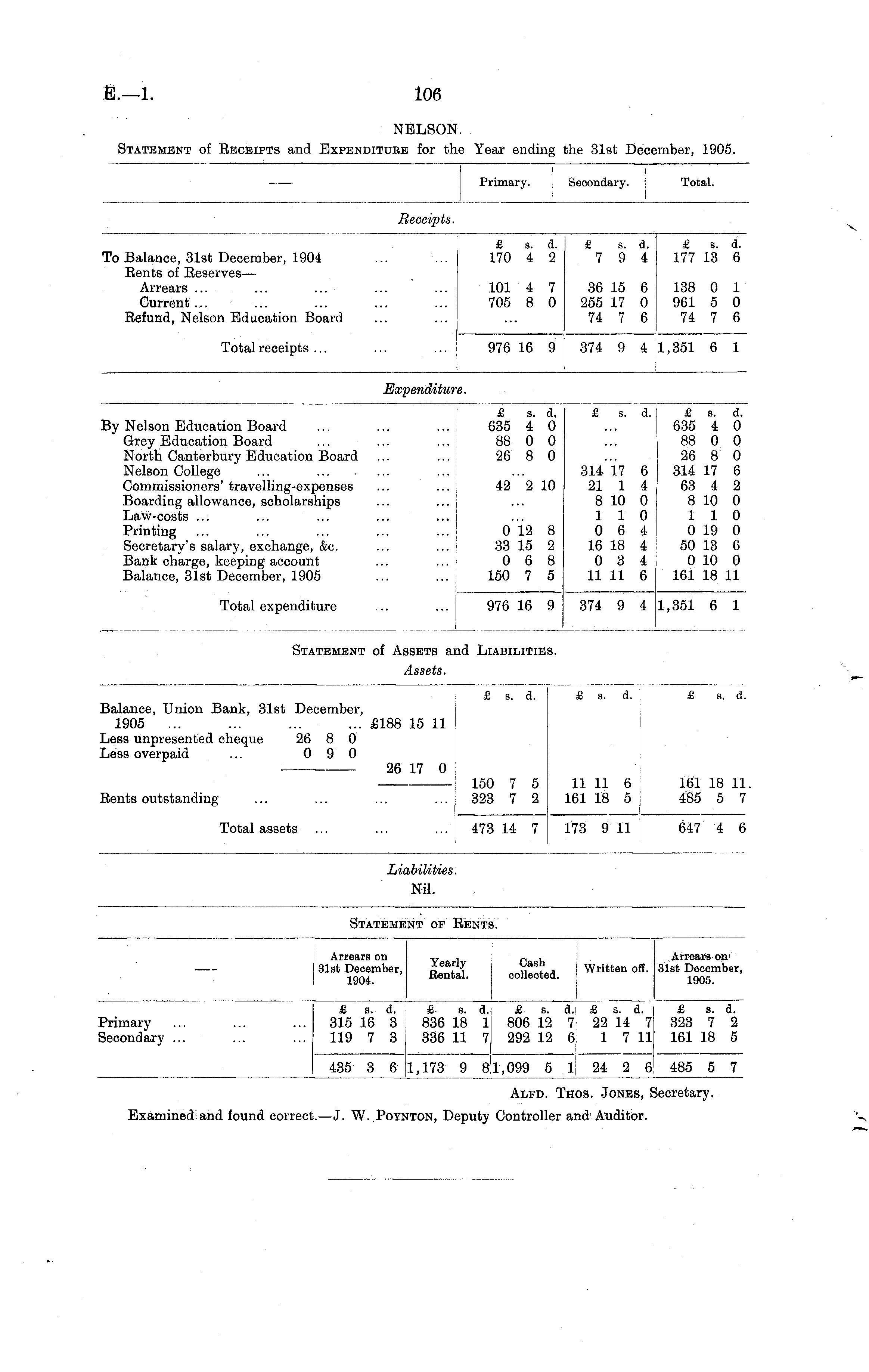 Alfd. Thos. Jones, Secretary. Examined and found correct.— J. W. Poynton, Deputy Controller and Auditor.