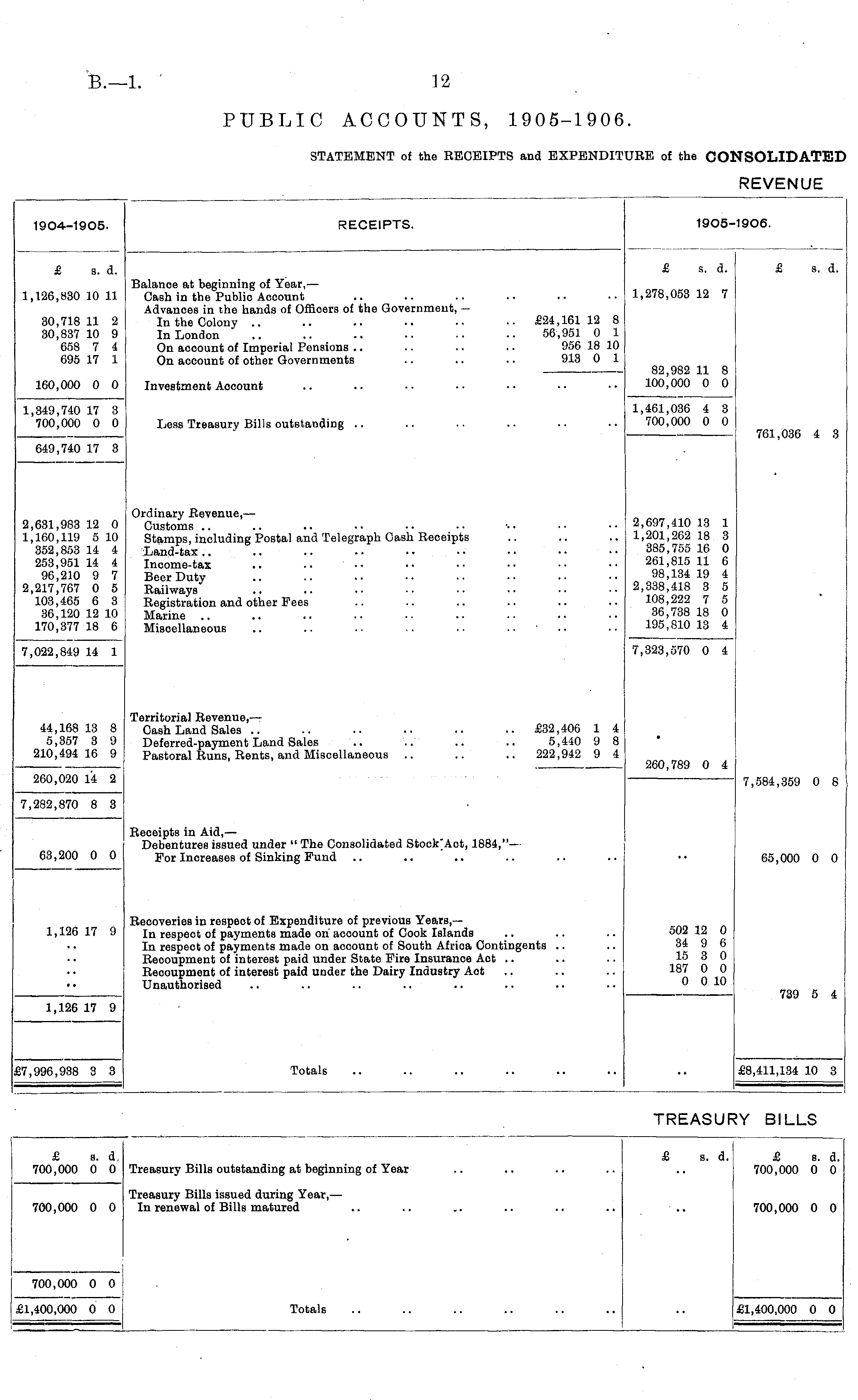 REVENUE 1904--1905. RECEIPTS. 1905-1906. £ s. d. £ s. d. £ s. d. 1,126,830 10 11 30,718 11 2 30,837 10 9 658 7 4 695 17 1 Balance at beginning of Year, — Cash in the Public Account Advances in the hands of Officers of the Government, - IntheColony £24,16112 8 In London .. .. .. .. •• •• 56,951 0 1 On acoount of Imperial Pensions .. .. .. -. 956 18 10 On account of other Governments .. . • . • 913 0 1 1,278,053 12 7 82,982 11 8 100,000 0 0 160,000 0 0 Investment Account 1,349,740 17 3 700,000 0 0 Less Treasury Bills outstanding 1,461,036 4 3 700,000 0 0 761,036 4 3 649,740 17 3 2,631,983 12 0 1,160,119 5 10 352,853 14 4 253,951 14 4 96,210 9 7 2,217,767 0 5 103,465 6 3 36,120 12 10 170,377 18 6 Ordinary Revenue, — Customs Stamps, including Postal and Telegraph Cash Receipts Land-tax Income-tax Beer Duty Railways Registration and other Pees Marine Miscellaneous .. .. •. . • .. 2,697,410 13 1 1,201,262 18 3 385,755 16 0 261,815 11 6 98,134 19 4 2,338,418 3 5 108,222 7 5 36,738 18 0 195,810 13 4 7,022,849 14 1 7,323,570 0 4 Territorial Revenue, — Cash Land Sales .. .. .. .. .. .. £32,406 1 4 Deferred-payment Land Sales .. .. .. .. 5,440 9 8 Pastoral Runs, Rents, and Miscellaneous .. .. .. 222,942 9 4 • 44,168 13 8 5,357 3 9 210,494 16 9 260,789 0 4 260,020 14 2 7,584,359 0 8 7,282,870 8 3 63,200 0 0 Receipts in Aid, — Debentures issued under " The Consolidated Stock"Act, 1884," — For Inoreases of Sinking Fund 65,000 0 0 1,126 17 9 Recoveries in respect of Expenditure of previous Years,— In respeot of payments made on account of Cook Islands In respeot of payments made on account of South Africa Contingents Recoupment of interest paid under State Fire Insurance Aot Recoupment of interest paid under the Dairy Industry Aot Unauthorised 502 12 0 34 9 6 15 3 0 187 0 0 0 0 10 1,126 17 9 739 5 4 Totals 57,996,938 3 3 £8,411,134 10 3 TREASU :y BILLS £ s. d, 700,000 0 0 Treasury Bills outstanding at beginning of Year £ s. d. £ s. d. 700,000 0 0 700,000 0 0 Treasury Bills issued during Year, — In renewal of Bills matured 700,000 0 0 700,000 0 0 Totals £1,400,000 0 0 £1,400,000 0 0