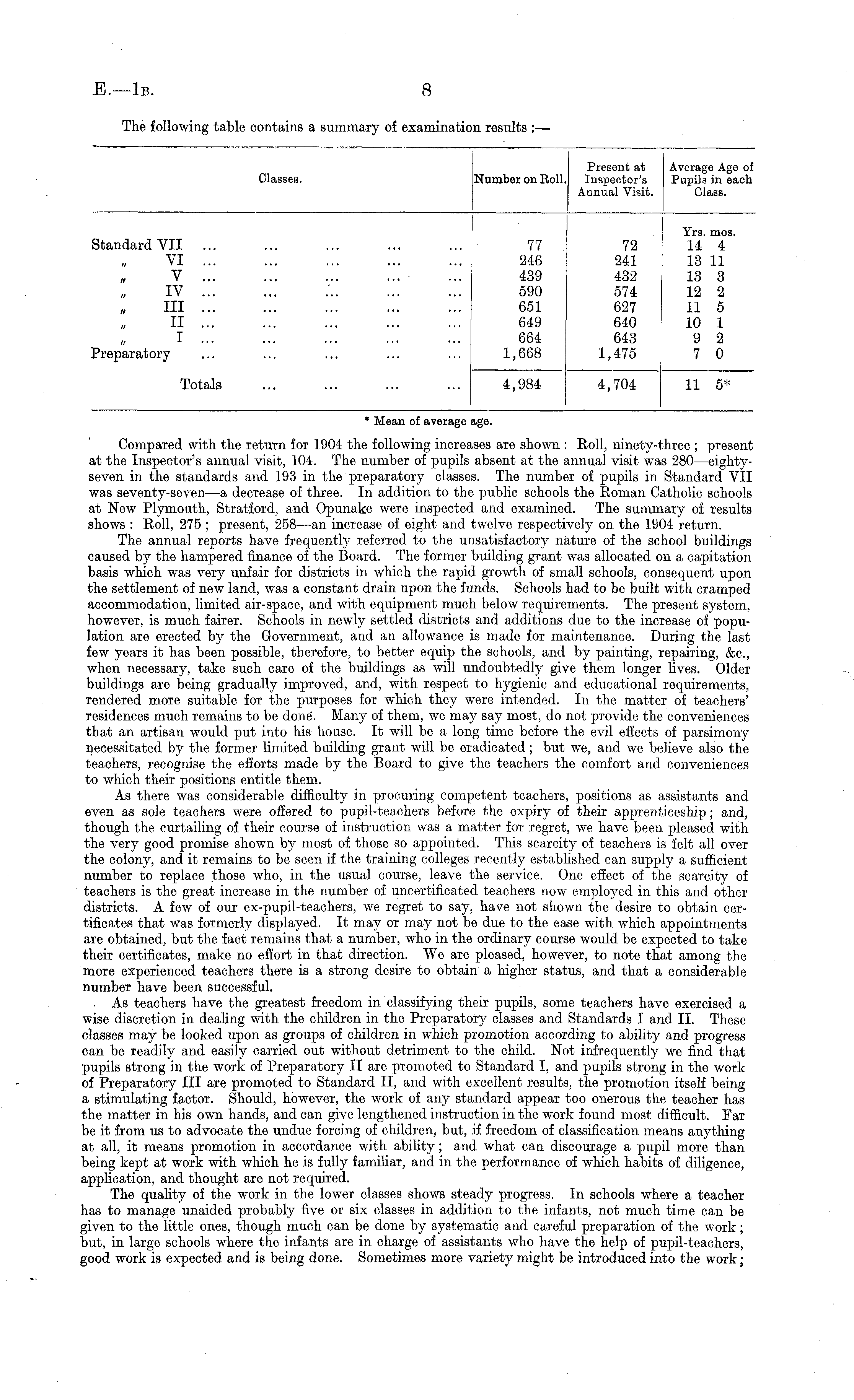 Compared with the return for 1904 the following increases are shown : Roll, ninety-three ; present at the Inspector's annual visit, 104. The number of pupils absent at the annual visit was 280—eightyseven in the standards and 193 in the preparatory classes. The number of pupils in Standard VII was seventy-seven —a decrease of three. In addition to the public schools the Roman Catholic schools at New Plymouth, Stratford, and Opunake were inspected and examined. The summary of results shows : Roll, 275 ; present, 258—an increase of eight and twelve respectively on the 1904 return. The annual reports have frequently referred to the unsatisfactory nature of the school buildings caused by the hampered finance of the Board. The former building grant was allocated on a capitation basis which was very unfair for districts in which the rapid growth of small schools, consequent upon the settlement of new land, was a constant drain upon the funds. Schools had to be built with cramped accommodation, limited air-space, and with equipment much below requirements. The present system, however, is much fairer. Schools in newly settled districts and additions due to the increase of population are erected by the Government, and an allowance is made for maintenance. During the last few years it has been possible, therefore, to better equip the schools, and by painting, repairing, &c, when necessary, take such care of the buildings as will undoubtedly give them longer lives. Older buildings are being gradually improved, and, with respect to hygienic and educational requirements, rendered more suitable for the purposes for which they were intended. In the matter of teachers' residences much remains to be done. Many of them, we may say most, do not provide the conveniences that an artisan would put into his house. It will be a long time before the evil effects of parsimony necessitated by the former limited building grant will be eradicated ; but we, and we believe also the teachers, recognise the efforts made by the Board to give the teachers the comfort and conveniences to which their positions entitle them. As there was considerable difficulty in procuring competent teachers, positions as assistants and even as sole teachers were offered to pupil-teachers before the expiry of their apprenticeship; and, though the curtailing of their course of instruction was a matter for regret, we have been pleased with the very good promise shown by most of those so appointed. This scarcity of teachers is felt all over the colony, and it remains to be seen if the training colleges recently established can supply a sufficient number to replace those who, in the usual course, leave the service. One effect of the scarcity of teachers is the great increase in the number of uncertificated teachers now employed in this and other districts. A few of our ex-pupil-teachers, we regret to say, have not shown the desire to obtain certificates that was formerly displayed. It may or may not be due to the ease with which appointments are obtained, but the fact remains that a number, who in the ordinary course would be expected to take their certificates, make no effort in that direction. We are pleased, however, to note that among the more experienced teachers there is a strong desire to obtain a higher status, and that a considerable number have been successful. . As teachers have the greatest freedom in classifying their pupils, some teachers have exercised a wise discretion in dealing with the children in the Preparatory classes and Standards I and 11. These classes may be looked upon as groups of children in which promotion according to ability and progress can be readily and easily carried out without detriment to the child. Not infrequently we find that pupils strong in the work of Preparatory II are promoted to Standard I, and pupils strong in the work of Preparatory 111 are promoted to Standard 11, and with excellent results, the promotion itself being a stimulating factor. Should, however, the work of any standard appear too onerous the teacher has the matter in his own hands, and can give lengthened instruction in the work found most difficult. Far be it from us to advocate the undue forcing of children, but, if freedom of classification means anything at all, it means promotion in accordance with ability; and what can discourage a pupil more than being kept at work with which he is fully familiar, and in the performance of which habits of diligence, application, and thought are not required. The quality of the work in the lower classes shows steady progress. In schools where a teacher has to manage unaided probably five or six classes in addition to the infants, not much time can be given to the little ones, though much can be done by systematic and caTeful preparation of the work; but, in large schools where the infants are in charge of assistants who have the help of pupil-teachers, good work is expected and is being done. Sometimes more variety might be introduced into the work;
