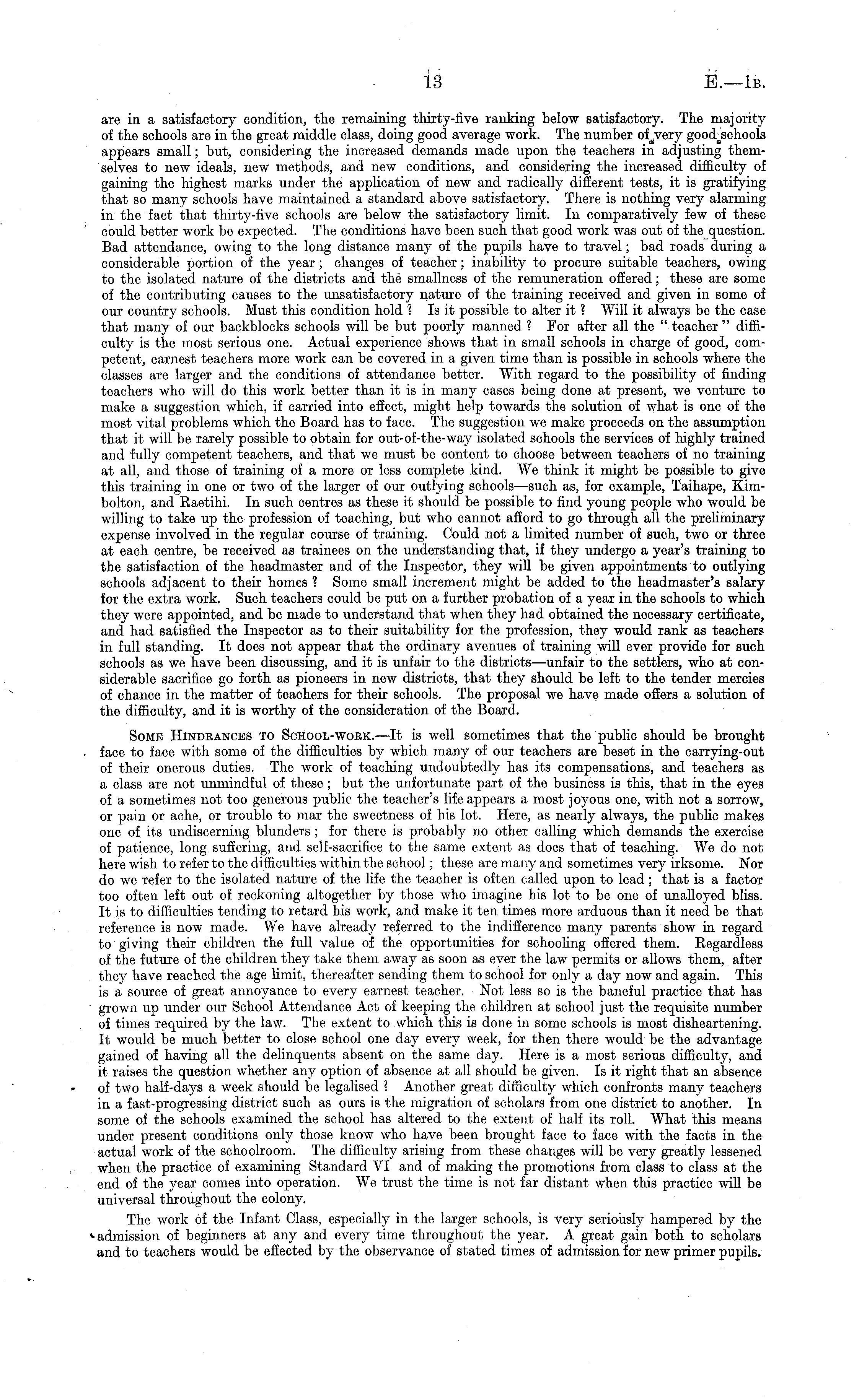 are in a satisfactory condition, the remaining thirty-five ranking below satisfactory. The majority of the schools are in the great middle class, doing good average work. The number appears small; but, considering the increased demands made upon the teachers in adjusting themselves to new ideals, new methods, and new conditions, and considering the increased difficulty of gaining the highest marks under the application of new and radically different tests, it is gratifying that so many schools have maintained a standard above satisfactory. There is nothing very alarming in the fact that thirty-five schools are below the satisfactory limit. In comparatively few of these could better work be expected. The conditions have been such that good work was out of the question. Bad attendance, owing to the long distance many of the pupils have to travel; bad roads during a considerable portion of the year; changes of teacher; inability to procure suitable teachers, owing to the isolated nature of the districts and the smallness of the remuneration offered; these are some of the contributing causes to the unsatisfactory nature of the training received and given in some of our country schools. Must this condition hold ? Is it possible to alter it ? Will it always be the case that many of our backblocks schools will be but poorly manned ? For after all the " teacher " difficulty is the most serious one. Actual experience shows that in small schools in charge of good, competent, earnest teachers more work can be covered in a given time than is possible in schools where the classes are larger and the conditions of attendance better. With regard to the possibility of finding teachers who will do this work better than it is in many cases being done at present, we venture to make a suggestion which, if carried into effect, might help towards the solution of what is one of the most vital problems which the Board has to face. The suggestion we make proceeds on the assumption that it will be rarely possible to obtain for out-of-the-way isolated schools the services of highly trained and fully competent teachers, and that we must be content to choose between teachers of no training at all, and those of training of a more or less complete kind. We think it might be possible to give this training in one or two of the larger of our outlying schools —such as, for example, Taihape, Kimbolton, and Raetihi. In such centres as these it should be possible to find young people who would be willing to take up the profession of teaching, but who cannot afford to go through all the preliminary expense involved in the regular course of training. Could not a limited number of such, two or three at each centre, be received as trainees on the understanding that, if they undergo a year's training to the satisfaction of the headmaster and of the Inspector, they will be given appointments to outlying schools adjacent to their homes ? Some small increment might be added to the headmaster's salary for the extra work. Such teachers could be put on a further probation of a year in the schools to which they were appointed, and be made to understand that when they had obtained the necessary certificate, and had satisfied the Inspector as to their suitability for the profession, they would rank as teachers in full standing. It does not appear that the ordinary avenues of training will ever provide for such schools as we have been discussing, and it is unfair to the districts—unfair to the settlers, who at considerable sacrifice go forth as pioneers in new districts, that they should be left to the tender mercies of chance in the matter of teachers for their schools. The proposal we have made offers a solution of the difficulty, and it is worthy of the consideration of the Board. Some Hindrances to School-work. —It is well sometimes that the public should be brought face to face with some of the difficulties by which many of our teachers are beset in the carrying-out of their onerous duties. The work of teaching undoubtedly has its compensations, and teachers as a class are not unmindful of these ; but the unfortunate part of the business is this, that in the eyes of a sometimes not too generous public the teacher's life appears a most joyous one, with not a sorrow, or pain or ache, or trouble to mar the sweetness of his lot. Here, as nearly always, the public makes one of its undiscerning blunders ; for there is probably no other calling which demands the exercise of patience, long suffering, and self-sacrifice to the same extent as does that of teaching. We do not here wish to refer to the difficulties within the school; these are many and sometimes very irksome. Nor do we refer to the isolated nature of the life the teacher is often called upon to lead; that is a factor too often left out of reckoning altogether by those who imagine his lot to be one of unalloyed bliss. It is to difficulties tending to retard his work, and make it ten times more arduous than it need be that reference is now made. We have already referred to the indifference many parents show in regard to giving their children the full value of the opportunities for schooling offered them. Regardless of the future of the children they take them away as soon as ever the law permits or allows them, after they have reached the age limit, thereafter sending them to school for only a day now and again. This is a source of great annoyance to every earnest teacher. Not less so is the baneful practice that has grown up under our School Attendance Act of keeping the children at school just the requisite number of times required by the law. The extent to which this is done in some schools is most disheartening. It would be much better to close school one day every week, for then there would be the advantage gained of having all the delinquents absent on the same day. Here is a most serious difficulty, and it raises the question whether any option of absence at all should 