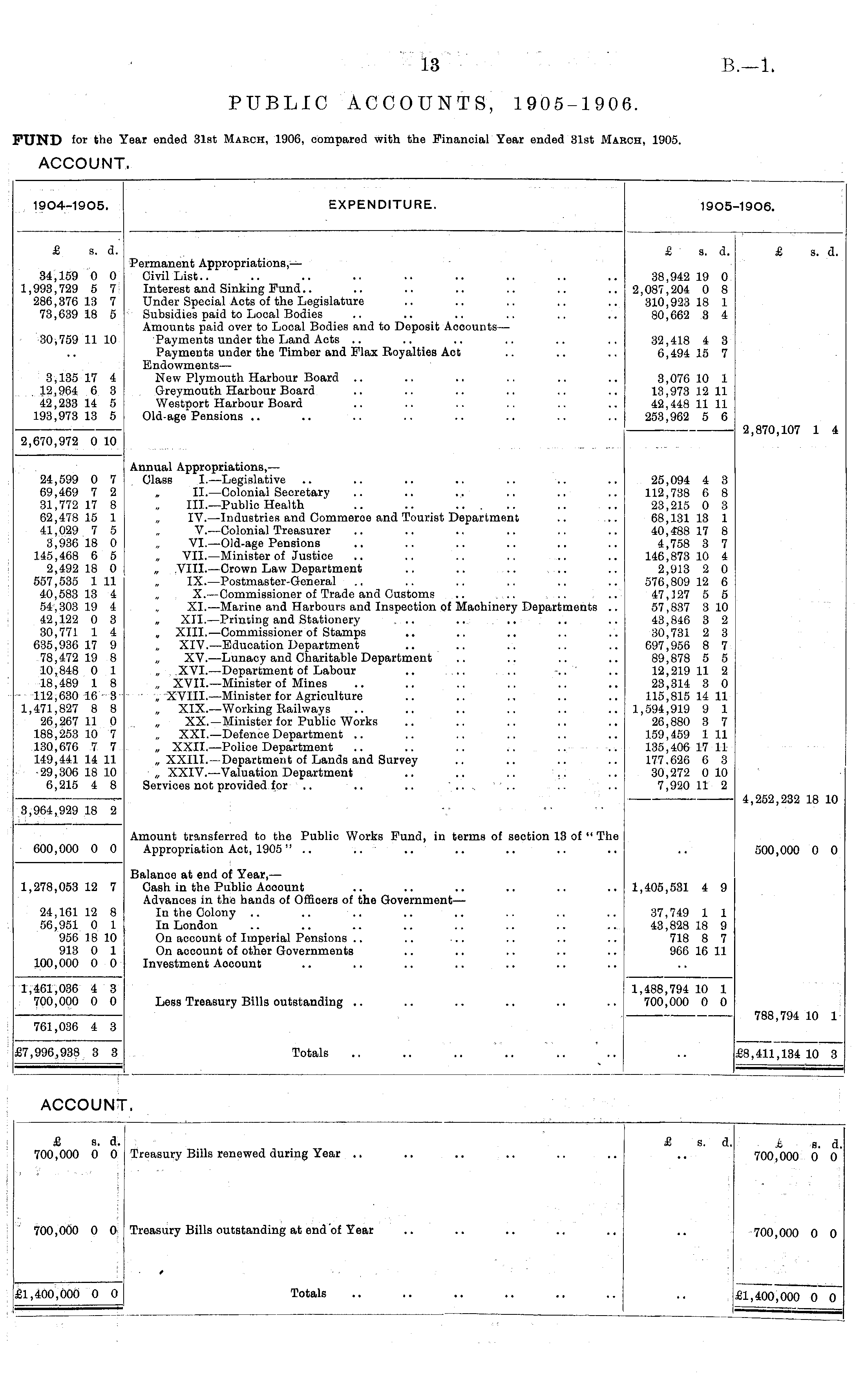 ACCOUNT. 1904-1905. EXPENDITURE. 1905-1906. £ s. d. £ s. d. £ s. d. 34,159 0 0 1,993,729 5 7 286,376 13 7 73,639 18 5 30,759 11 10 Permanent Appropriations,— Civil List Interest and Sinking Fund Under Special Acts of the Legislature Subsidies paid to Local Bodies Amounts paid over to Local Bodies and to Deposit Acoounts— Payments under the Land Acts Payments under the Timber and Flax Royalties Act Endowments— New Plymouth Harbour Board Greymouth Harbour Board Westport Harbour Board Old-age Pensions 38,942 19 0 2,087,204 0 8 310,923 18 1 80,662 3 4 32,418 4 3 6,494 15 7 3,135 17 4 12,964 6 3 42,233 14 5 193,973 13 5 3,076 10 1 13,973 12 11 42,448 11 11 253,962 5 6 2,870,107 1 4 2,670,972 0 10 24,599 0 7 69,469 7 2 31,772 17 8 62,478 15 1 41,029 7 5 3,936 18 0 145,468 6 5 2,492 18 0 557,535 1 11 40,583 13 4 54,303 19 4 42,122 0 3 30,771 1 4 635,936 17 9 78,472 19 8 10,848 0 1 18,489 1 8 112,630 16 3 1,471,827 8 8 26,267 11 0 188,253 10 7 130,676 7 7 149,441 14 11 29,306 18 10 6,215 4 8 Annual Appropriations,— Class I.—Legislative II.—Colonial Secretary III.—Public Health .. .. IV.—Industries and Commeroe and Tourist Department V.—Colonial Treasurer VI.—Old-age Pensions VII.—Minister of Justice „ VIII. —Crown Law Department IX.—Postmaster-General X. —Commissioner of Trade and Customs .. XL—Marine and Harbours and Inspection of Maohinery Departments .. „ XII. —Printing and Stationery ... .. .. „ XIII.—Commissioner of Stamps XIV. —Education Department „ XV.—Lunacy and Charitable Department XVI. —Department of Labour .. .... ... «•..'" „ XVII.—Minister of Mines „ XVIII. —Minister for Agriculture „ XIX.—Working Railways XX. —Minister for Public Works XXI.—Defence Department .. „ XXII. —Police Department „ XXIII.—Department of Lands and Survey „ XXIV. —Valuation Department .. .. .. .. Services not provided for .. .. ...... 25,094 4 3 112,738 6 8 23,215 0 3 68,131 13 1 40,488 17 8 4,758 3 7 146,873 10 4 2,913 2 0 576,809 12 6 47,127 5 5 57,837 3 10 43,846 3 2 30,731 2 3 697,956 8 7 89,878 5 5 12,219 11 2 23,314 3 0 115,815 14 11 1,594,919 9 1 26,880 3 7 159,459 1 11 135,406 17 11 177.626 6 3 30,272 0 10 7,920 11 2 3,964,929 18 2 4,252,232 18 10 600,000 0 0 Amount transferred to the Public Works Fund, in terms of section 13 of " The Appropriation Act, 1905 " .. 500,000 0 0 1,278,053 12 7 24,161 12 8 56,951 0 1 956 18 10 913 0 1 100,000 0 0 Balance at end of Year, — Cash in the Public Account Advances in the hands of Officers of the Government— In the Colony In London .. .. .. .. .. .. On account of Imperial Pensions On account of other Governments Investment Aocount 1,405,531 4 9 37,749 1 1 43,828 18 9 718 8 7 966 16 11 1,461,036 4 3 700,000 0 0 Less Treasury Bills outstanding 1,488,794 10 1 700,000 0 0 788,794 10 1 761,036 4 3 £8,411,134 10 3 !7,996,938 3 3 Totals ACCOUN" & s. d. 700,000 0 0 Treasury Bills renewed during Year .. £ s. d. 1 s. d. 700,000 0 0 700,000 0 0 Treasury Bills outstanding at end of Year 700,000 0 0 / !1,400,000 0 0 Totals |£1,400,000 0 0