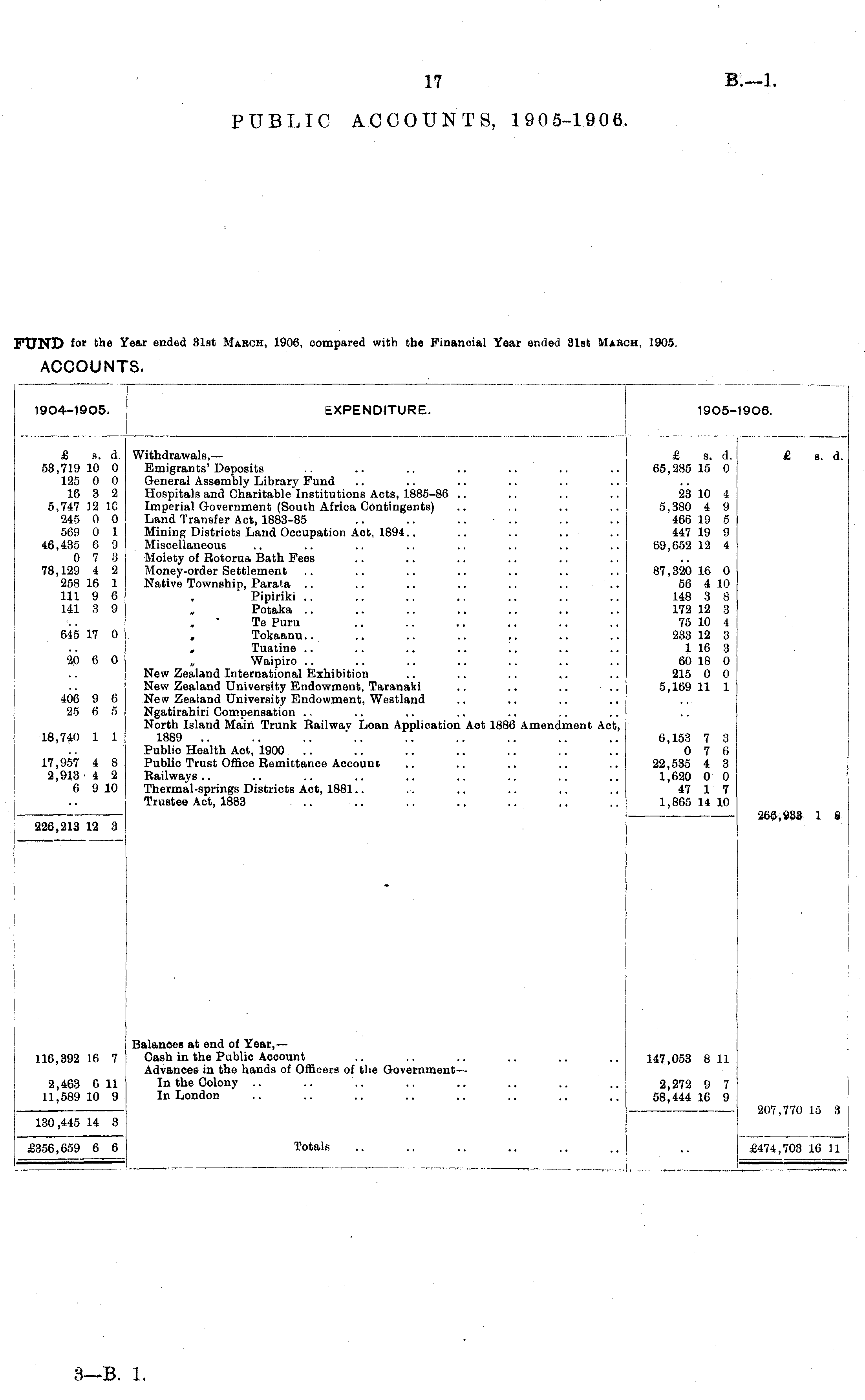 1904-1905. EXPENDITURE. 1905906. £ s. d. 53,719 10 0 125 0 0 16 3 2 5,747 12 1C 245 0 0 569 0 1 46,435 6 9 0 7 3 78,129 4 2 258 16 1 111 9 6 141 3 9 645 17 0 20 6 O Withdrawals, — Emigrants' Deposits General Assembly Library Fund Hospitals and Charitable Institutions Acts, 1885-86 Imperial Government (South Africa Contingents) Land Transfer Act, 1883-85 .. .. .. Mining Districts Land Occupation Act, 1894.. Miscellaneous Moiety of Rotorua Bath Fees Money-order Settlement Native Townfihip, Parata Pipiriki .. „ Potaka .. Te Puru » Tokaanu Tuatine Waipiro New Zealand International Exhibition New Zealand University Endowment, Taranaki .. .. .. ■ .. New Zealand University Endowment, Westland Ngatirahiri Compensation North Island Main Trunk Railway Loan Application Act 1886 Amendment Act, 1889 .. Public Health Aot, 1900 Public Trust Office Remittance Account Railways Thermal-springs Districts Act, 1881 Trustee Act, 1883 - .. £ s. d. 65,285 15 0 23 10 4 5,380 4 9 466 19 5 447 19 9 69,652 12 4 87,320 16 0 56 4 10 148 3 8 172 12 3 75 10 4 233 12 3 1 16 3 60 18 0 215 0 0 5,169 11 1 £ s. d. 406 9 6 25 6 5 18,740 1 1 17,957 4 8 2,913- 4 2 6 9 10 6,153 7 3 0 7 6 22,535 4 3 1,620 0 0 47 1 7 1,865 14 10 266,983 1 226,213 12 3 116,392 16 7 2,463 6 11 11,589 10 9 Balanoes at end of Year, — Cash in the Public Account Advances in the hands of Officers of the Government— In the Colony .. .. .. .. .. In London 147,053 8 11 2,272 9 7 58,444 16 9 207,770 15 3 130,445 14 3 Totals £474,703 16 11 £356,659 6 6