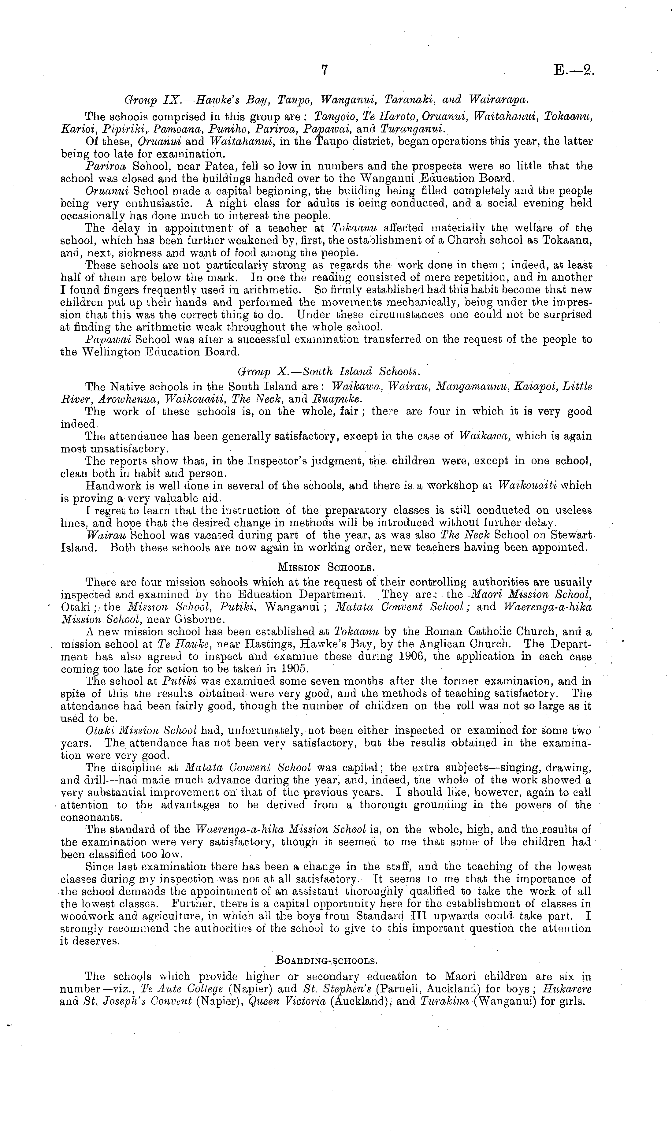 Group IX. — Hawke's Bay, Taupo, Wanganui, Taranaki, and Wairarapa. The schools comprised in this group are : Tangoio, Te Haroto, Oruanui, Waitahanui, Tokaanu, Karioi, Pipiriki, Pamoana, Puniho, Pariroa, Papawai, and Turanganui. Of these, Oruanui and Waitahanui, in the Taupo district, began operations this year, the latter being too late for examination. Pariroa School, near Patea, fell so low in numbers and the prospects were so little that the school was closed and the buildings handed over to the Wanganui Education Board. Oruanui School made a capital beginning, the building being filled completely and the people being very enthusiastic. A night class for adults is being conducted, and a social evening held occasionally has done much to interest the people. . . The delay in appointment of a teacher at Tokaanu affected materially the welfare of the school, which has been further weakened by, first, the establishment of a Church school as Tokaanu, and, next, sickness and want of food among the people. These schools are not particularly strong as regards the work done in them ; indeed, at least half of them are below the mark. In one the reading consisted of mere repetition, and in another I found fingers frequently used in arithmetic. So firmly established had this habit become that new children put up their hands and performed the movements mechanically, being under the impression that this was the correct thing to do. Under these circumstances one could not be surprised at finding the arithmetic weak throughout the whole school. Papawai School was after a successful examination transferred on the request of the people to the Wellington Education Board. Group X. — South Island Schools. The Native schools in the South Island are : Waikawa, Wairau, Mangamaunu, Kaiapoi, Little Biver, Arowhenua, Waikouaiti, The Neck, and Buapuke. The work of these schools is, on the whole, fair ; there are four in which it is very good indeed. The attendance has been generally satisfactory, except in the case of Waikawa, which is again most unsatisfactory. The reports show that, in the Inspector's judgment, the. children were, except in one school, clean both in habit and person. Handwork is well done in several of the schools, and there is a workshop at Waikouaiti which is proving a very valuable aid. I regret to learn that the instruction of the preparatory classes is still conducted on useless lines,, and hope that the desired change in methods will be introduced without further delay. Wairau School was vacated during part of the year, as was also The Neck School on Stewart Island. Both these schools are now again in working order, new teachers having been appointed. Mission Schools. There are four mission schools which at the request of their controlling authorities are usually inspected and examined by the Education Department. They are: the Maori Mission School, Otaki; the Mission School, Putiki, Wanganui; Matata Convent School; and Waerenga-a-hika Mission School, near Gisborne. A new mission school has been established at Tokaanu by the Boman Catholic Church, and a mission school at Te Hauke, near Hastings, Hawke's Bay, by the Anglican Church. The Department has also agreed to inspect and examine these during 1906, the application in each case coming too late for action to be taken in 1905. The school at Putiki was examined some seven months after the former examination, and in spite of this the results obtained were very good, and the methods of teaching satisfactory. The attendance had been fairly good, though the number of children on the roll was not so large as it used to be. Otaki Mission School had, unfortunately, not been either inspected or examined for some two years. The attendance has not been very satisfactory, but the results obtained in the examination were very good. The discipline at Matata Convent School was capital; the extra subjects—singing, drawing, and drill—had made much advance during the year, and, indeed, the whole of the work showed a very substantial improvement on that of the previous years. I should like, however, again to call attention to the advantages to be derived from a thorough grounding in the powers of the consonants. The standard of the Waerenga-a-hika Mission School is, on the whole, high, and the results of the examination were very satisfactory, though it seemed to me that some of the children had been classified too low. Since last examination there has been a change in the staff, and the teaching of the lowest classes during my inspection was not at all satisfactory. It seems to me that the importance of the school demands the appointment of an assistant thoroughly qualified to take the work of ail the lowest classes. Further, there is a capital opportunity here for the establishment of classes in woodwork and agriculture, in which all the boys from Standard 111 upwards could take part. I strongly recommend the authorities of the school to give to this important question the attention it deserves. BOAEDING-SCHOOLS. The schools which provide higher or secondary education to Maori children are six in number—viz., Te Aute College (Napier) and St. Stephen's (Parnell, Auckland) for boys ; Hukarere and St. Joseph's Convent (Napier), Queen Victoria (Auckland), and Turakina (Wanganui) for girls.