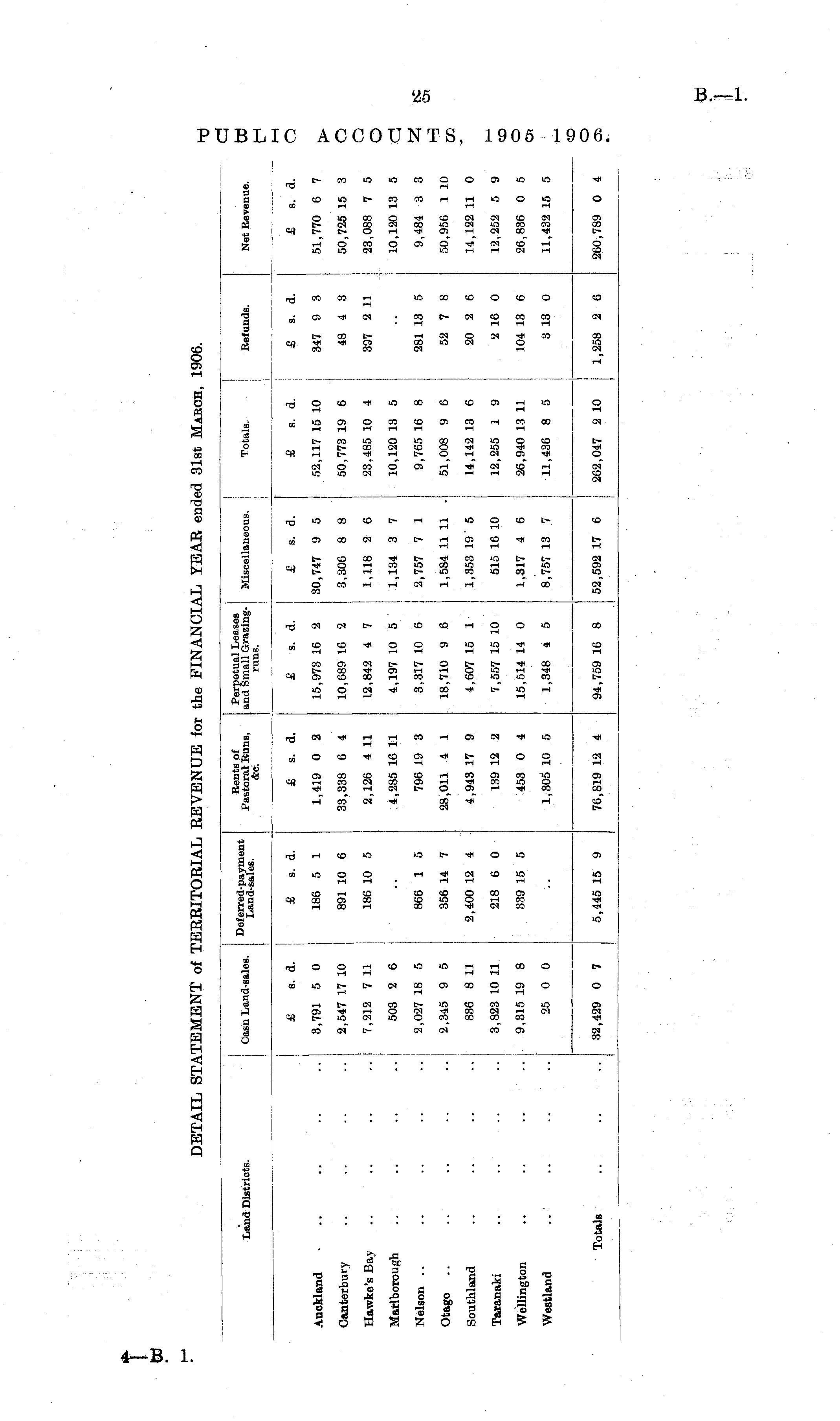 Bents of Pastoral Buns, Perpetual Leases and Small Grazingruns. Totals. Befunds. Land Districts. Caen Land-sales. Deferred-payment Land-sales. Miscellaneous. Net Bevenue. j £ s. d. j £ s. d. £ s. d. £ s. d. £ s. d. £ s. d. £ s. d. £ s. d. Auckland Canterbury 3,791 5 0 2,547 17 10 i I 186 5 1 891 10 6 1,419 0 2 33,338 6 4 15,973 16 2 10,689 16 2 30,747 9 5 3,306 8 8 52,117 15 10 50,773 19 6 23,485 10 i 10,120 13 5 347 9 3 48 4 3 397 2 11 51,770 6 7 50,725 15 3 Hawke's Bay f 7,212 7 11 186 10 5 2,126 4 11 12,842 4 7 1,118 2 6 23,088 7 5 Marlborough 503 2 6 4,285 16 11 4,197 10 5 1,134 3 1 10,120 13 5 Nelson .. 2,027 18 5 866 1 5 796 19 3 28,011 4 1 3,317 10 6 2,757 7 1 9,765 16 8 51,008 9 6 J 281 13 5 52 7 8 9,484 3 3 Otago 2,345 9 5 356 14 7 18,710 9 6 1,584 11 11 50,956 1 10 I 4,943 17 9 4,607 15 1 1,353 19' 5 14,122 11 0 Southland 836 8 11 2,400 12 4 14,142 13 6 20 2 6 Taranaki 3,823 10 11 218 6 0 139 12 2 7,557 15 10 515 16 10 12,255 1 9 2 16 0 12,252 5 9 Wellington 9,315 19 8 339 15 5 453 0 4 15,514 14 0 1,317 4 6 26,940 13 11 104 13 6 26,836 0 5 Westland 25 0 0 1,305 10 5 1,348 4 5 8,757 13 7 11,436 8 5 3 13 0 11,432 15 5 Totals 262,047 2 10 1,258 2 6 260,789 0 4 32,429 0 7 5,445 15 9 76,819 12 4 94,759 16 8 52,592 17 6